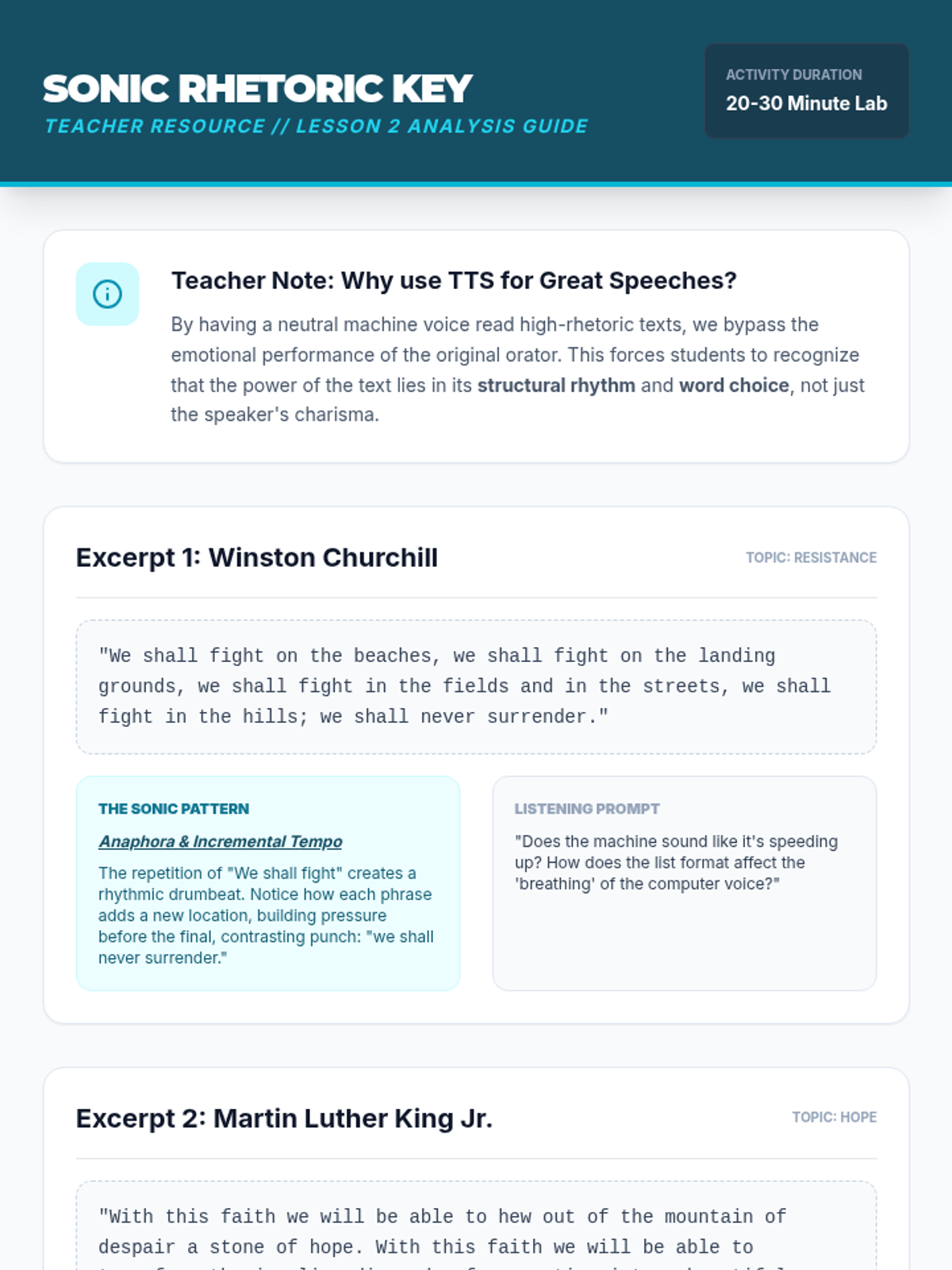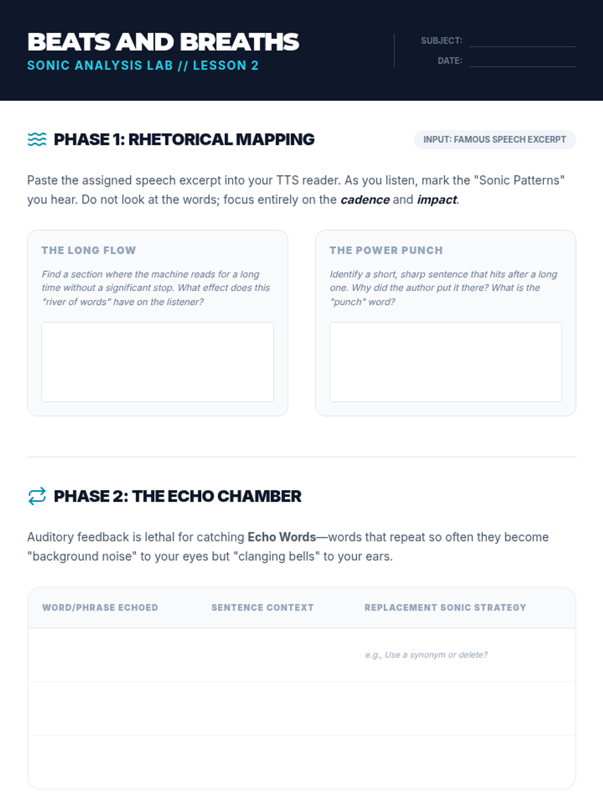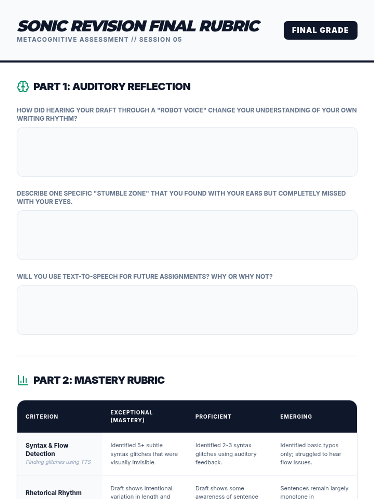 A 12th-grade sequence exploring the transformative power of Text-to-Speech (TTS) as a tool for writing revision, rhetorical analysis, and research management. Students move from basic error detection to analyzing the rhythm of their own persuasive prose.