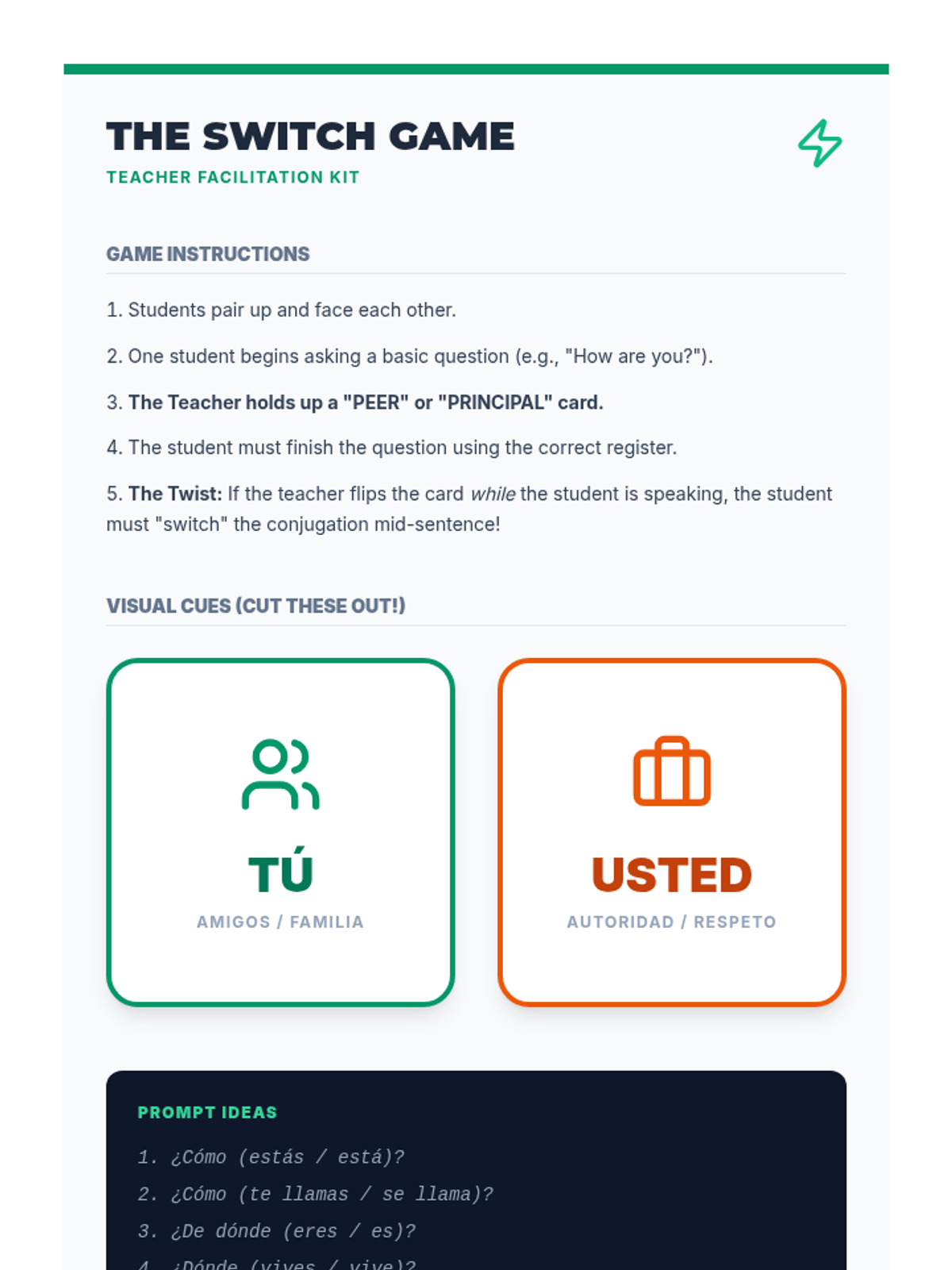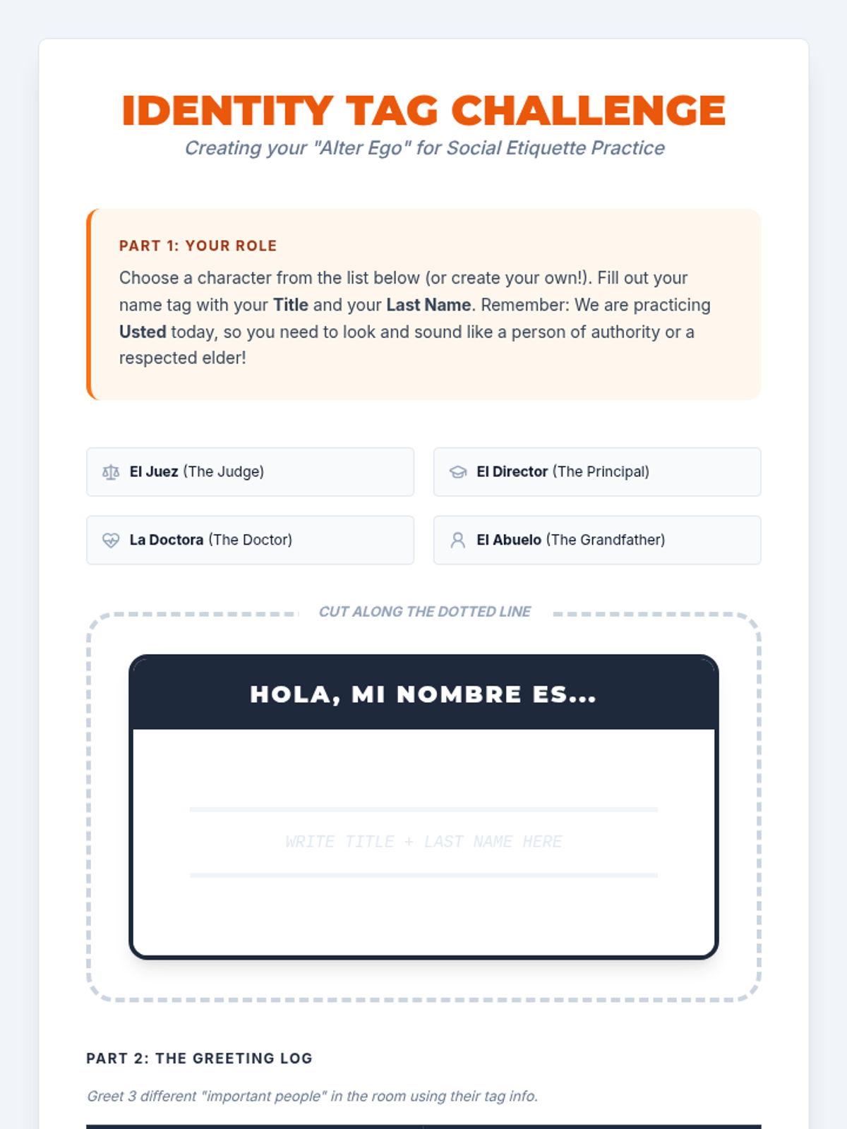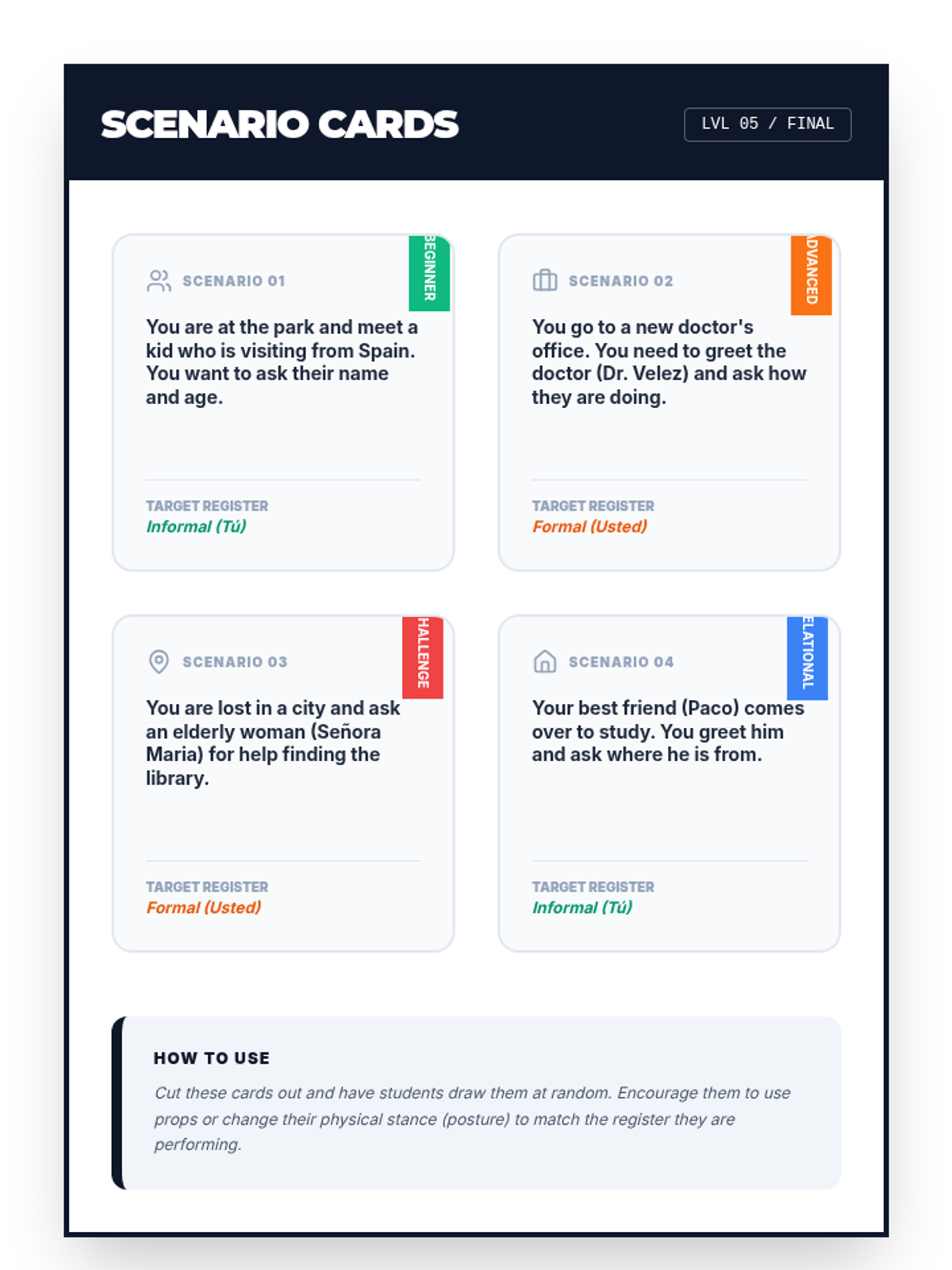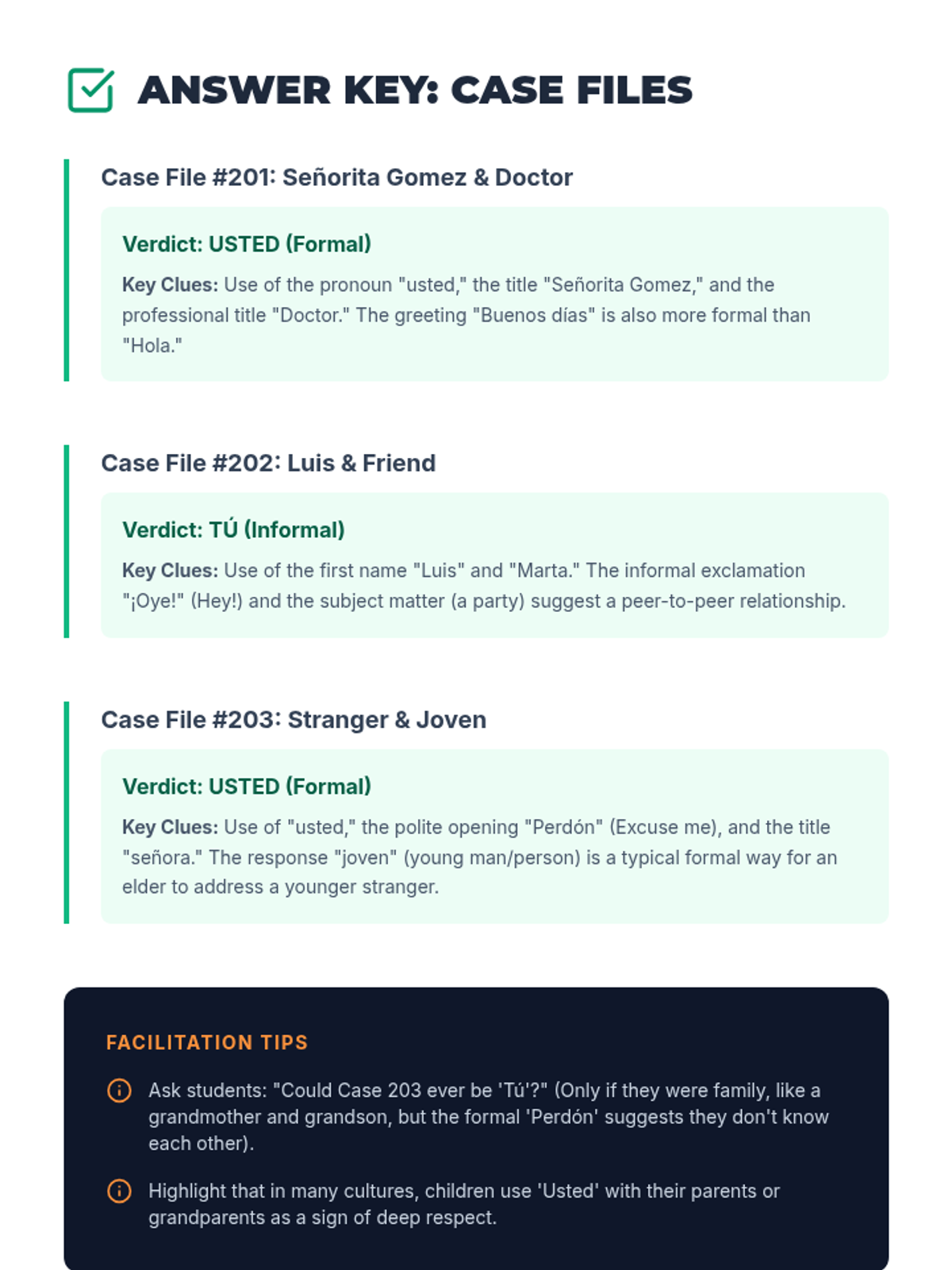 A case-study-driven unit for 6th-grade Spanish students to master the nuances of 'Tú' and 'Usted', focusing on cultural context, social hierarchy, and respectful communication.