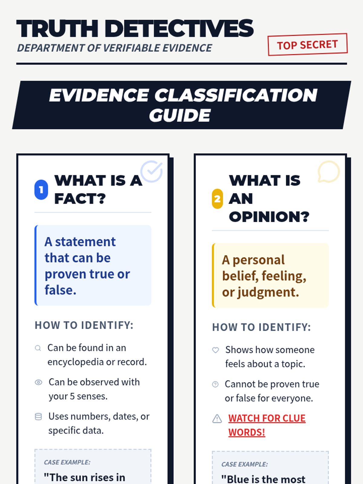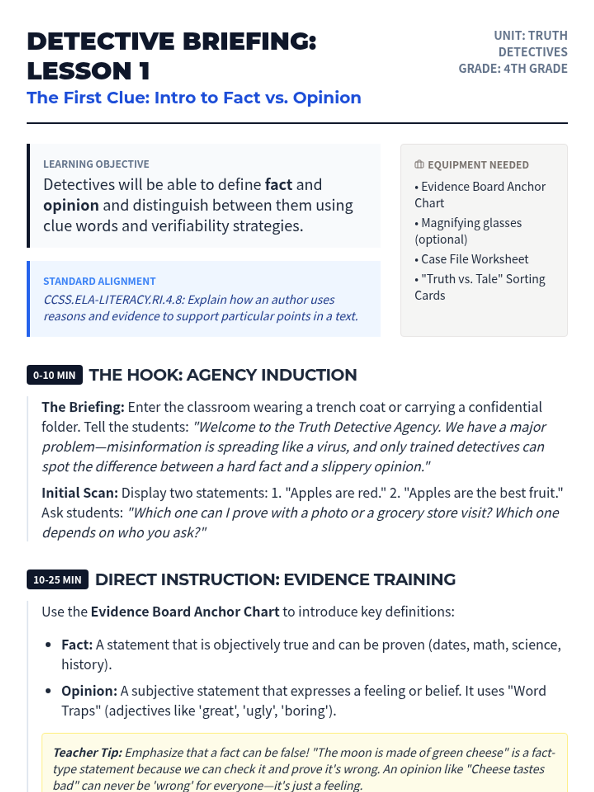 A comprehensive 10-day 4th grade unit themed around a detective agency where students learn to distinguish between verifiable facts and subjective opinions through investigation and analysis.