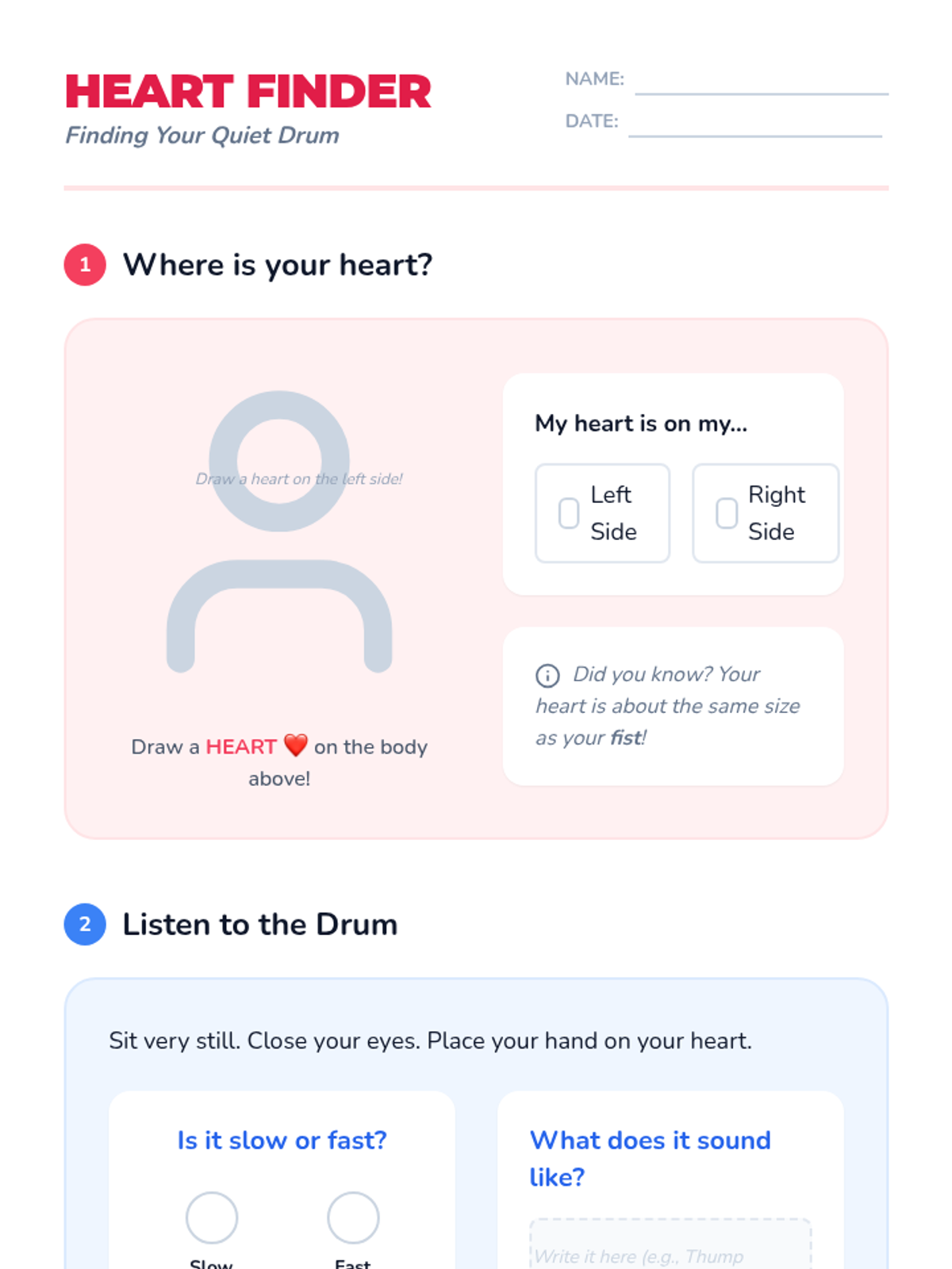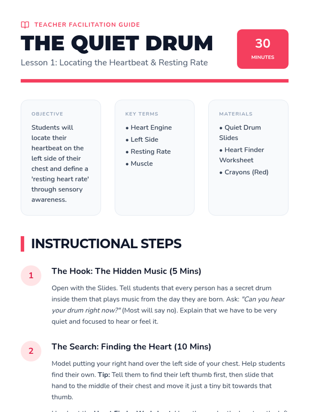 A 5-lesson sequence for 1st graders to understand heart rate changes through movement, sensory exploration, and play. Students learn to locate their heartbeat, compare resting vs. active rates, and identify exercise as a way to make their 'heart engine' stronger.