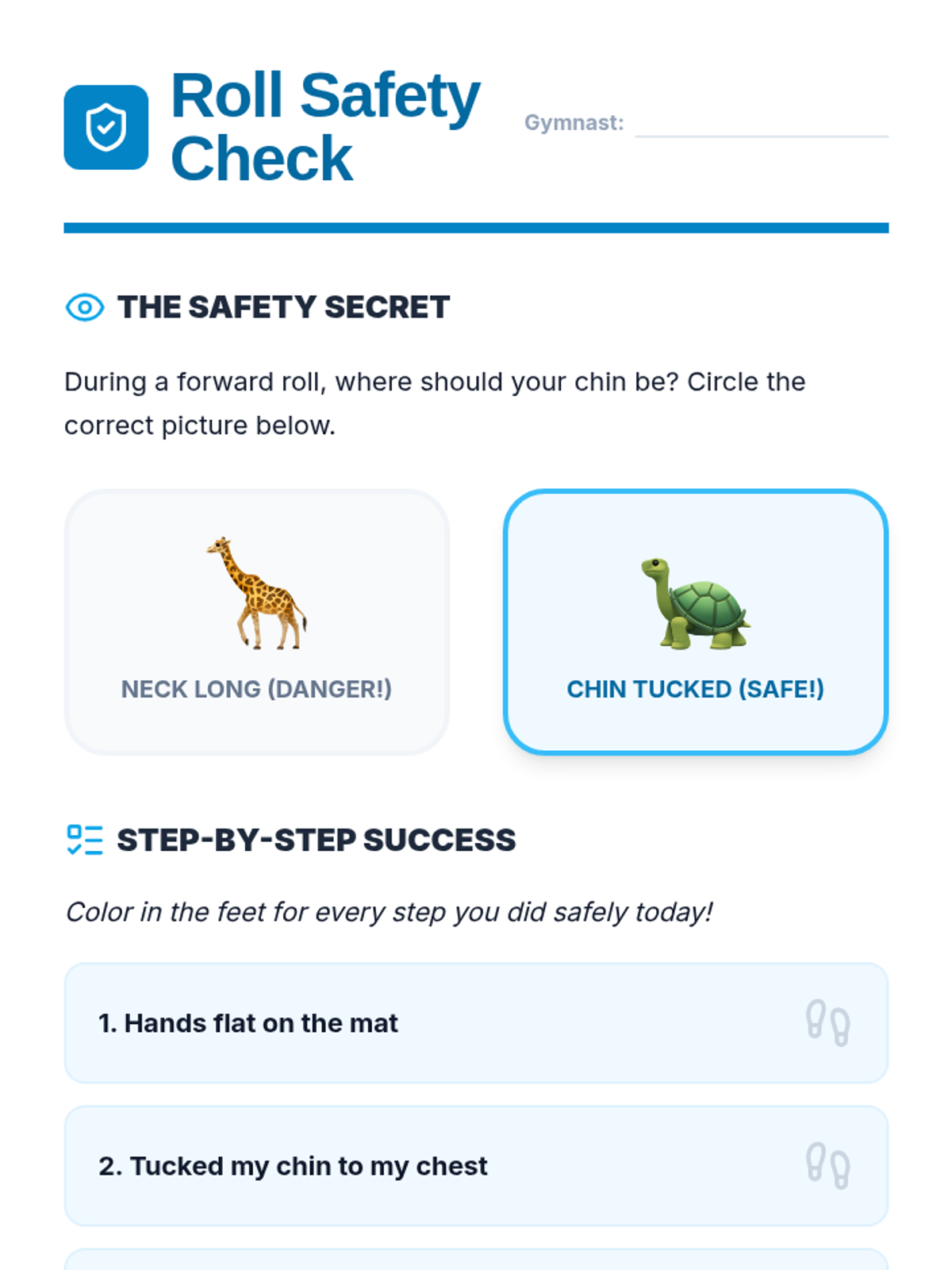A foundational gymnastics sequence for 1st graders focusing on body tension, rolling mechanics, and static balances. Students progress from simple log rolls to forward rolls and learn to transition into stable balance poses.