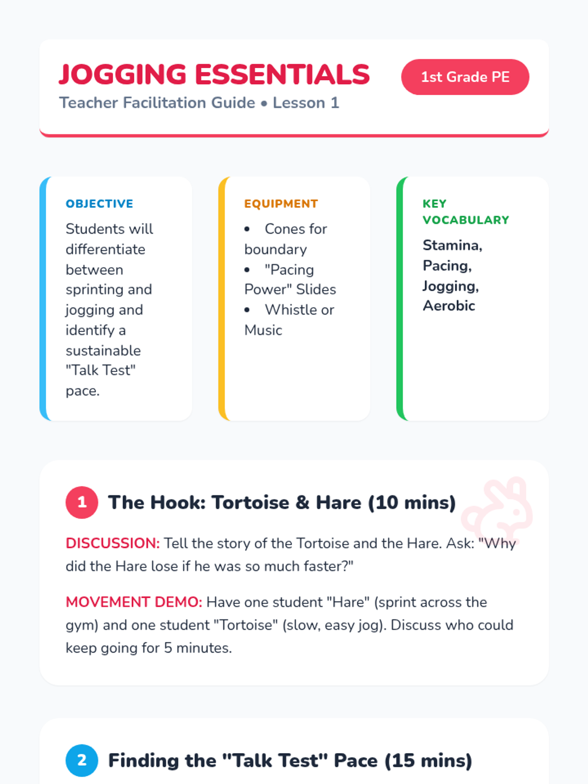 This sequence introduces 1st Grade students to cardiovascular fitness and the concept of pacing. Students learn to sustain movement through jogging, jumping rope, obstacle courses, and aerobic dance, culminating in a five-minute endurance challenge.