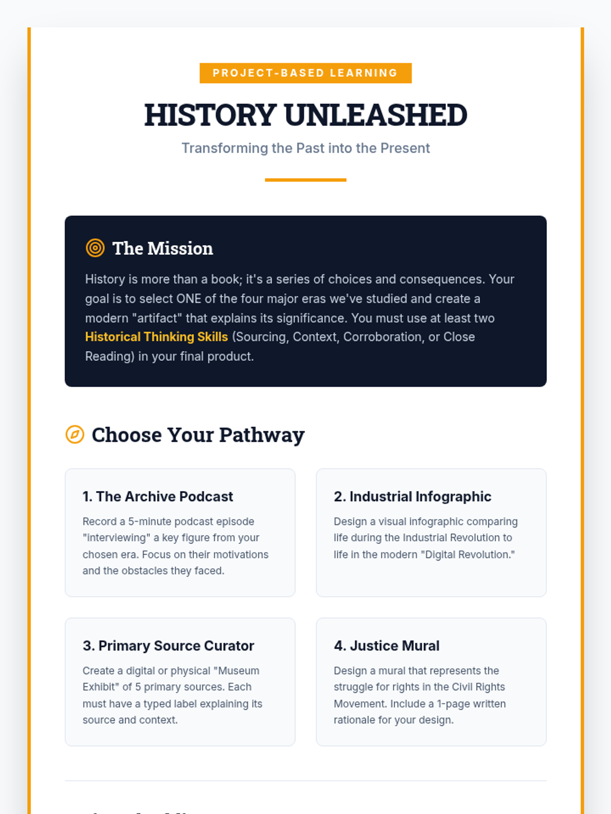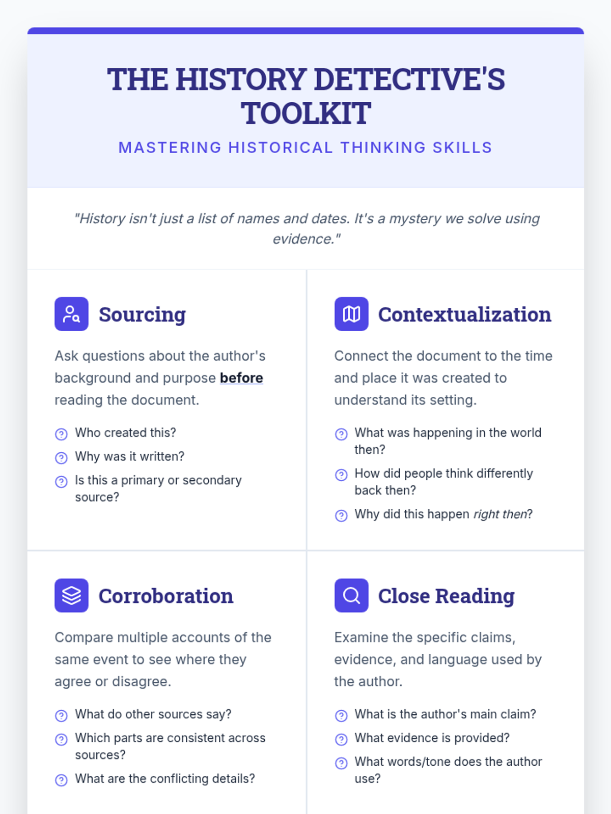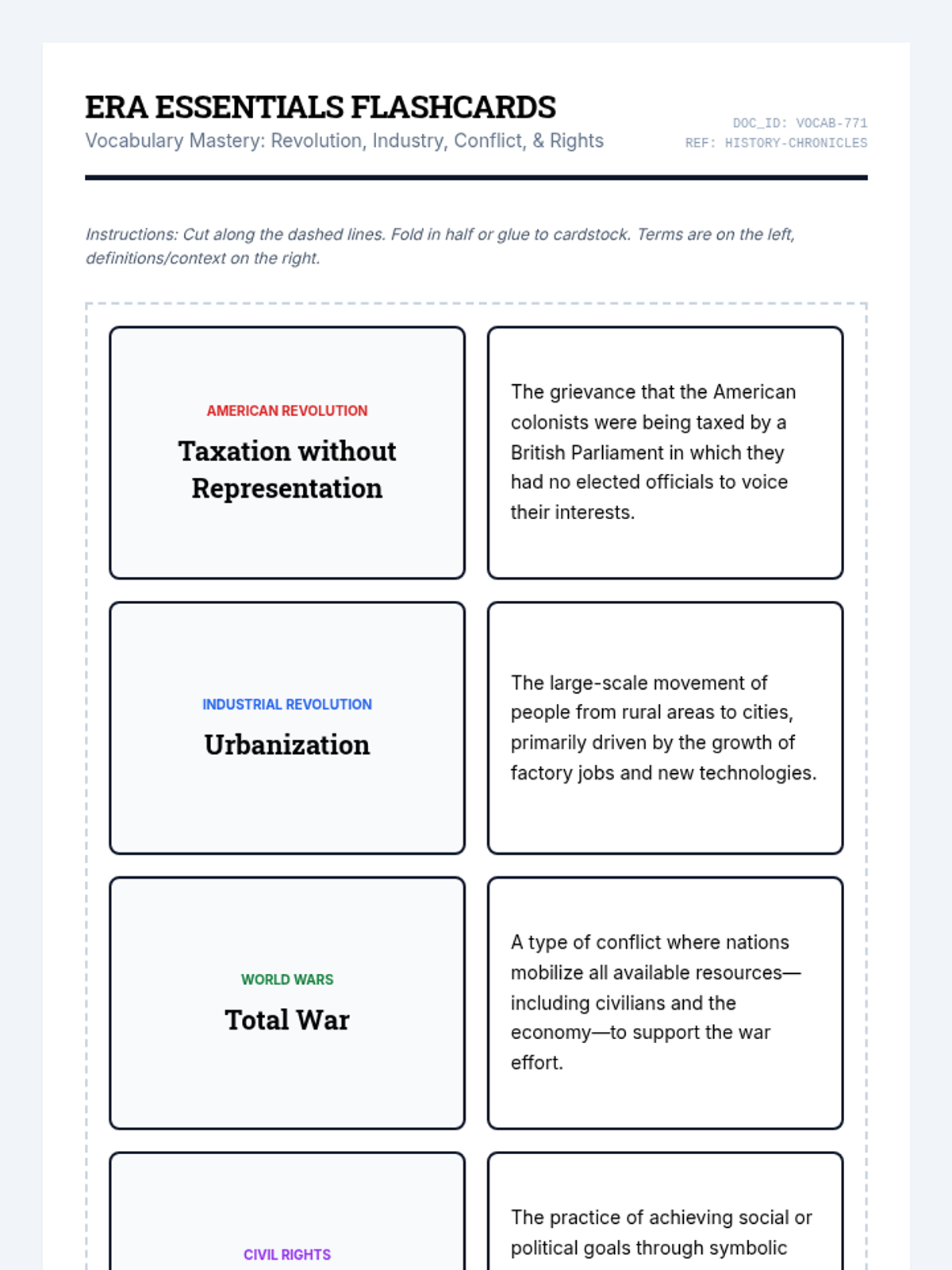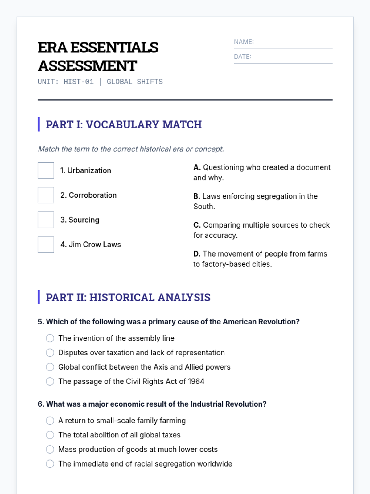 A comprehensive history sequence covering the American Revolution, Industrial Revolution, World Wars, and the Civil Rights Movement, focusing on developing historical thinking skills.