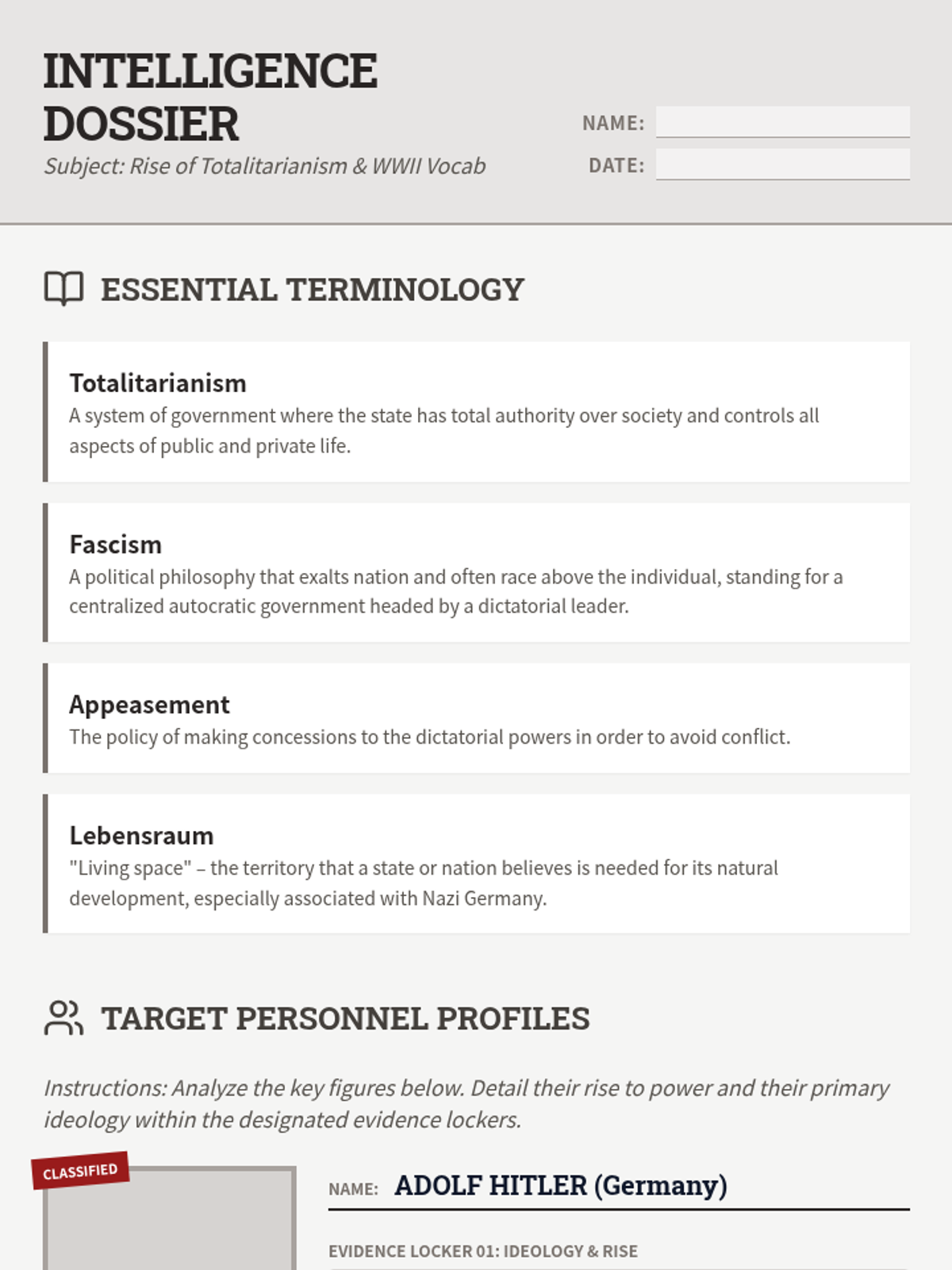 A comprehensive unit on World War II covering the causes, major events, the Holocaust, and life on the home front through the lens of historical dossiers and propaganda analysis.