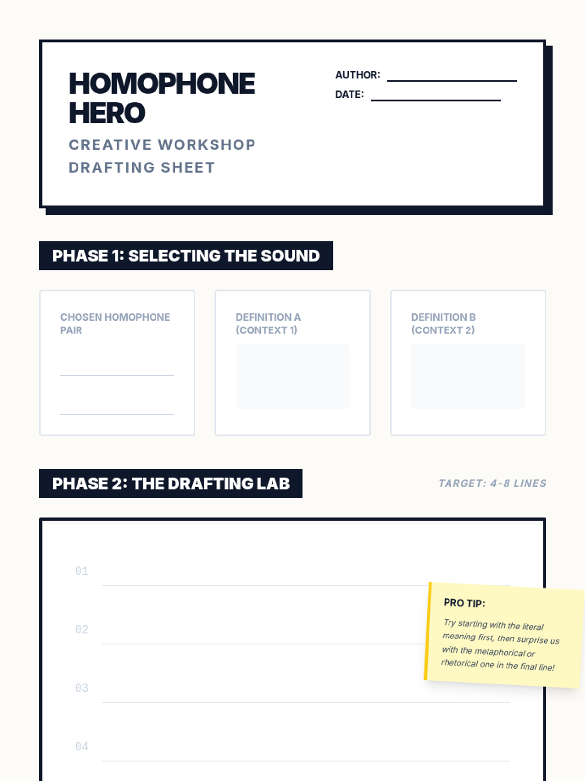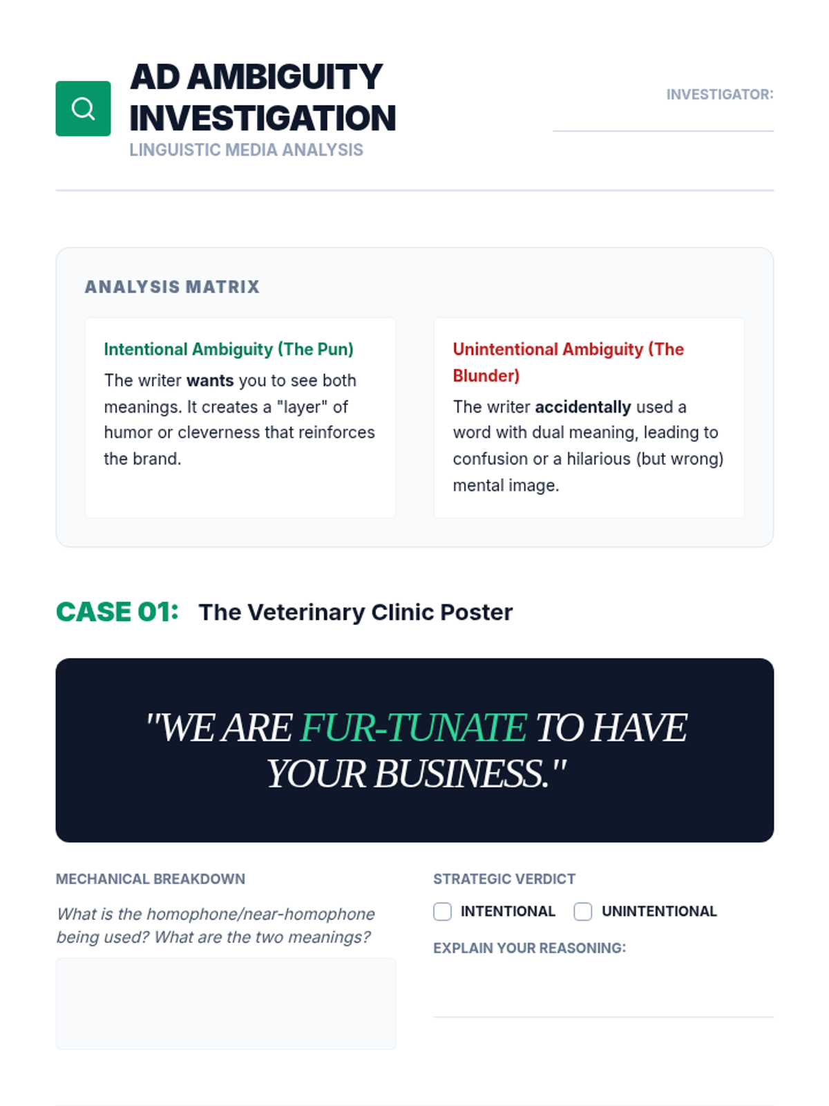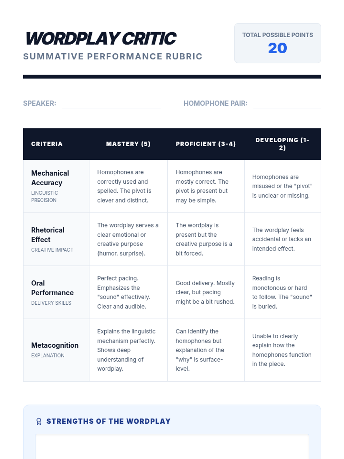 A project-based unit exploring the rhetorical and creative power of homophones. Students analyze puns, Shakespearean wit, and media headlines before crafting their own homophone-centric creative writing.