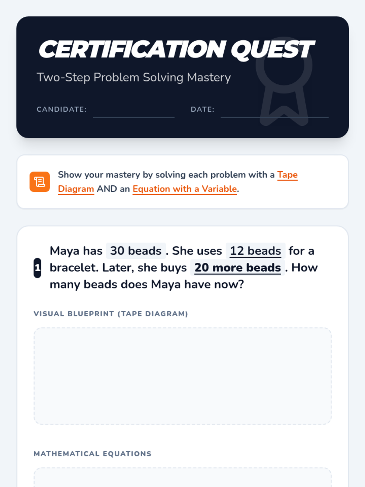 A comprehensive remedial unit for Arizona standard 3.OA.D.8, guiding students through two-step word problems using visual tape diagrams and algebraic equations.