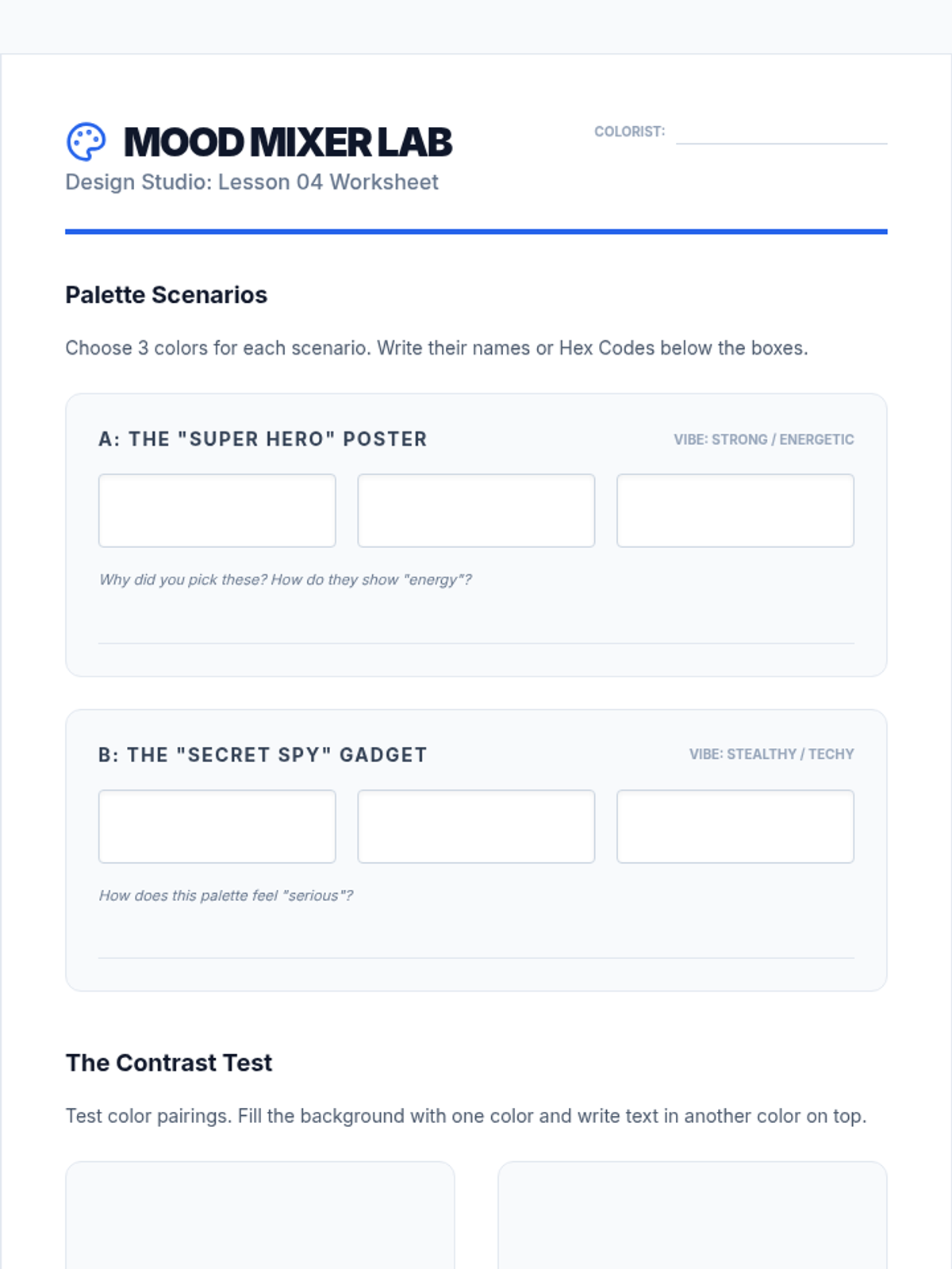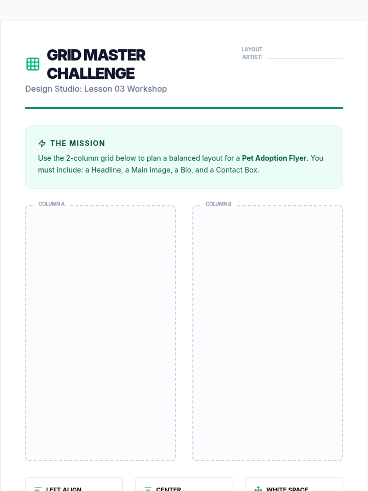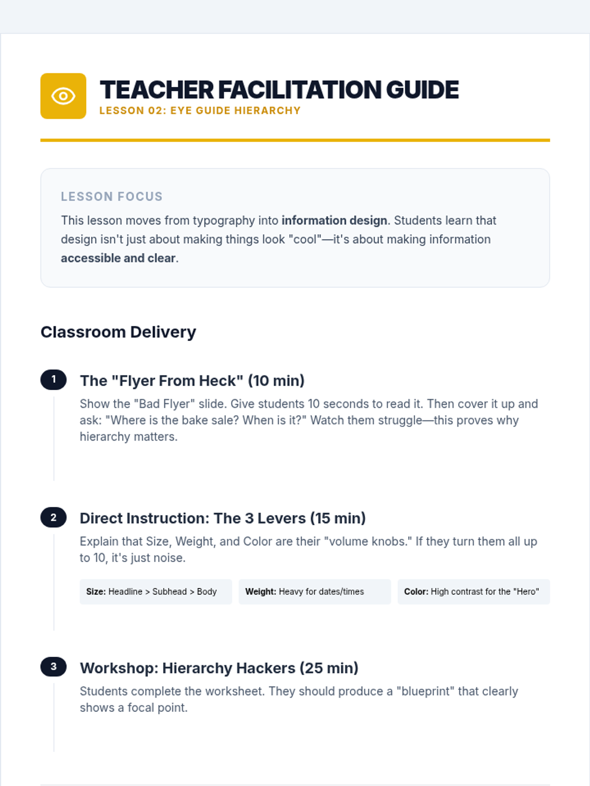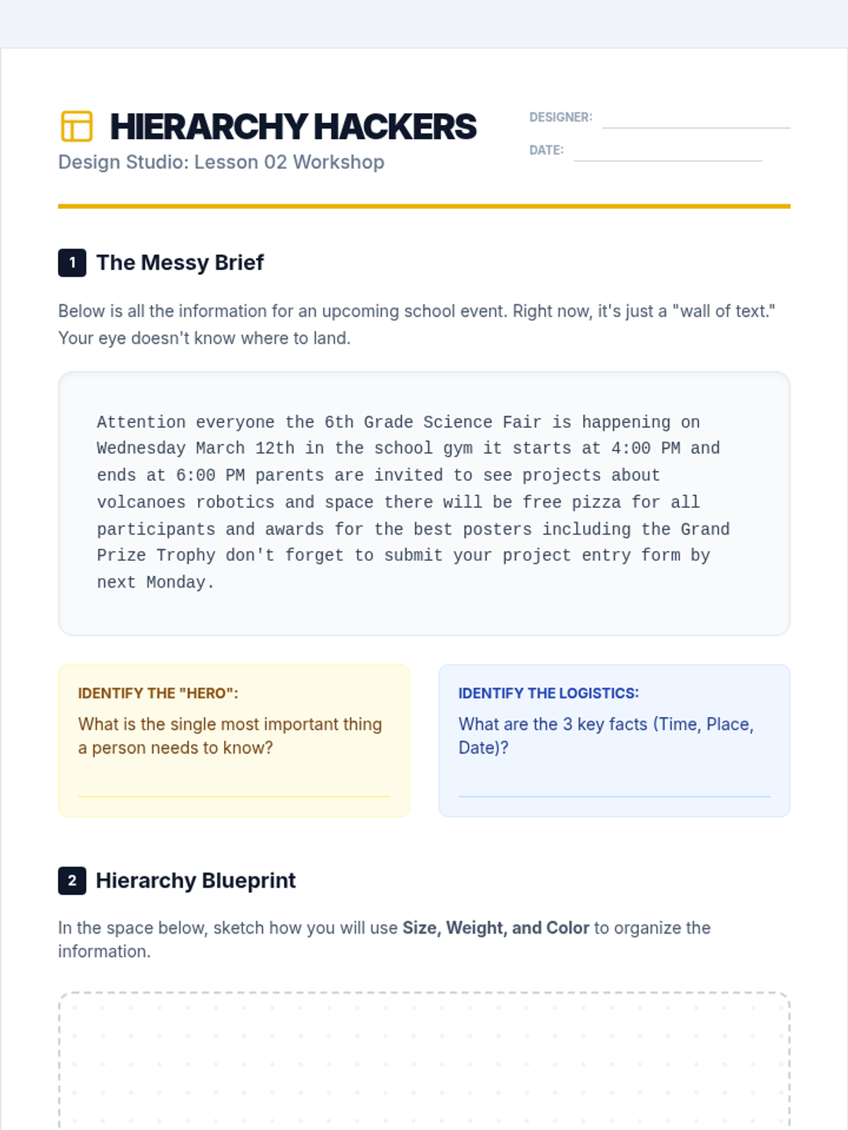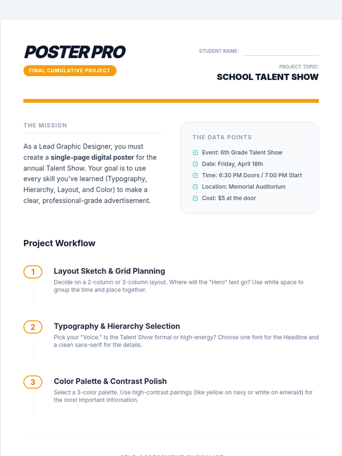 A foundational digital design unit for 6th graders focusing on typography, visual hierarchy, layout, and color theory, culminating in an event poster project.