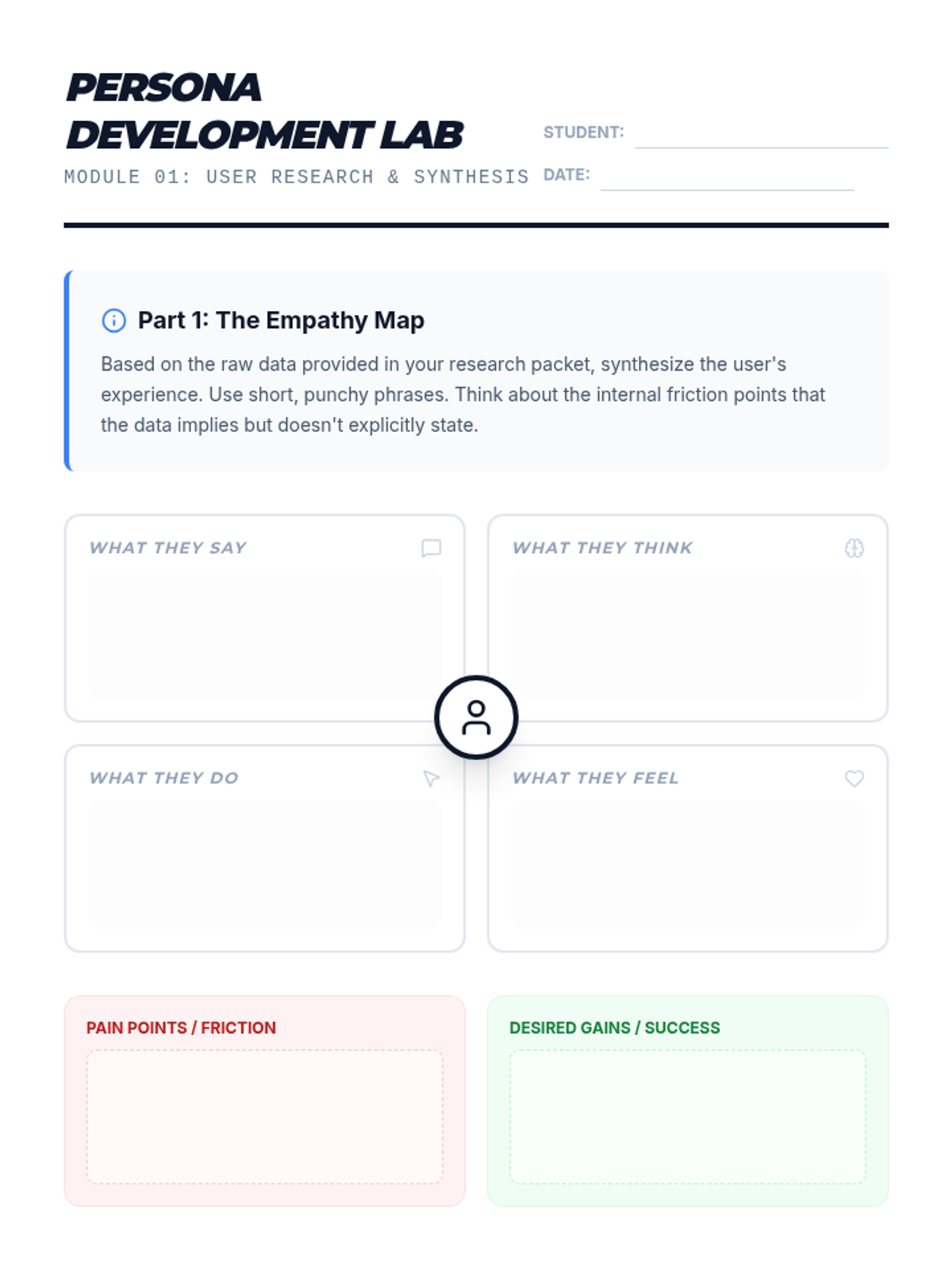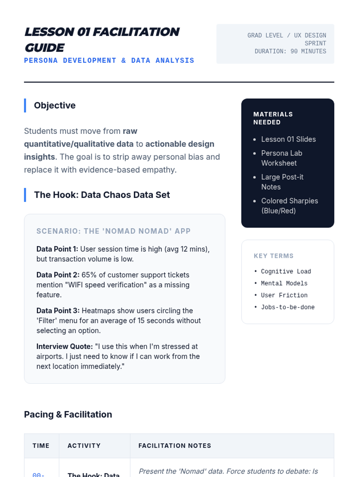 A graduate-level professional design sprint focusing on user-centered research, information architecture, high-fidelity UI design, and interactive prototyping. Students move from raw data to a refined, tested digital product.