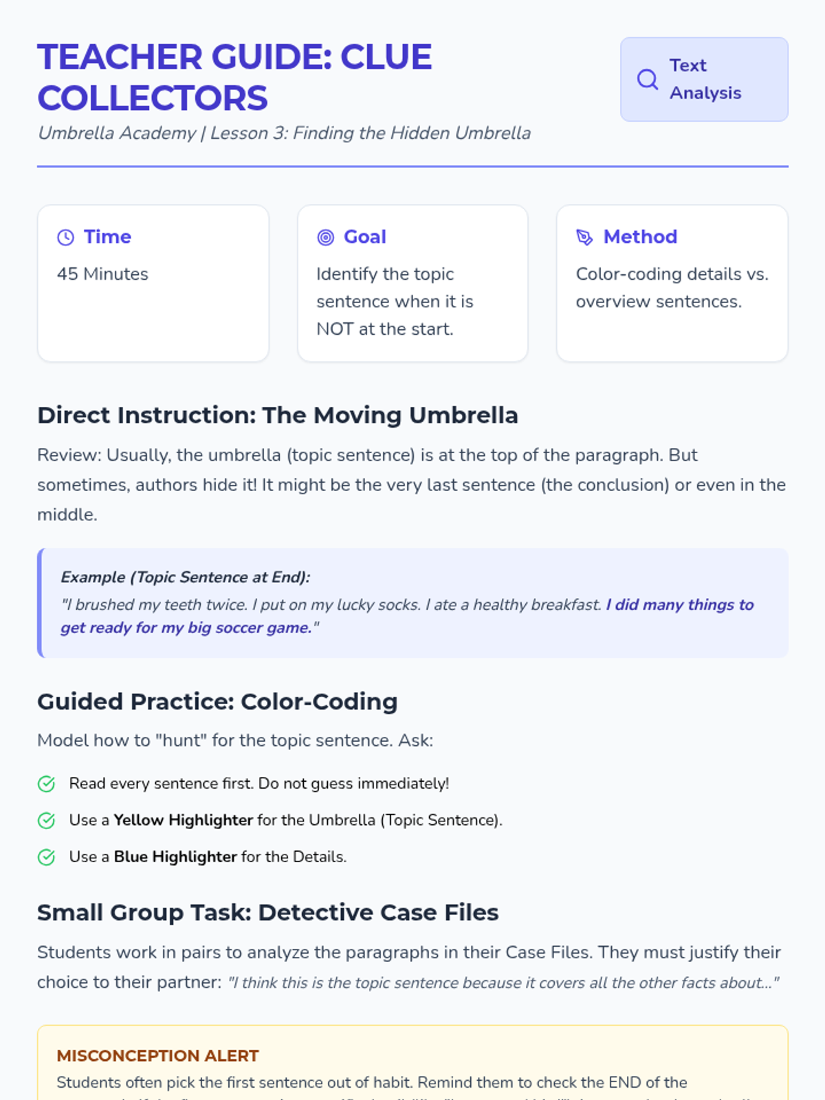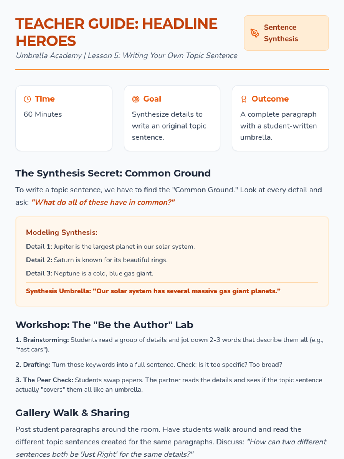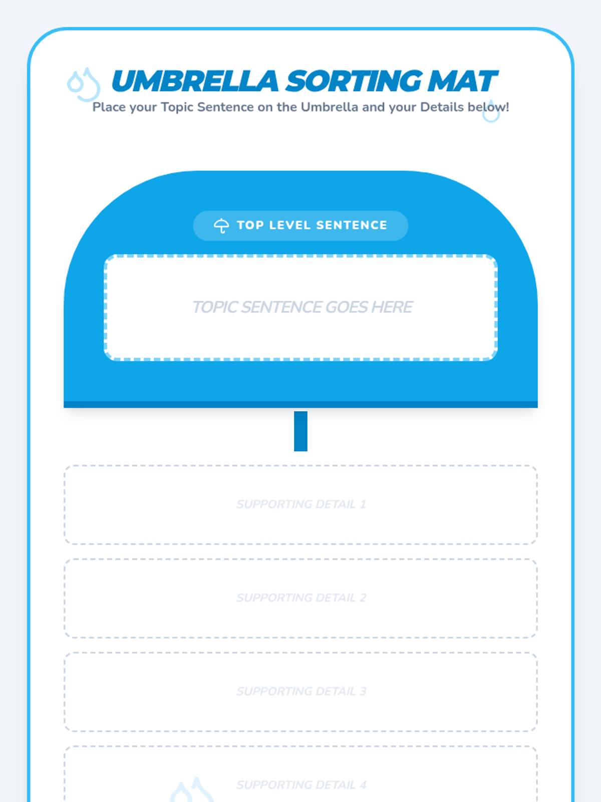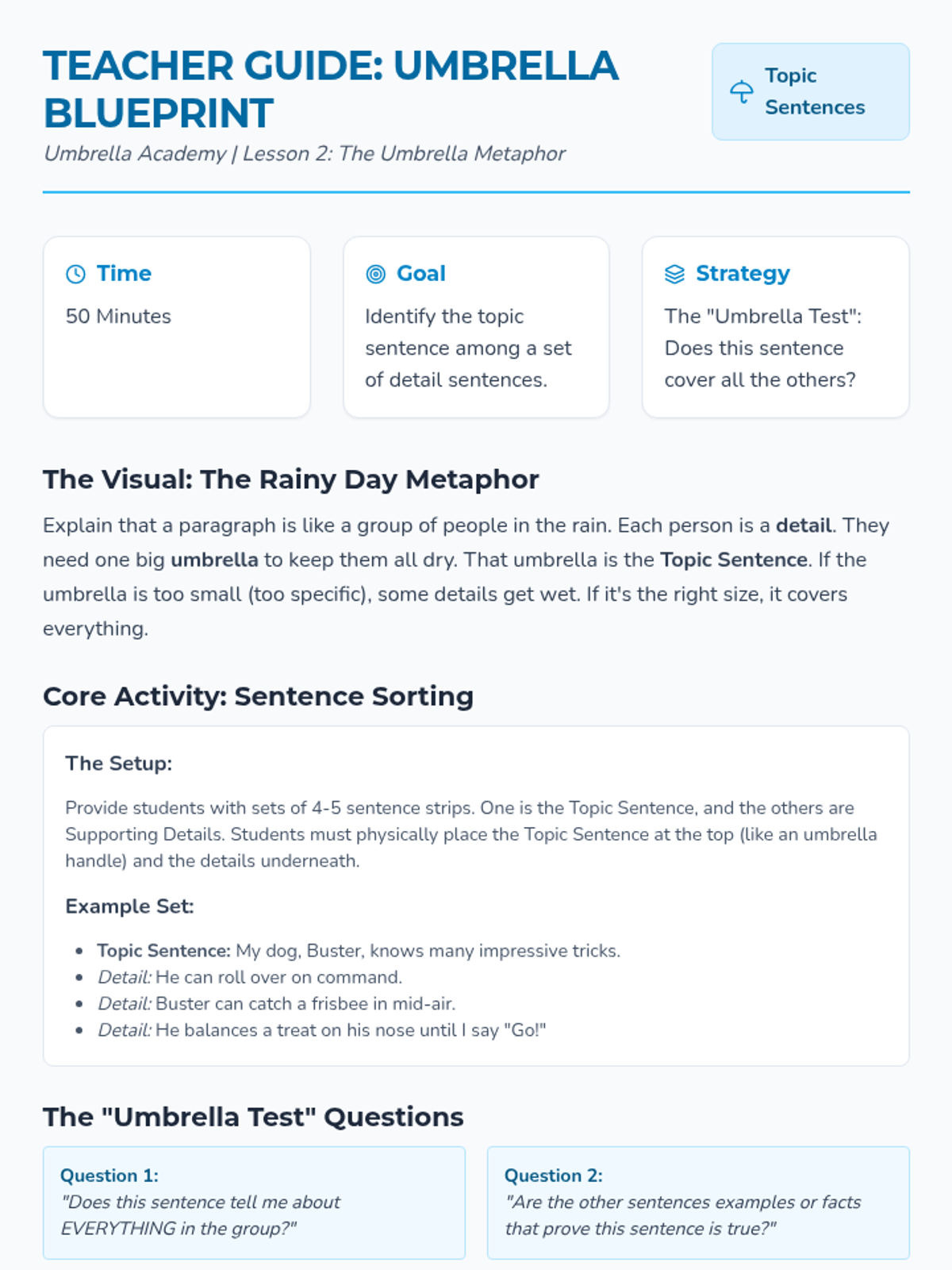 A 5-lesson sequence for 3rd graders that uses the visual metaphor of an umbrella to teach the relationship between topic sentences and supporting details. Students progress from concrete categorization to writing their own topic sentences.