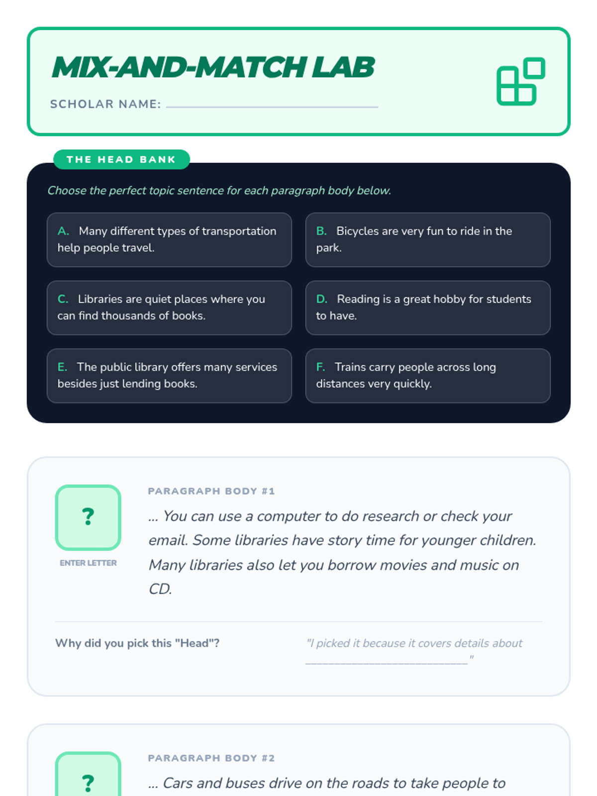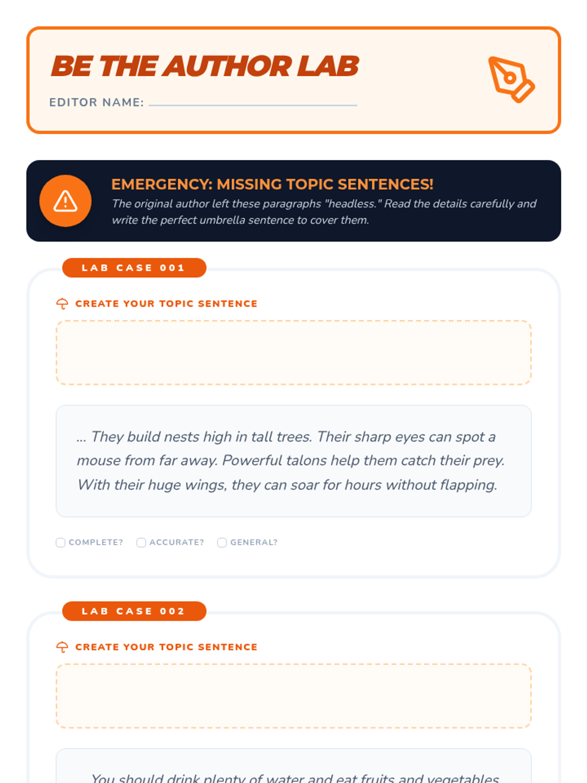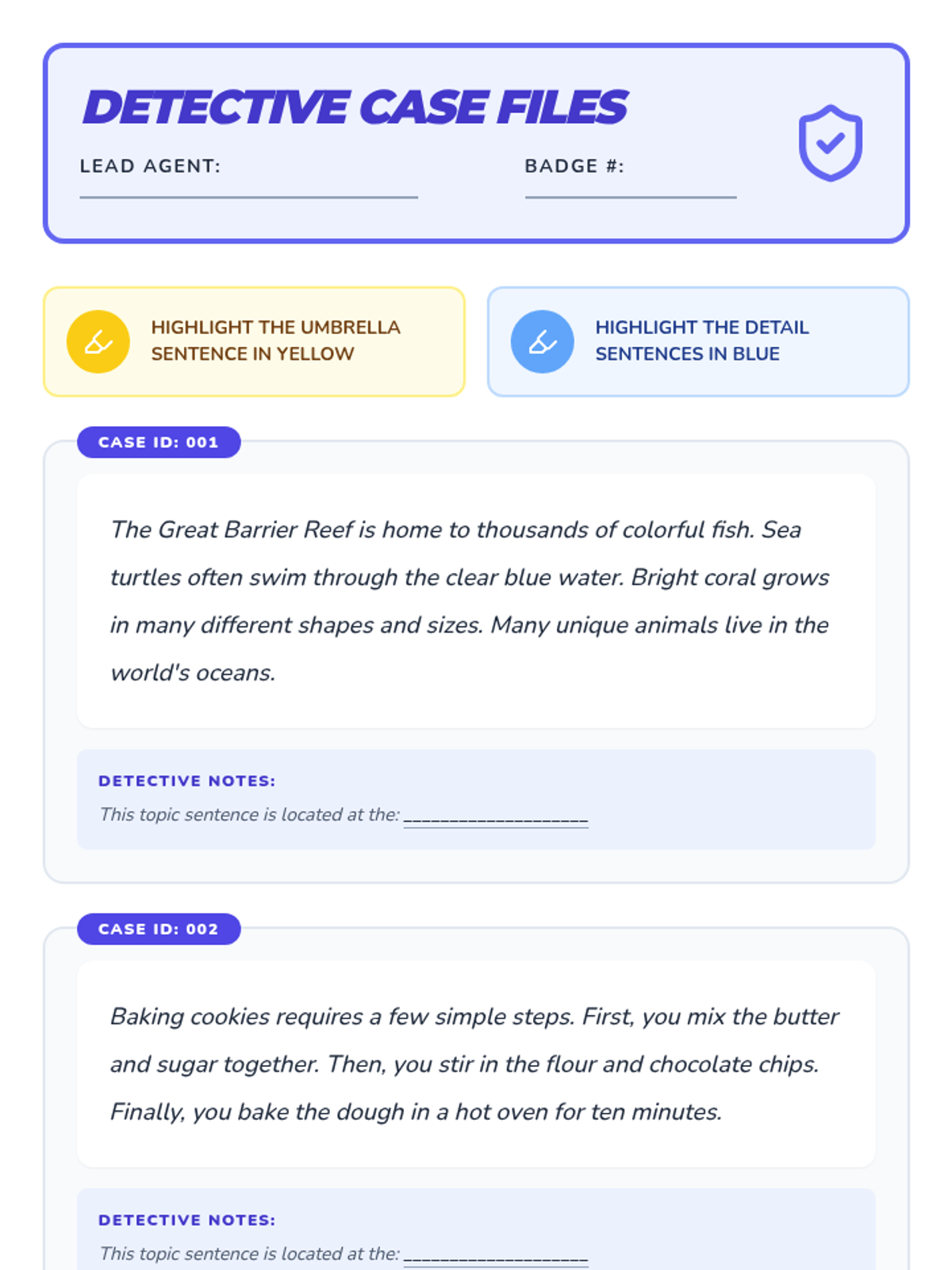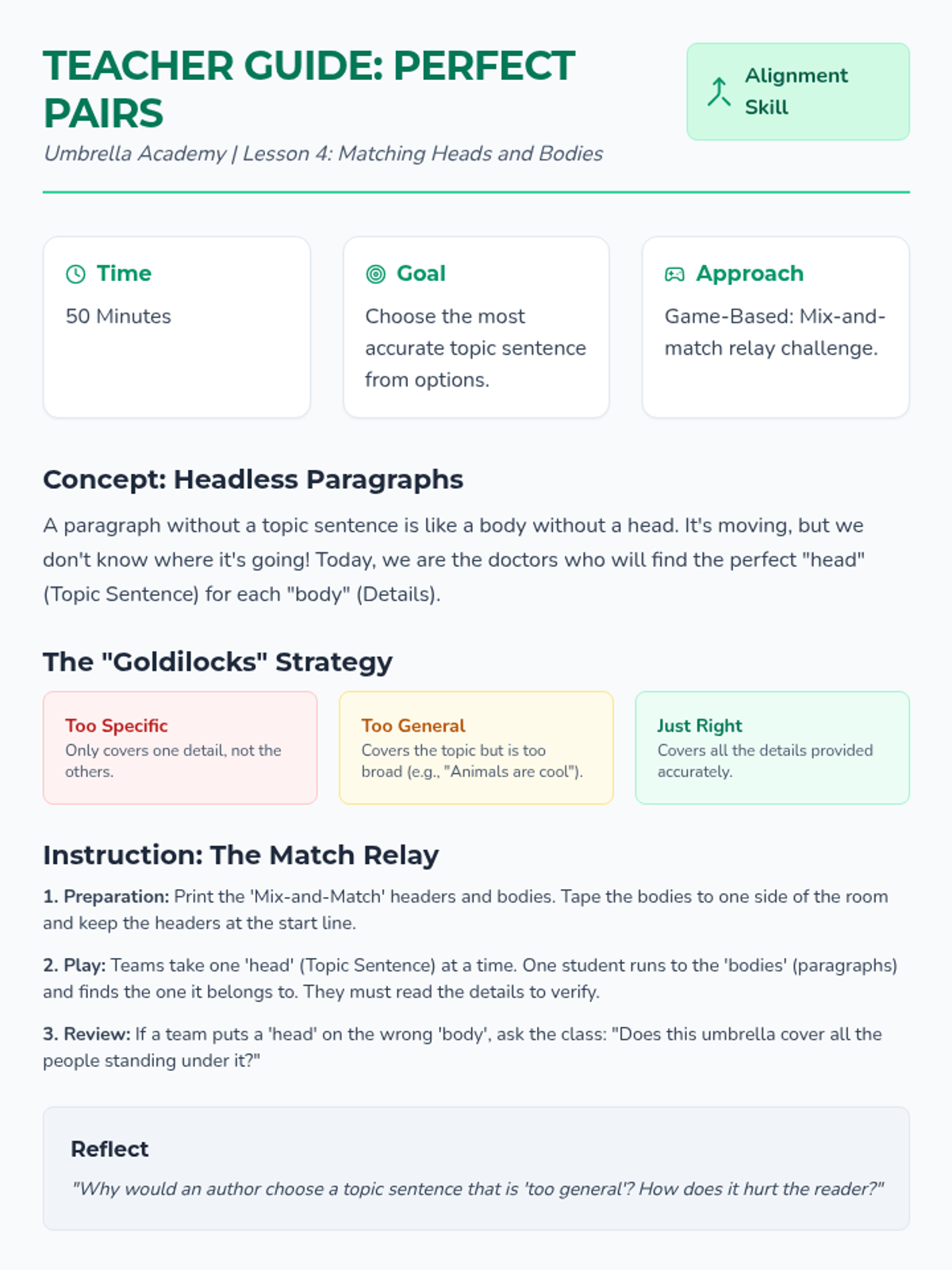 A 5-lesson sequence for 3rd graders that uses the visual metaphor of an umbrella to teach the relationship between topic sentences and supporting details. Students progress from concrete categorization to writing their own topic sentences.