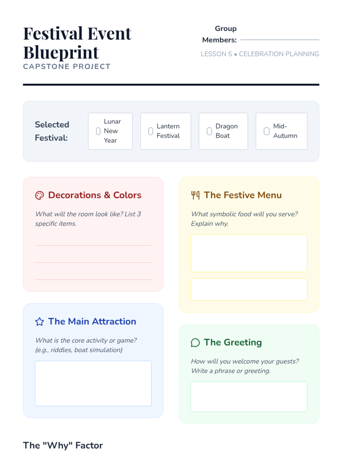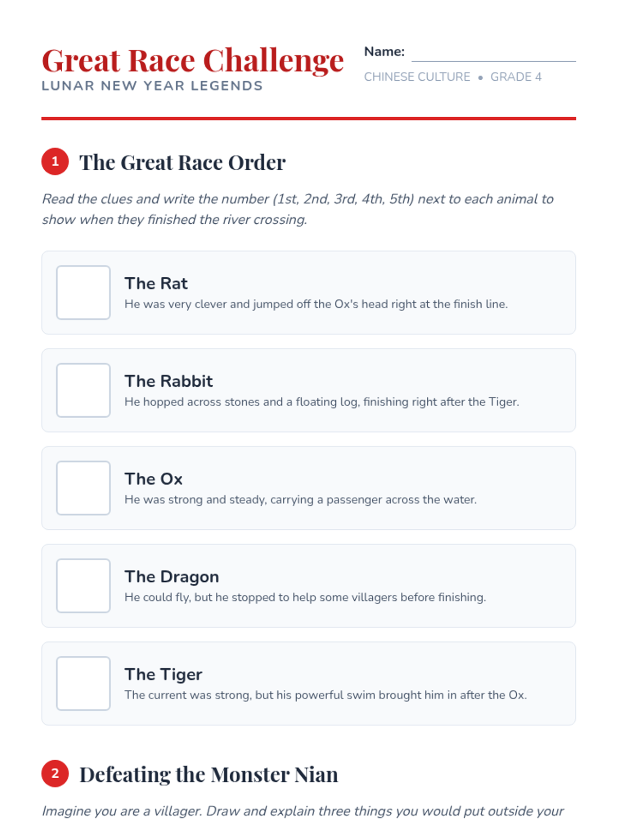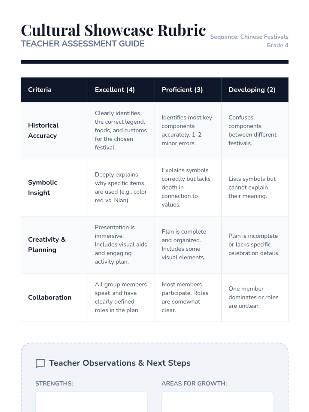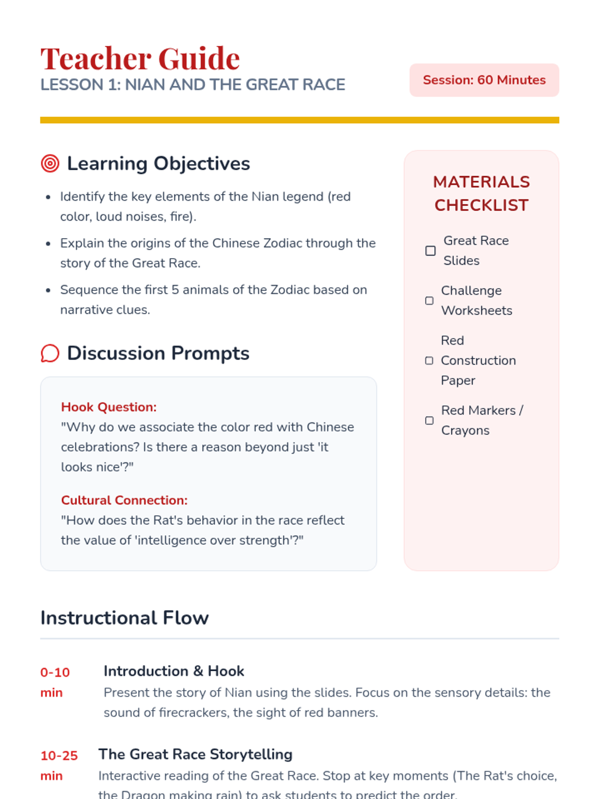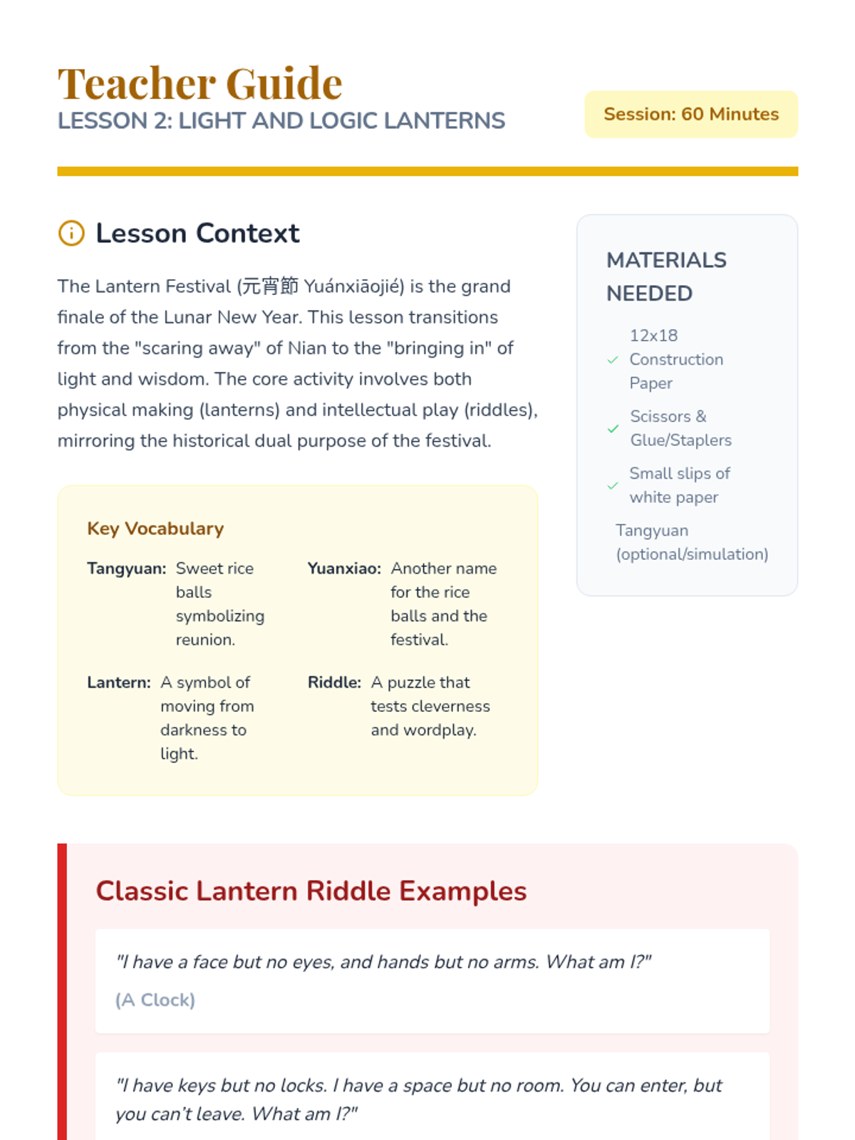 A comprehensive exploration of major Chinese festivals, focusing on their origins, legends, and cultural values for 4th-grade students. This sequence covers the Lunar New Year, Lantern Festival, Dragon Boat Festival, and Mid-Autumn Festival, culminating in a festive planning capstone.