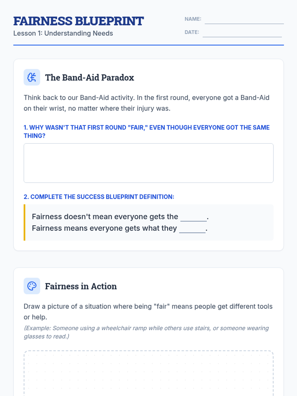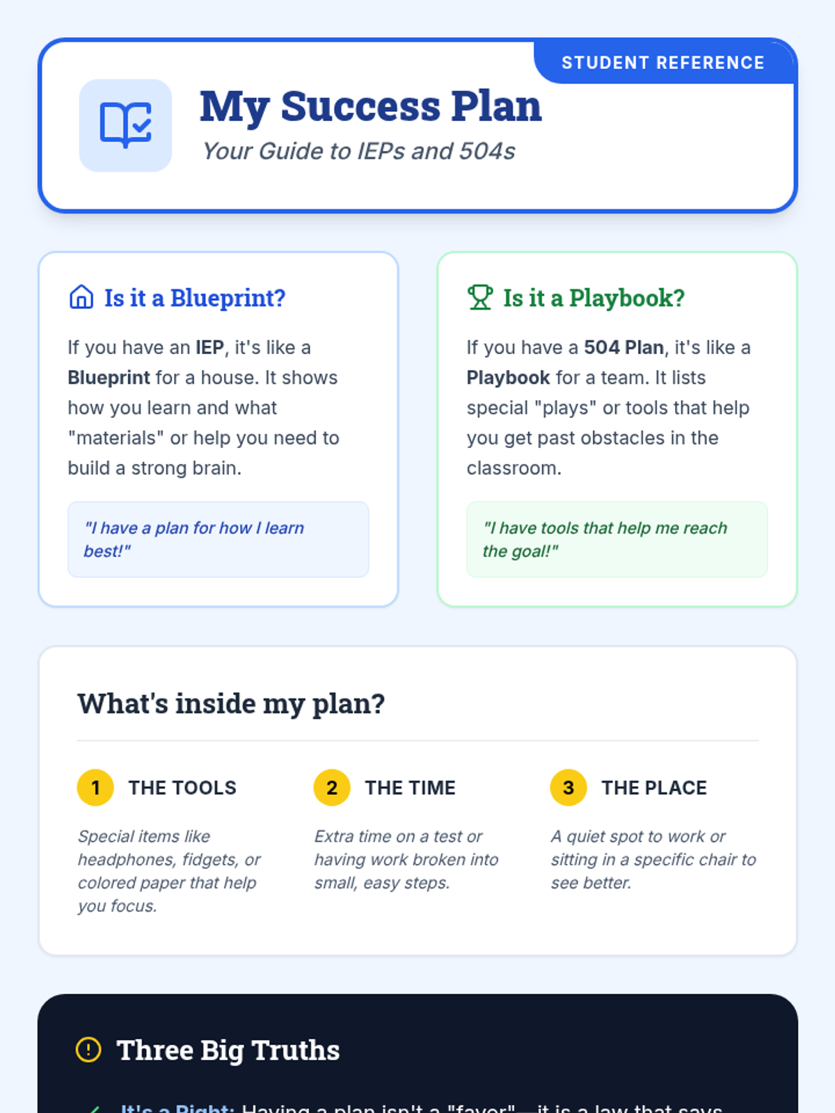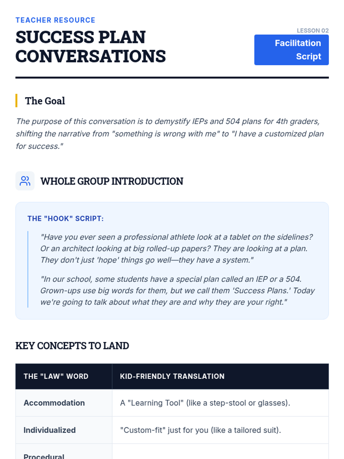 This sequence uses case studies and analysis to help 4th-grade students understand fairness, educational rights, and the role of IEPs and 504 plans as 'Success Plans'. Students learn to advocate for their needs by distinguishing fairness from equality and practicing how to negotiate adjustments to their support.