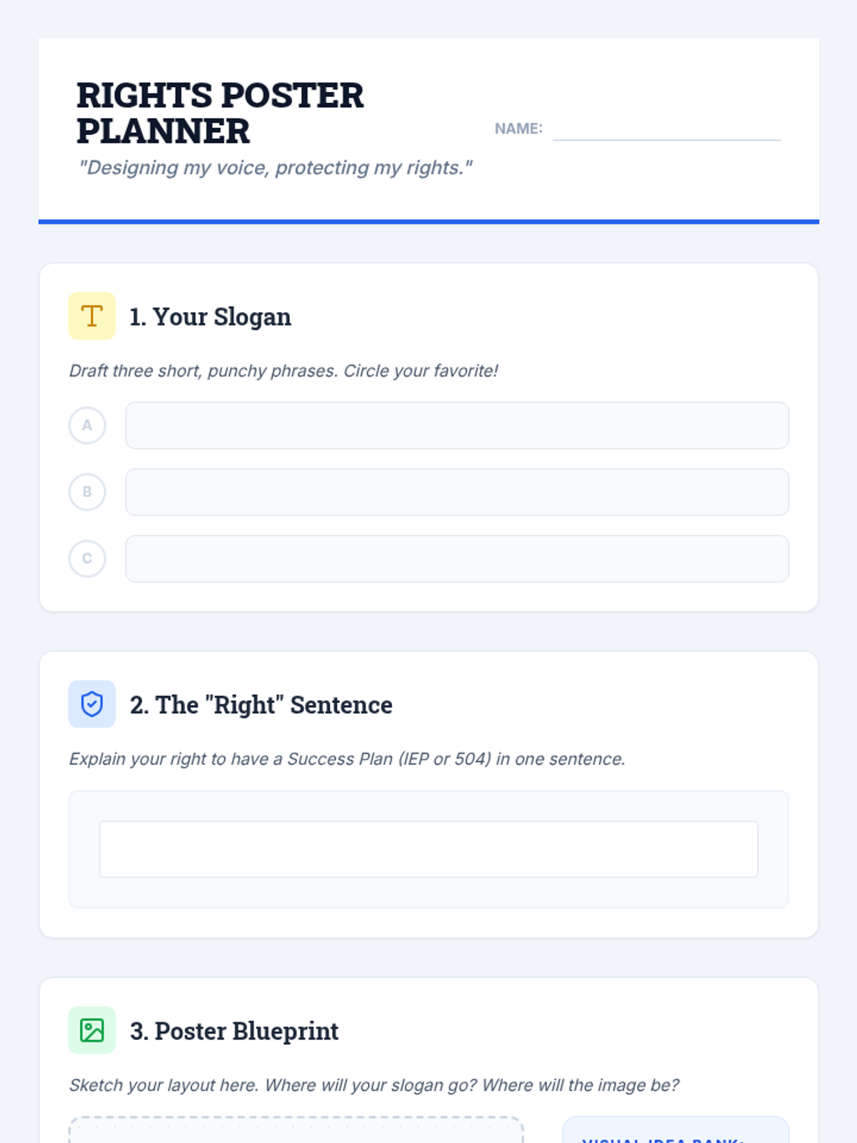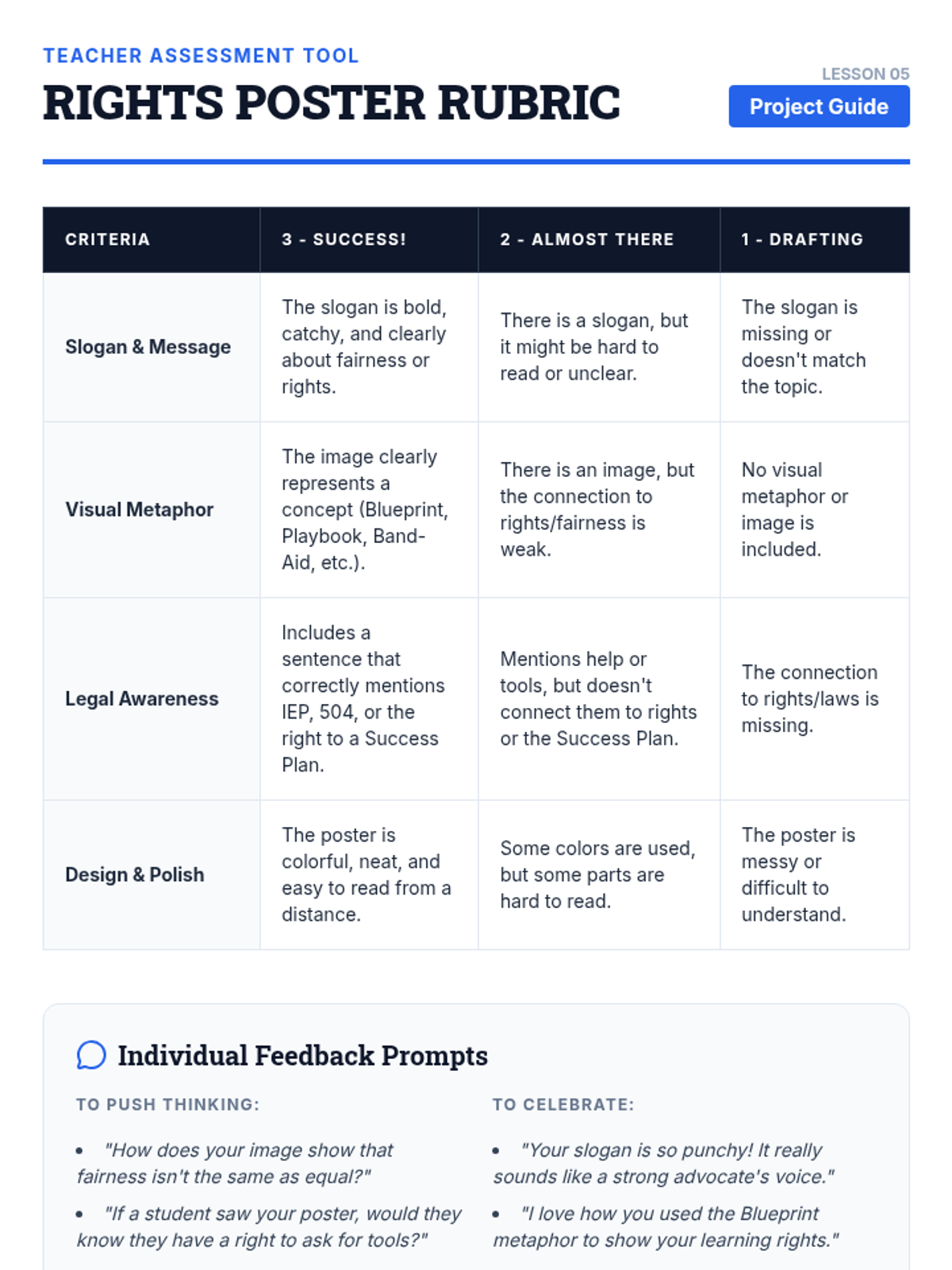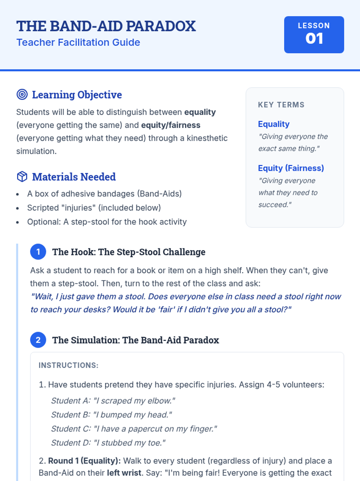 This sequence uses case studies and analysis to help 4th-grade students understand fairness, educational rights, and the role of IEPs and 504 plans as 'Success Plans'. Students learn to advocate for their needs by distinguishing fairness from equality and practicing how to negotiate adjustments to their support.