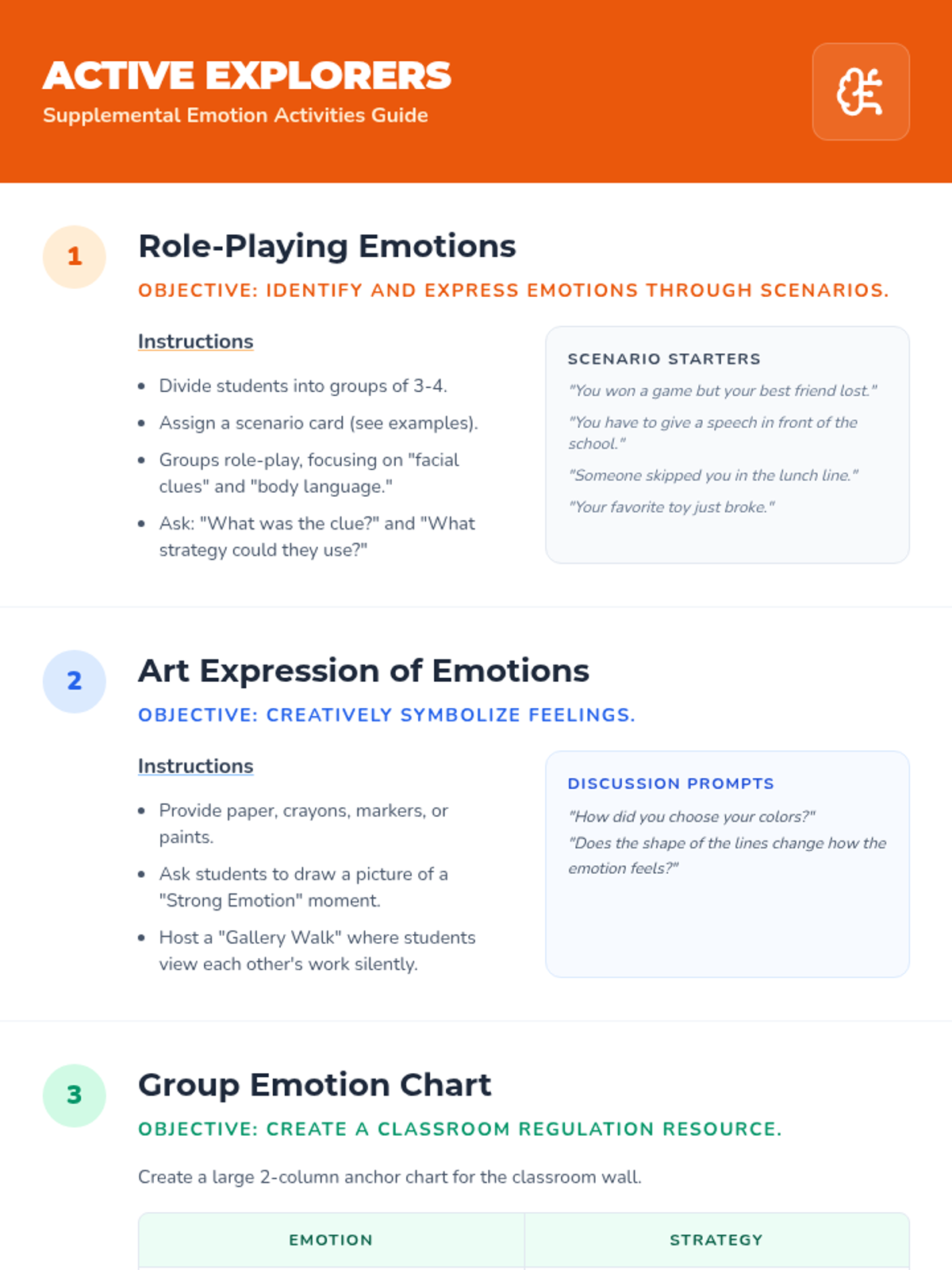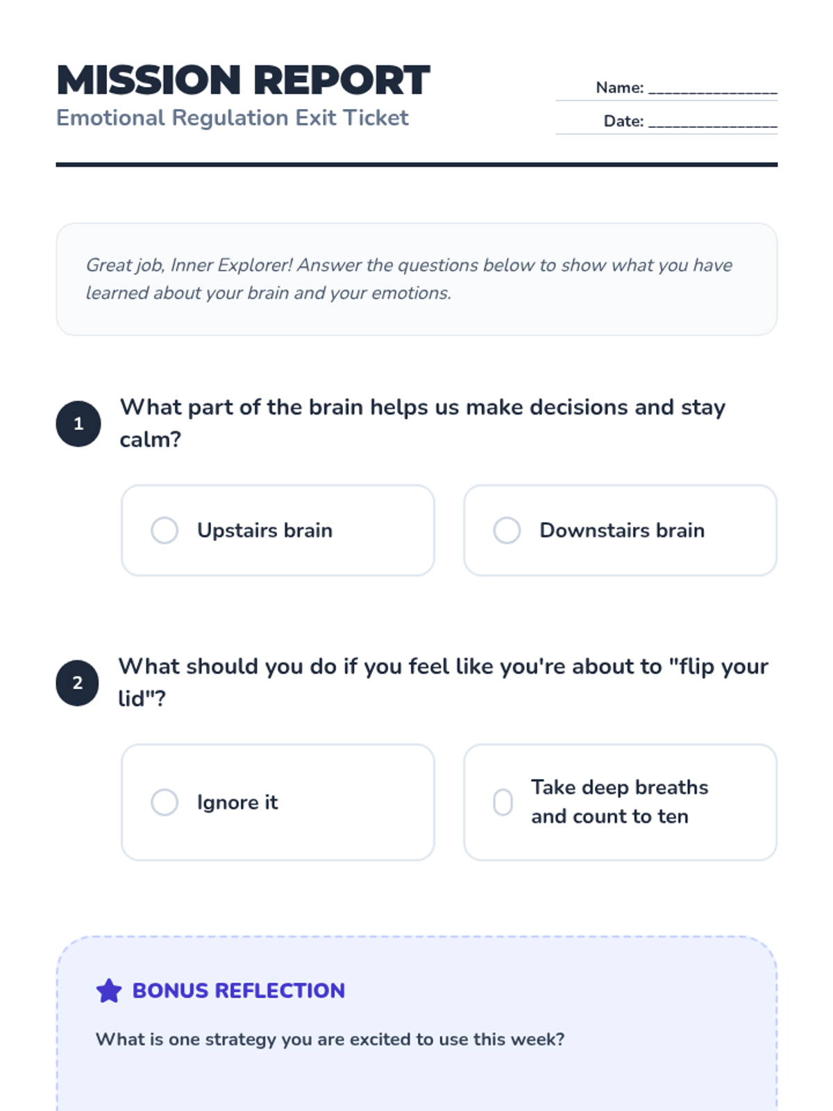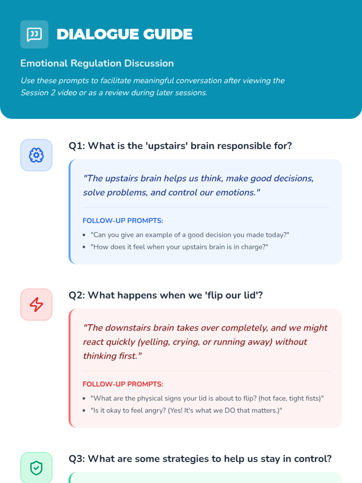A comprehensive 6-session social-emotional learning series for elementary students focusing on brain science, emotional regulation, and coping strategies. Using the 'upstairs' and 'downstairs' brain model, students learn to identify feelings and use tools to stay in control.