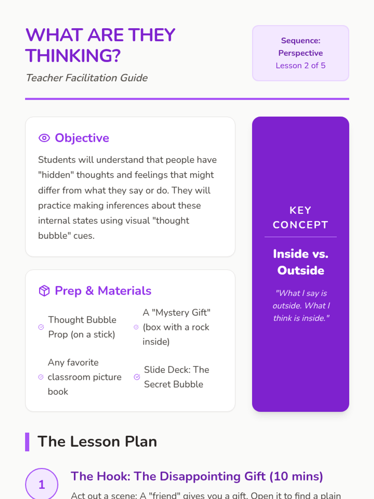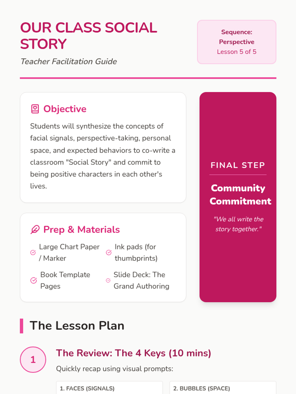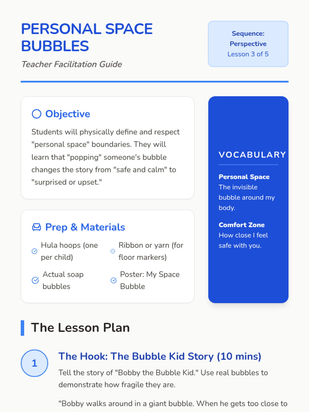 A 5-lesson sequence for Pre-K students focusing on Theory of Mind, perspective-taking, and social cues to support the creation of personal social stories. Students explore how their actions affect others' feelings and learn to navigate social boundaries and expectations.
