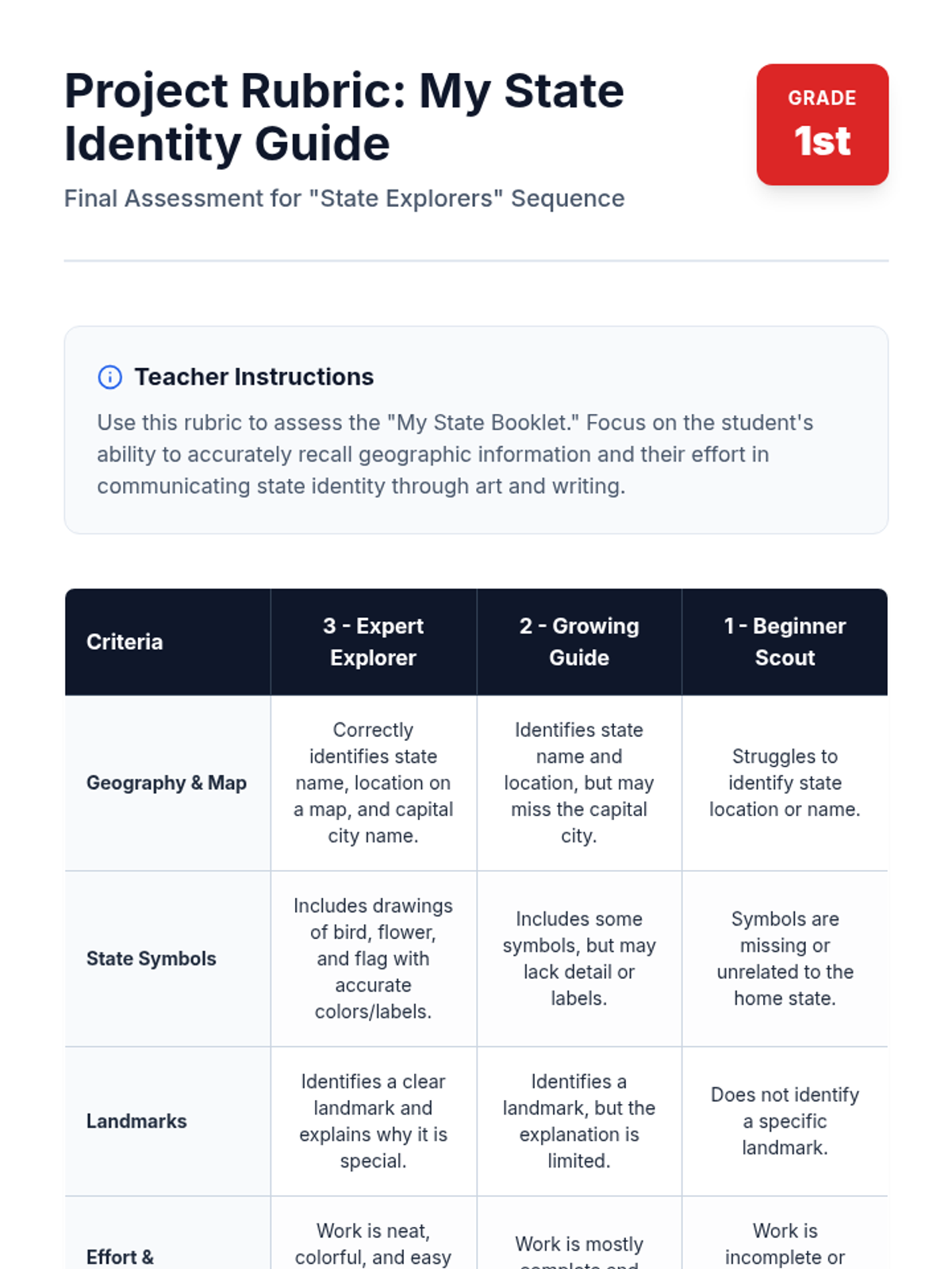 Students explore the concept of a 'state' as a distinct geographic and political entity. They learn to locate their state on a map, understand the hierarchy of city/state/country, identify official symbols, and recognize important regional landmarks.