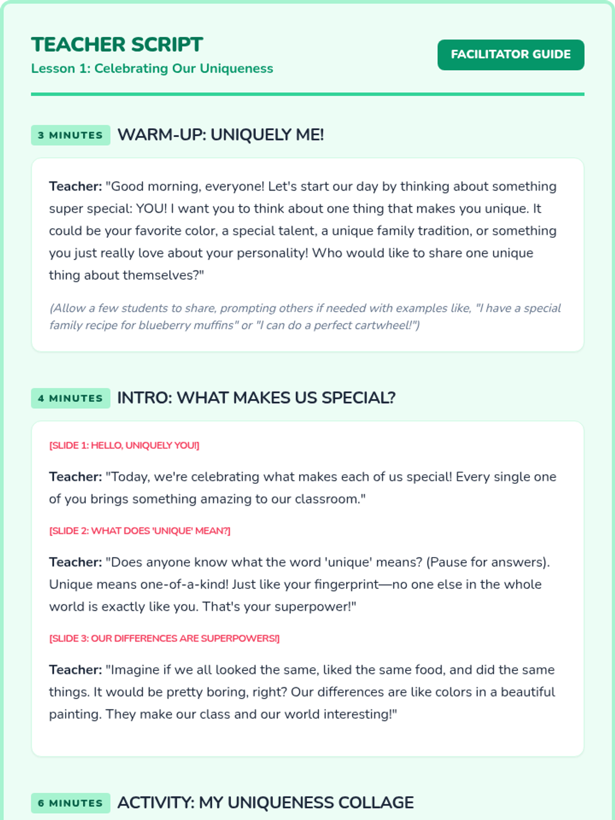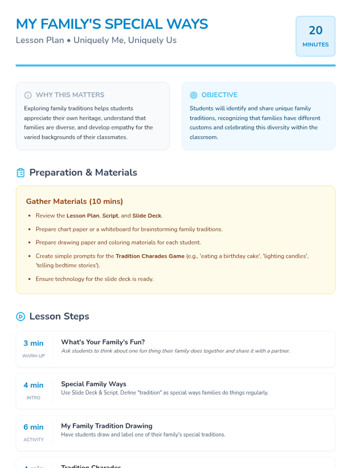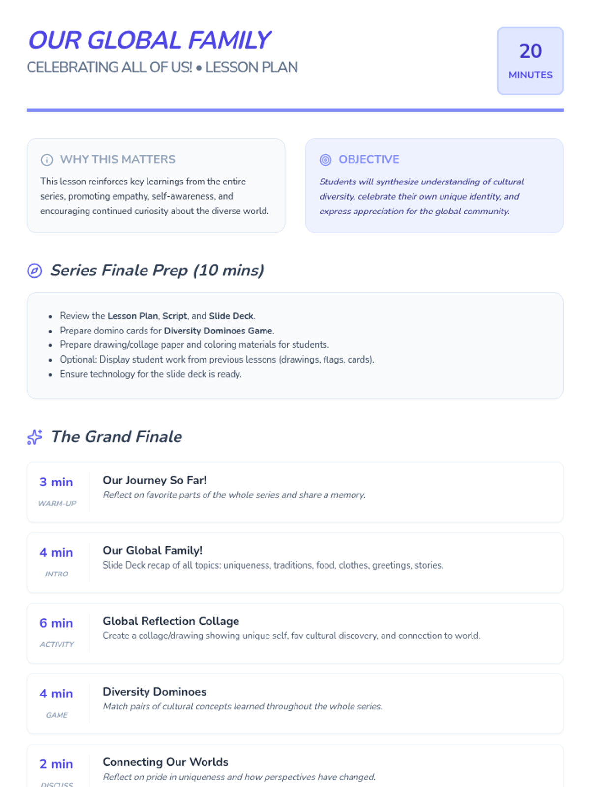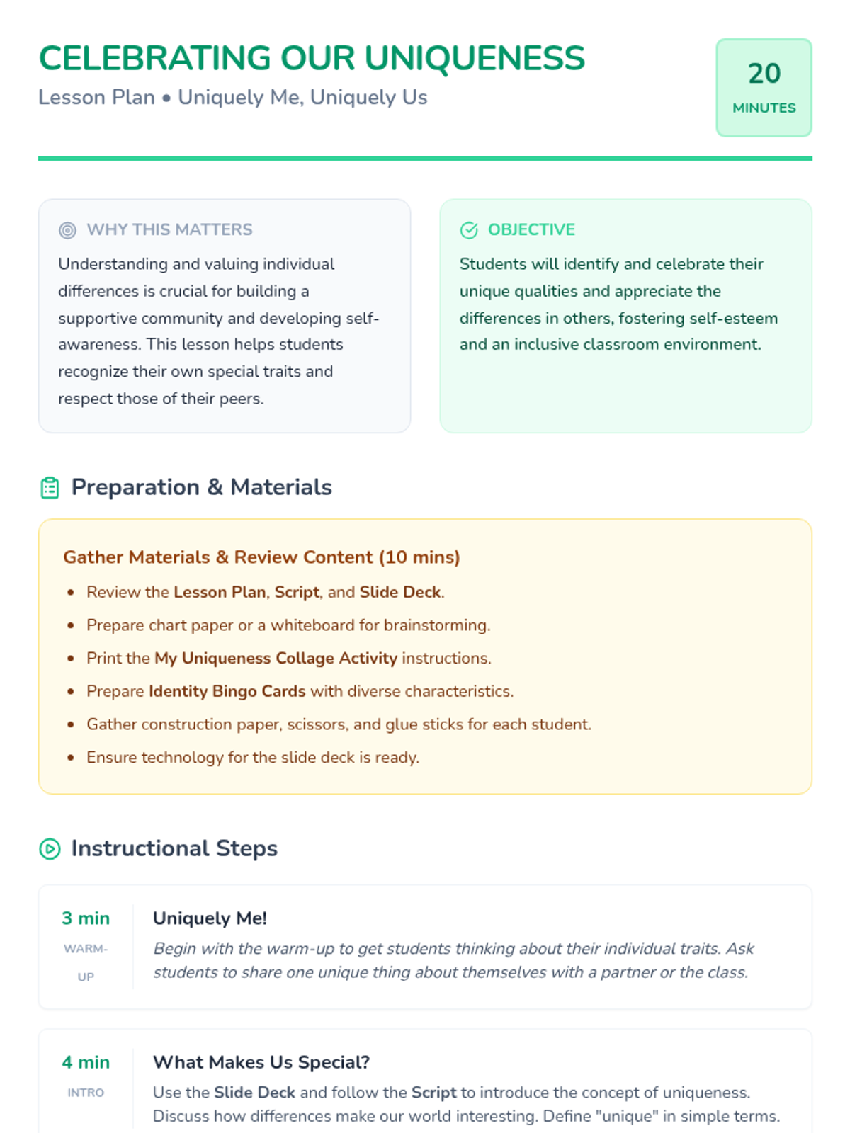 A sequence of 20-minute lessons for second-grade girls to explore culture, diversity, and uniqueness through interactive activities, discussions, and creative projects.