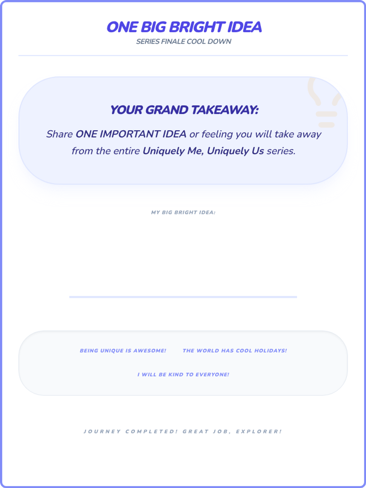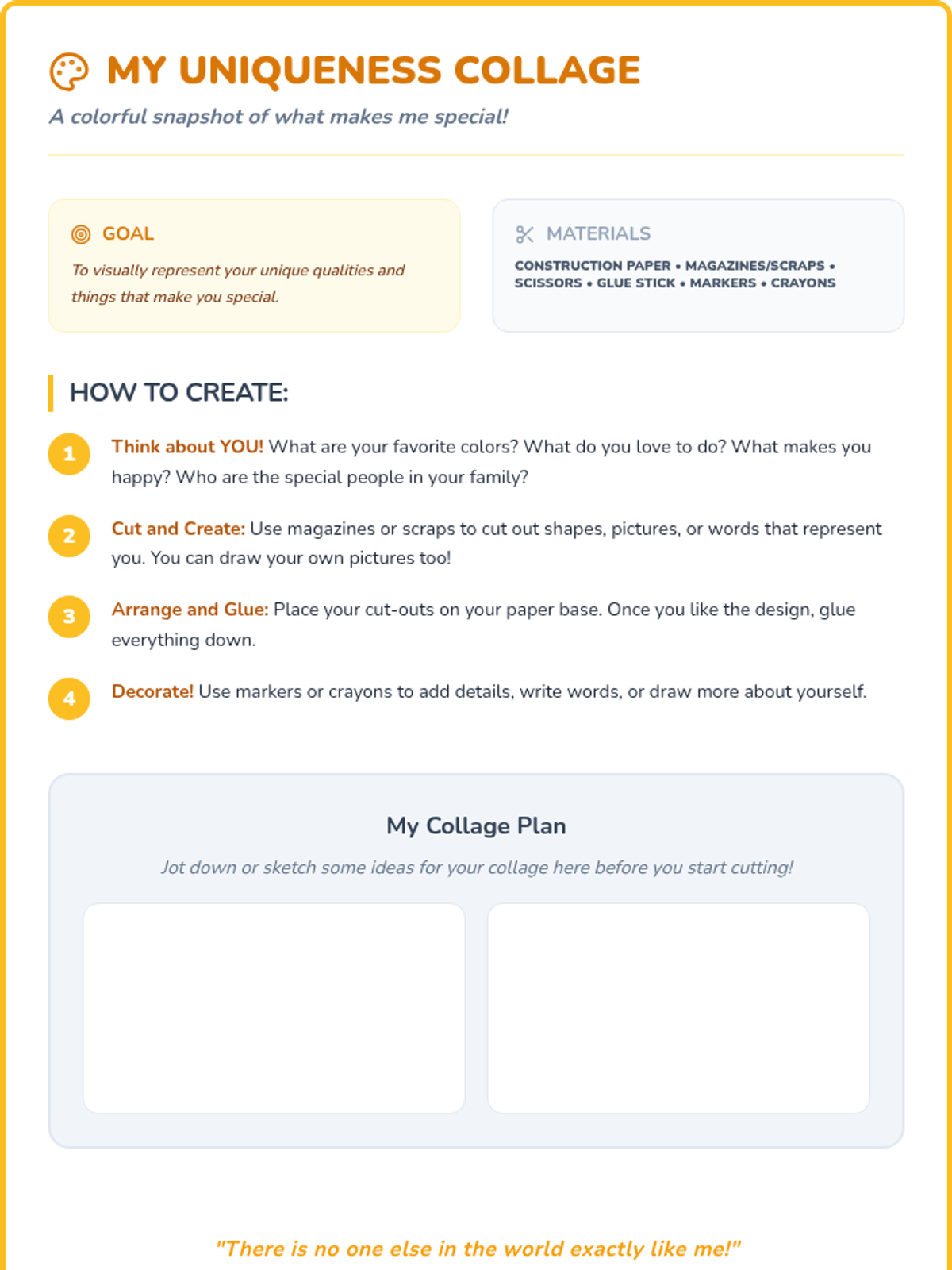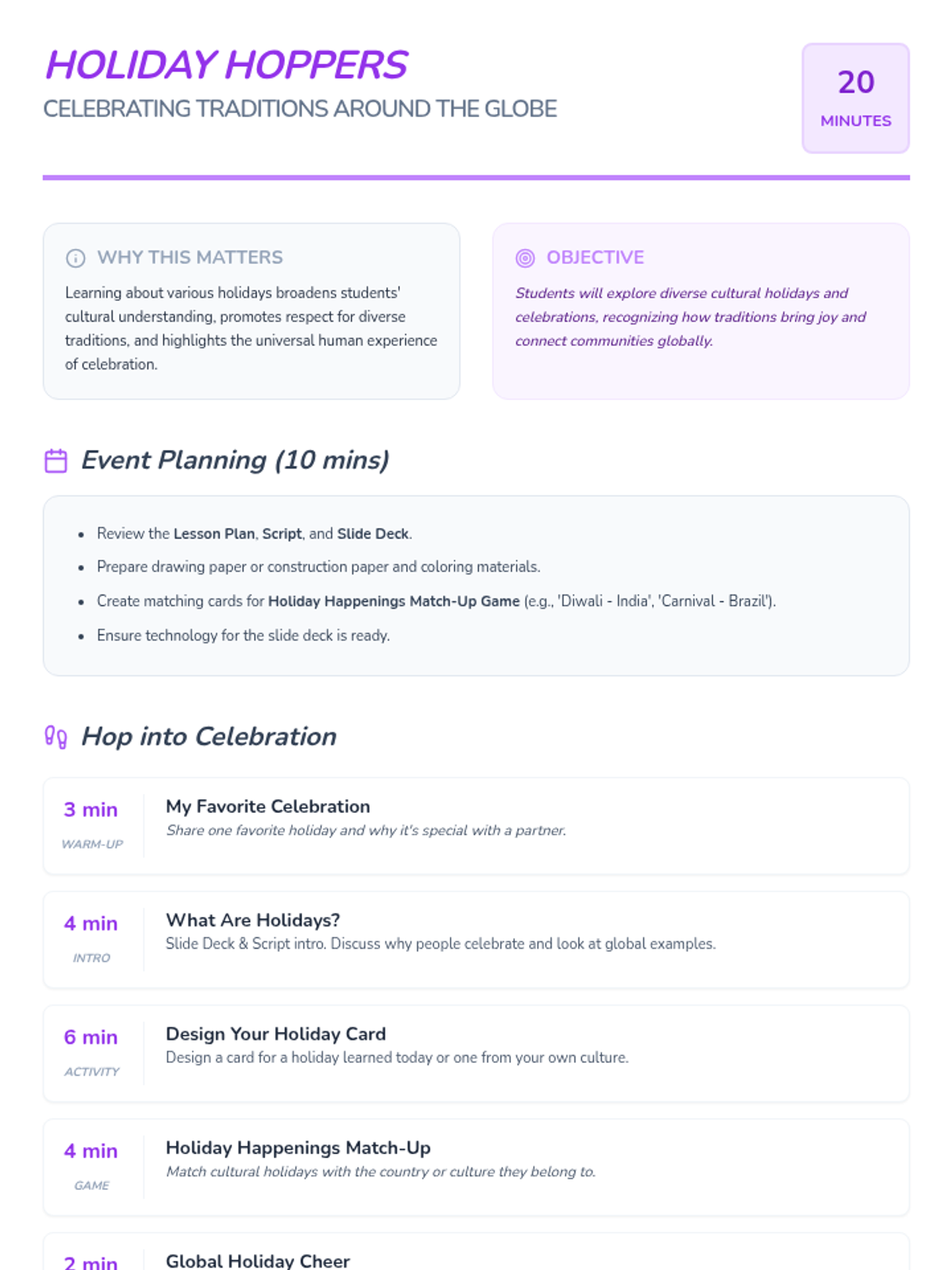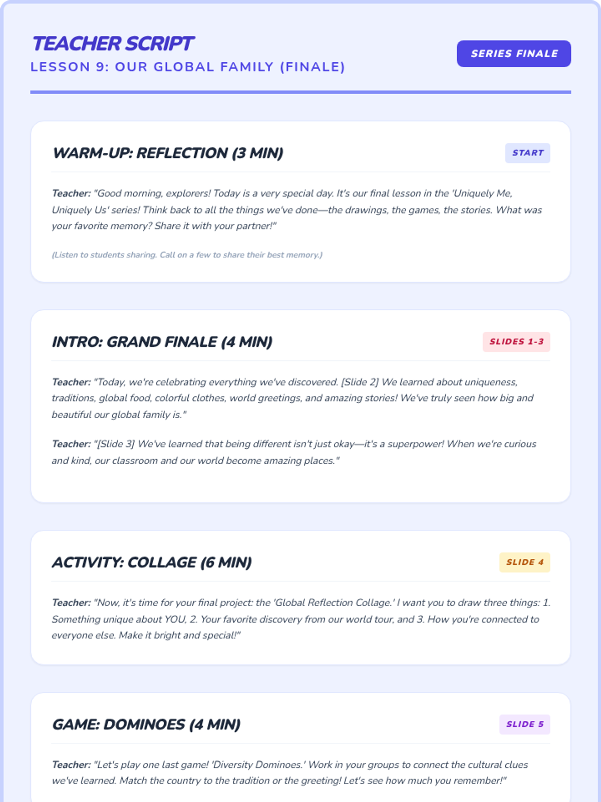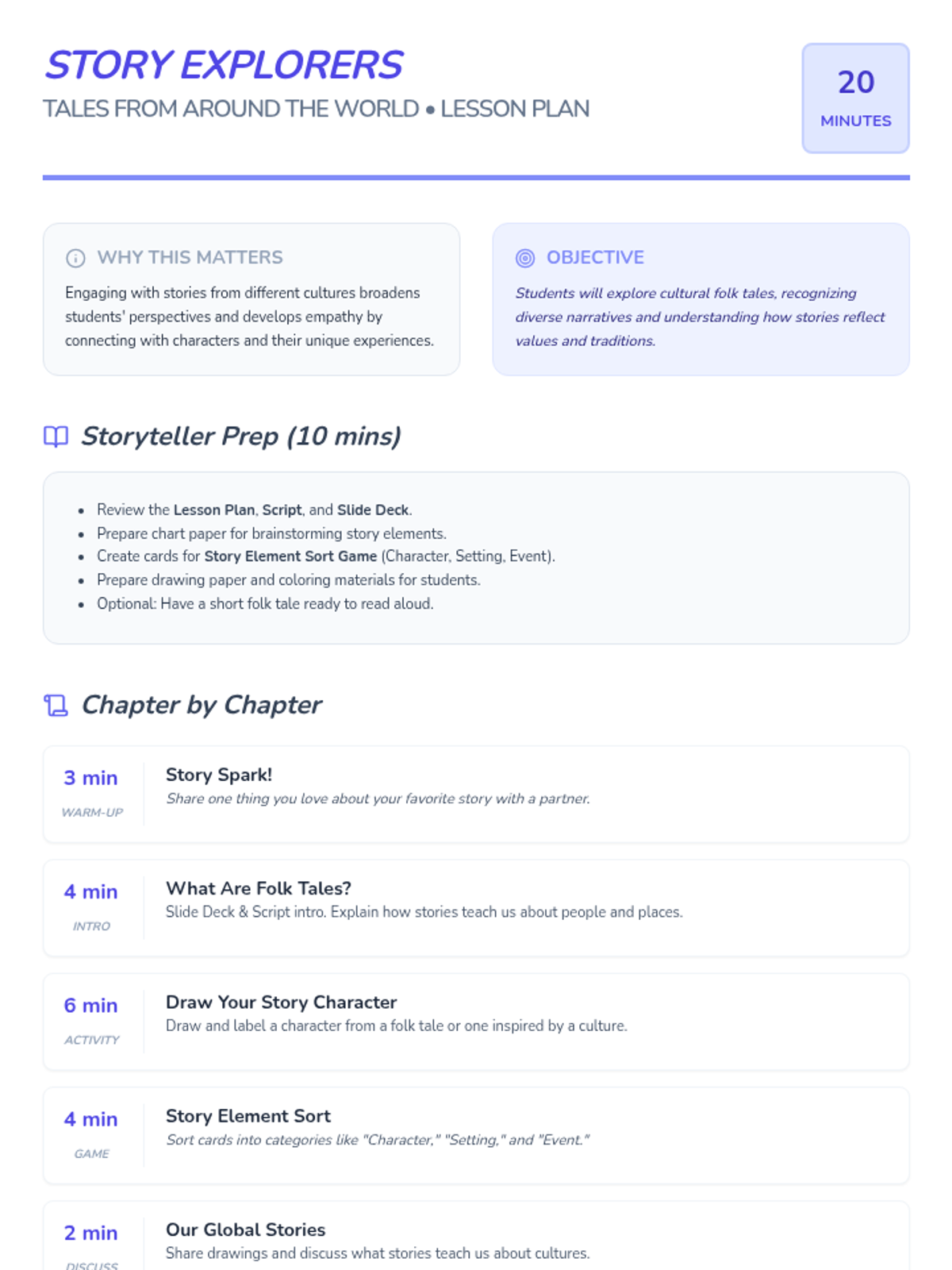 A sequence of 20-minute lessons for second-grade girls to explore culture, diversity, and uniqueness through interactive activities, discussions, and creative projects.