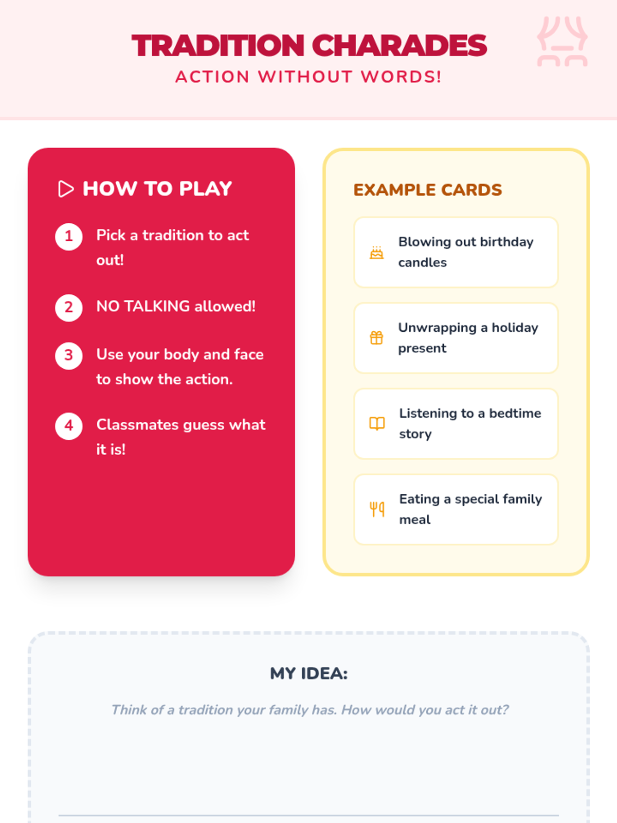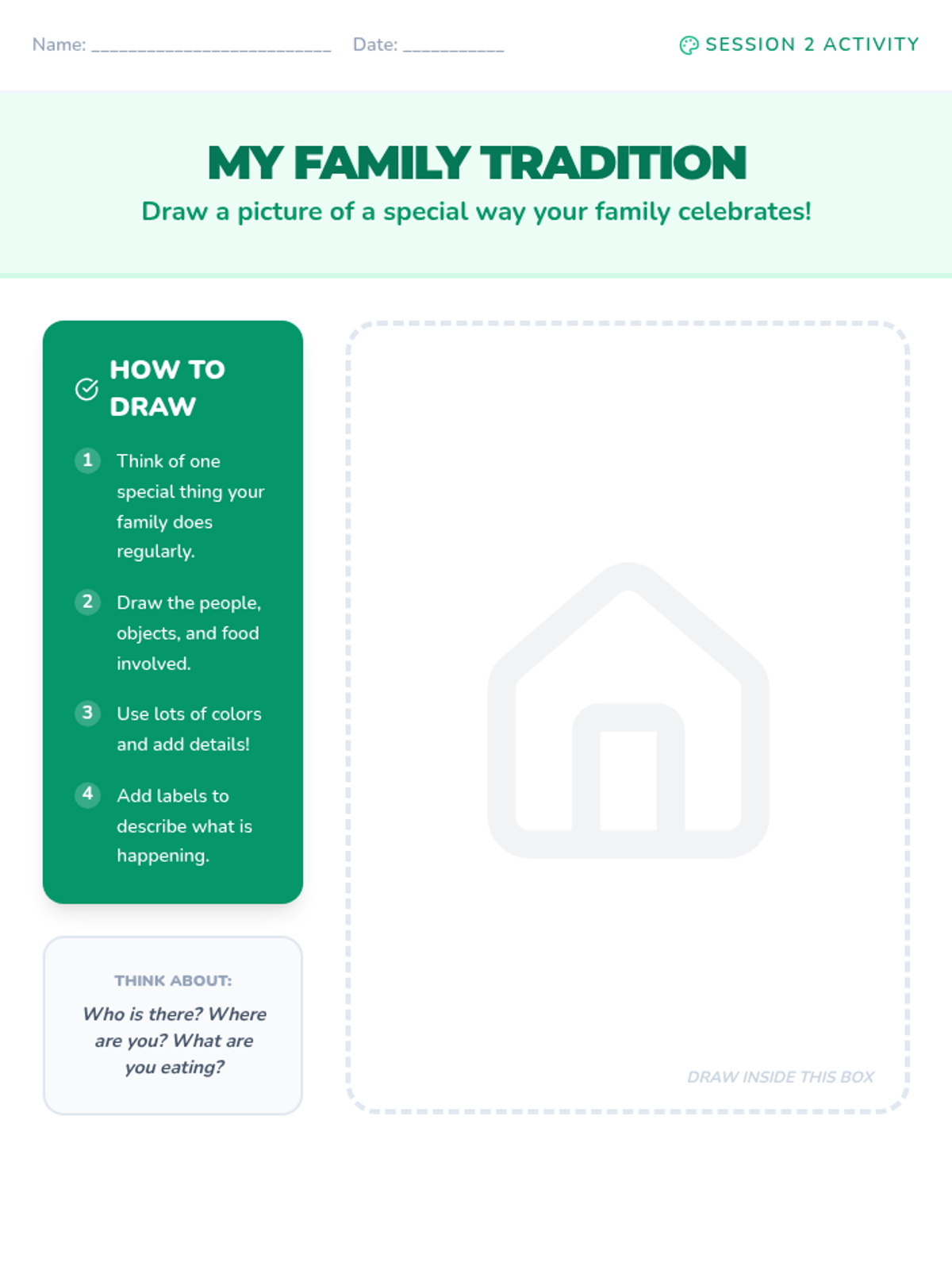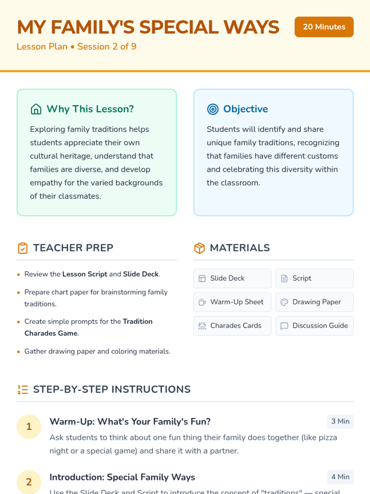 A 9-session lesson series for second-grade students exploring culture, diversity, and identity through interactive activities, discussions, and creative expression. Students learn to celebrate their own uniqueness while appreciating the varied traditions, foods, clothing, and stories of the global family.
