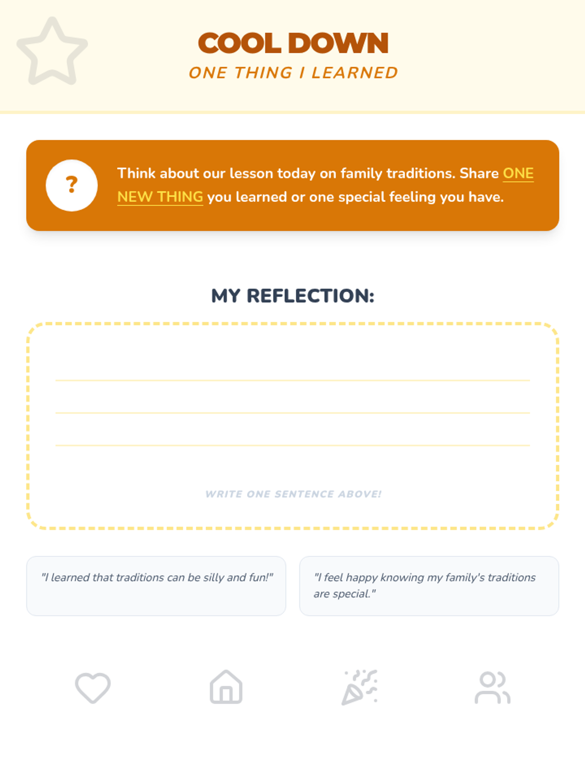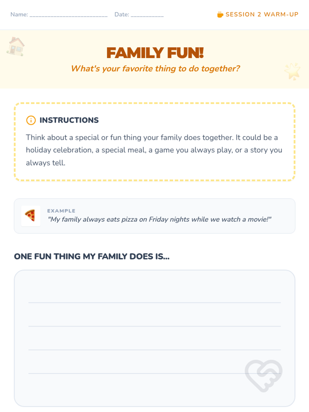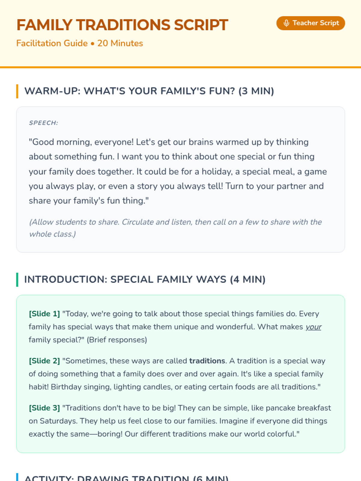 A 9-session lesson series for second-grade students exploring culture, diversity, and identity through interactive activities, discussions, and creative expression. Students learn to celebrate their own uniqueness while appreciating the varied traditions, foods, clothing, and stories of the global family.