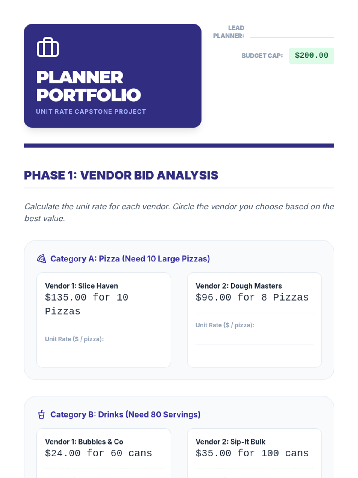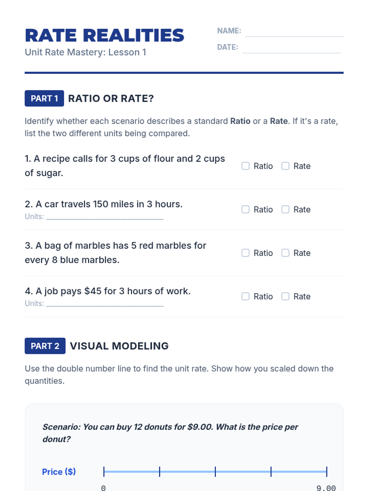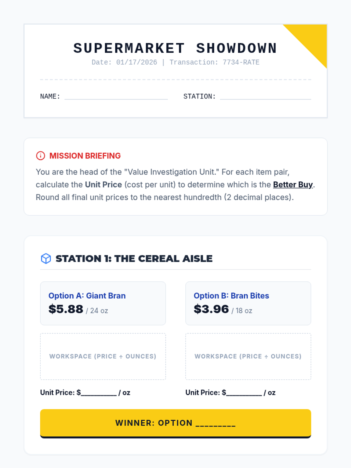 This sequence guides 7th-grade students through the practical application of unit rates to solve real-world problems involving pricing, speed, and measurement. Students explore ratios, complex fractions, comparative shopping, and graphing proportional relationships, culminating in a budgeting project.