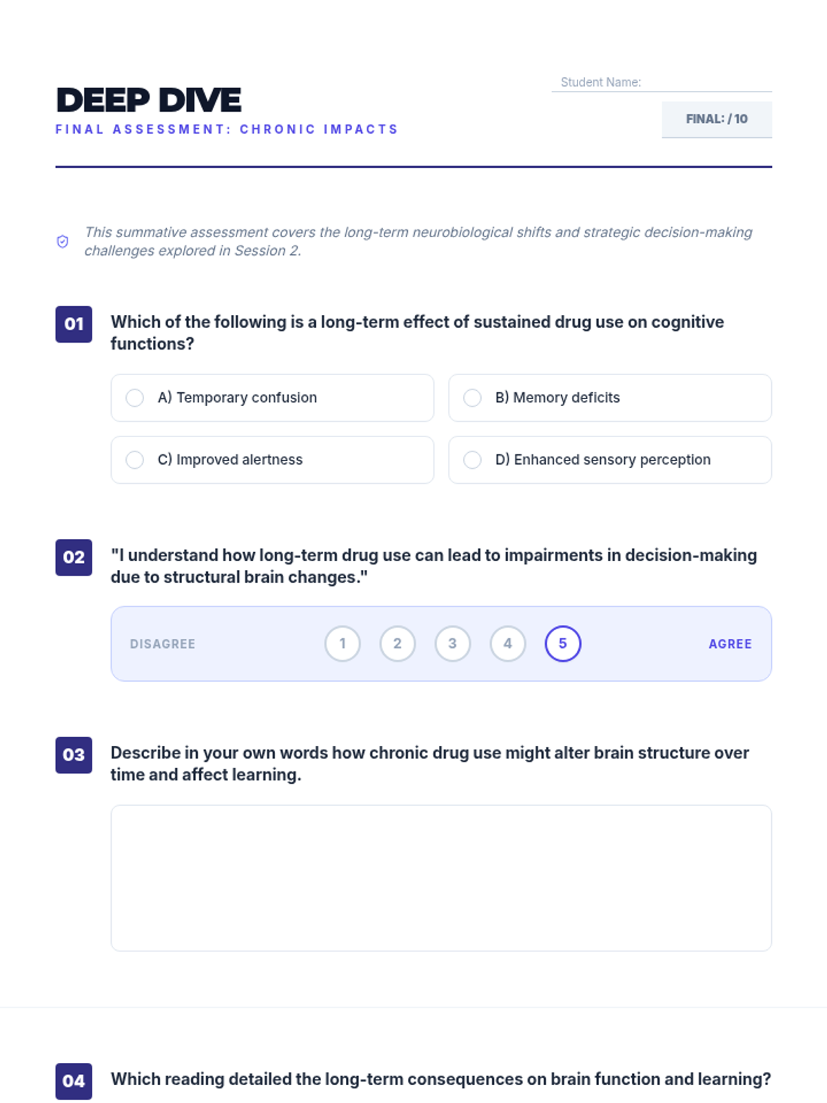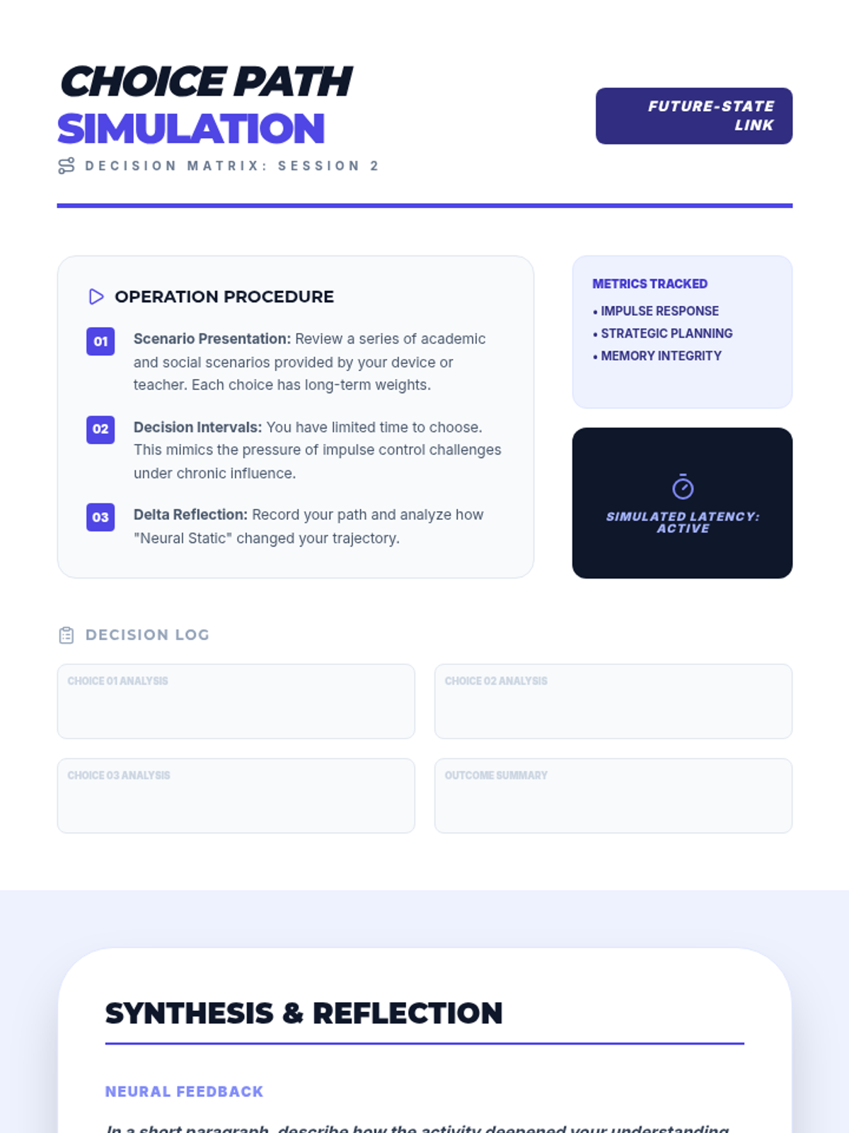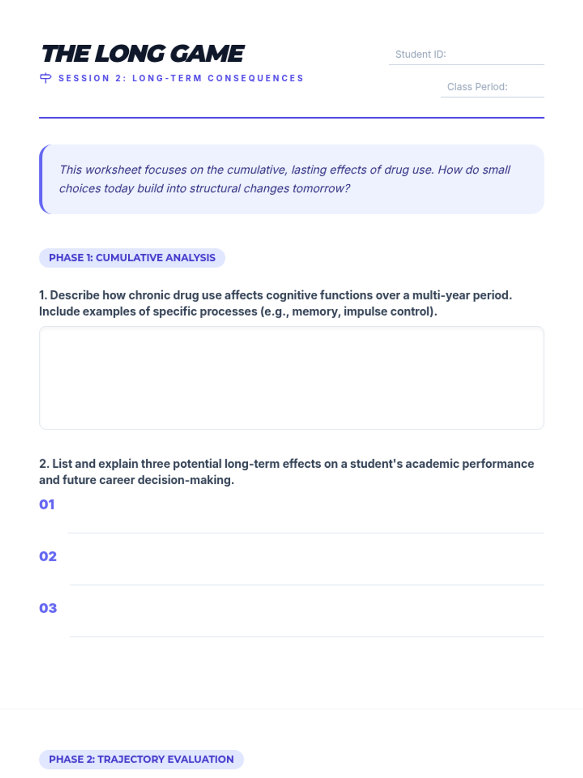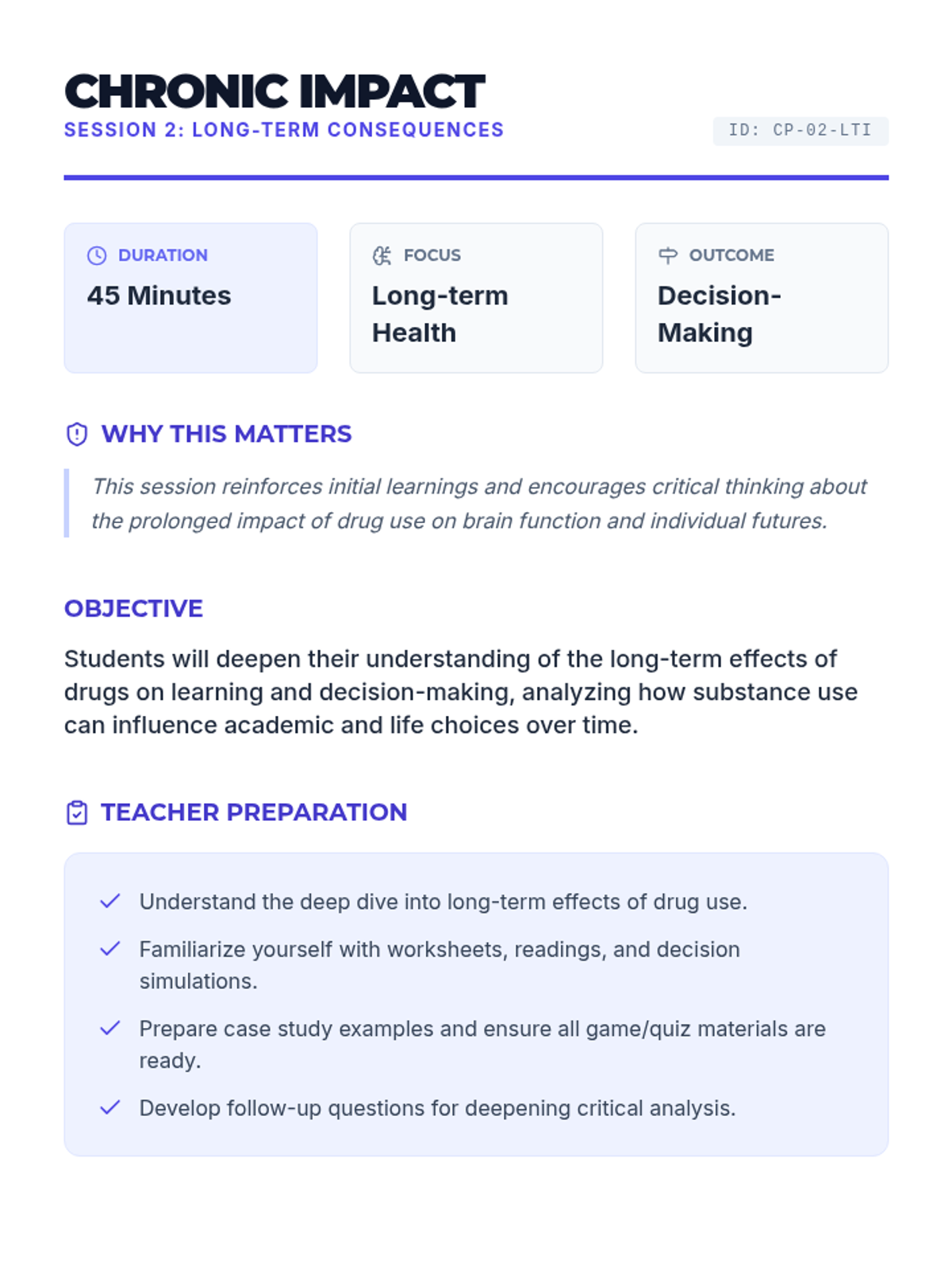 A two-session high school health sequence exploring the immediate and long-term neurobiological impacts of drug use on learning, memory, and decision-making.