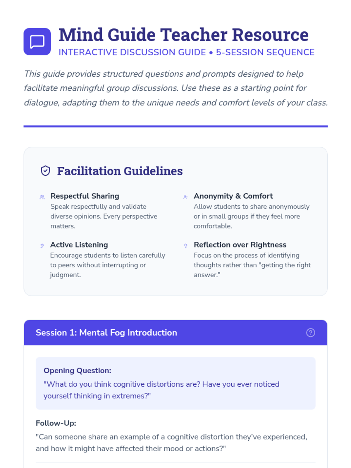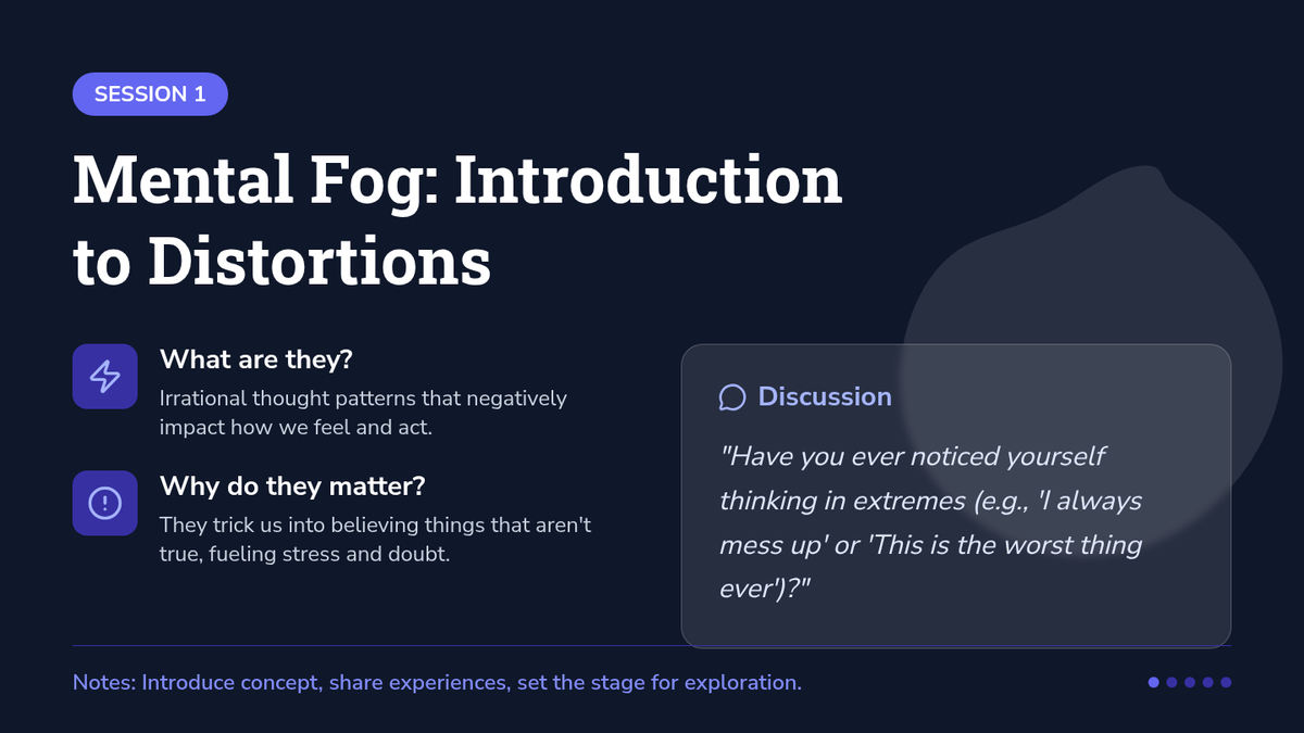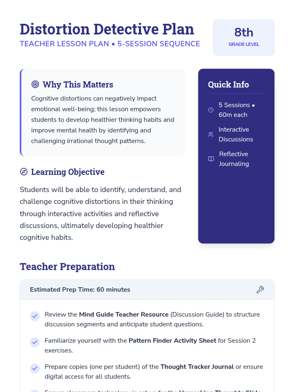 This 5-session sequence for 8th graders focuses on identifying and challenging cognitive distortions, which are irrational thought patterns that can negatively impact mental health. Through interactive activities and discussions, students will learn to recognize these distortions in their own thinking and develop healthier cognitive habits.