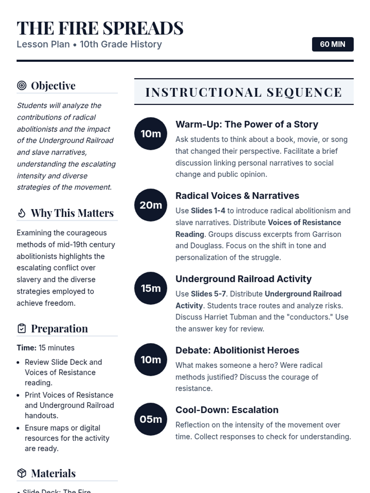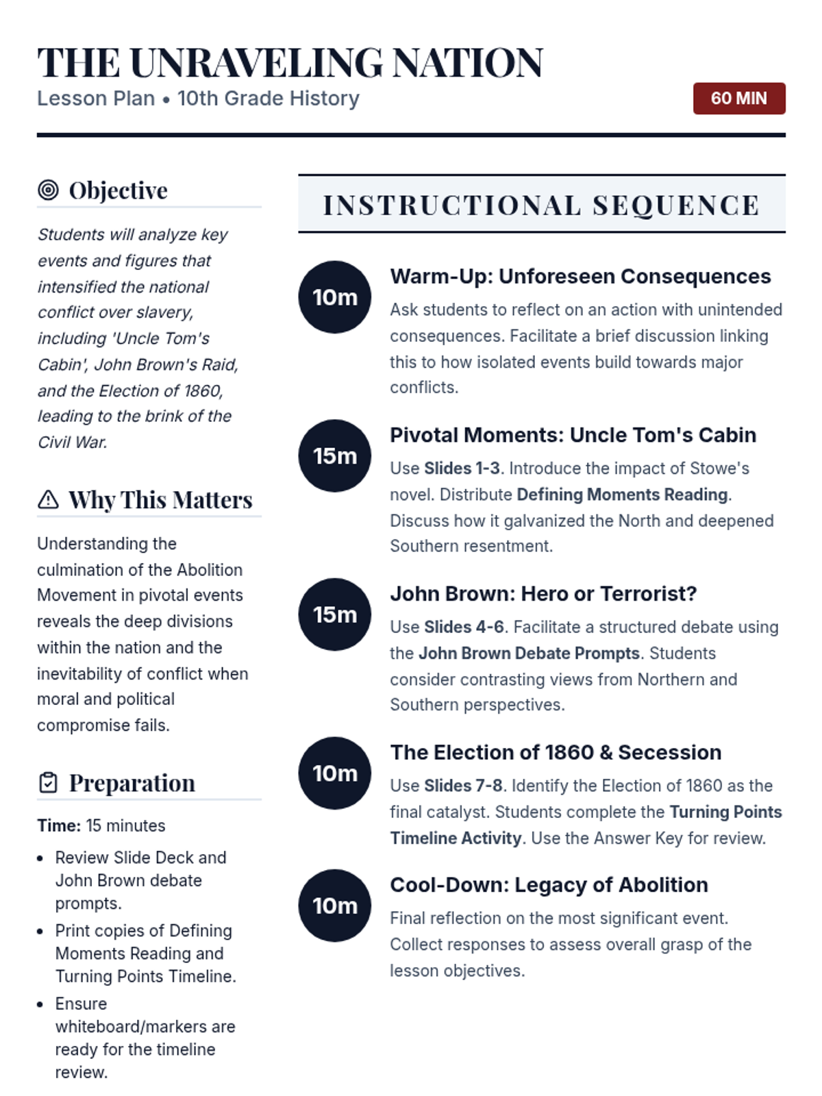 This comprehensive three-part sequence explores the evolution of the Abolition Movement in the United States, from its early moral foundations and Quaker roots to the radicalized activism of the mid-19th century and the final pivotal events that triggered the Civil War.
