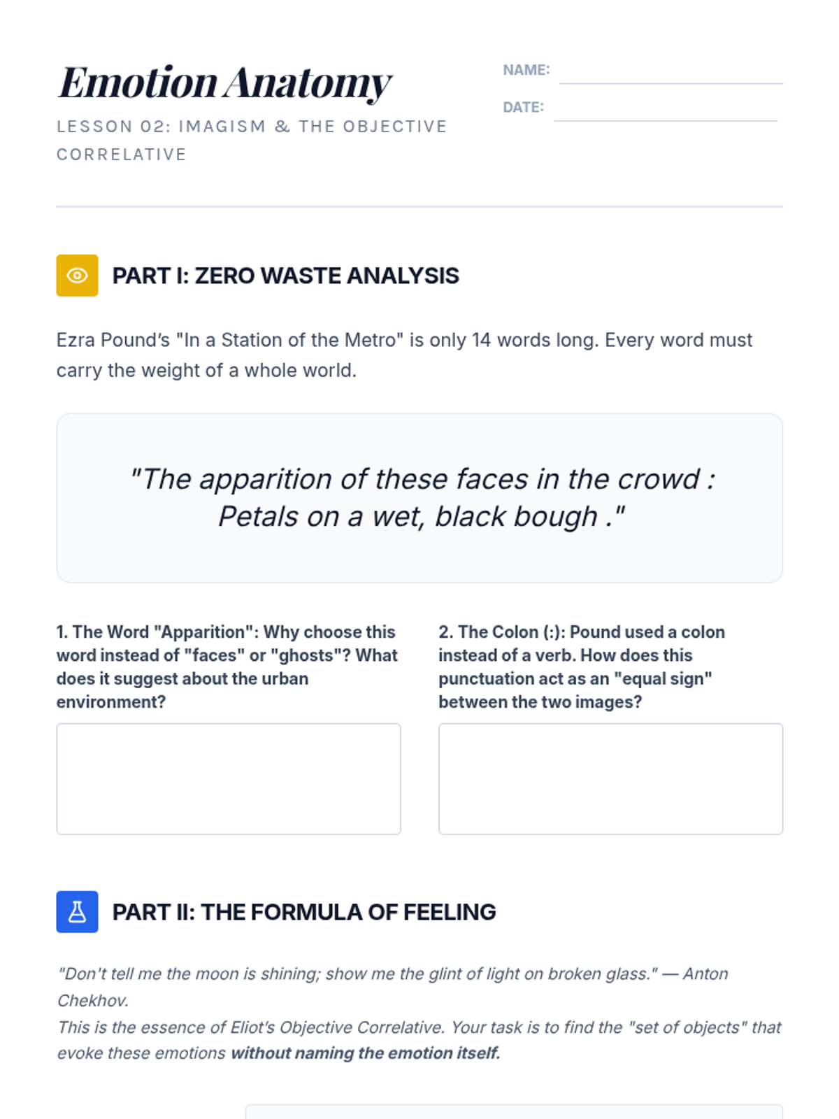A high-level exploration of poetry for 12th-grade students, focusing on the transition from the intellectual rigor of Metaphysical conceits to the sensory precision of Modernist Imagism. Students analyze how poets use imagery and figurative language to bridge the gap between the concrete world and abstract human experience.