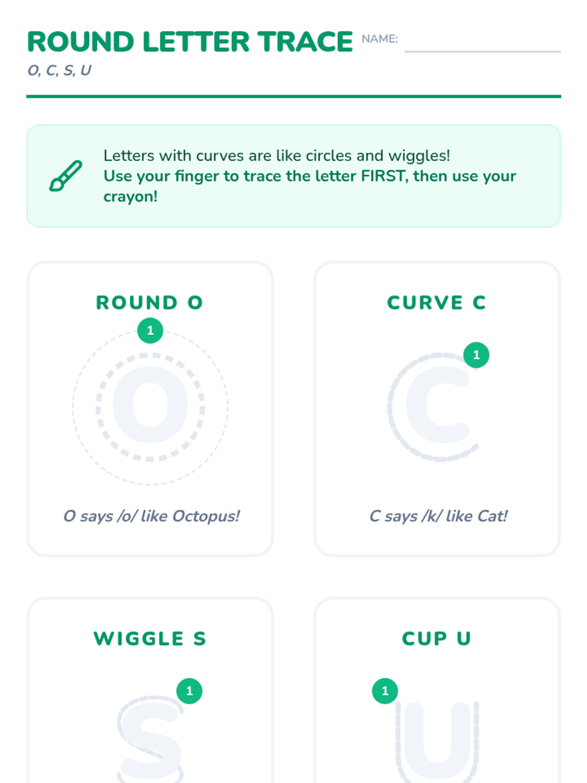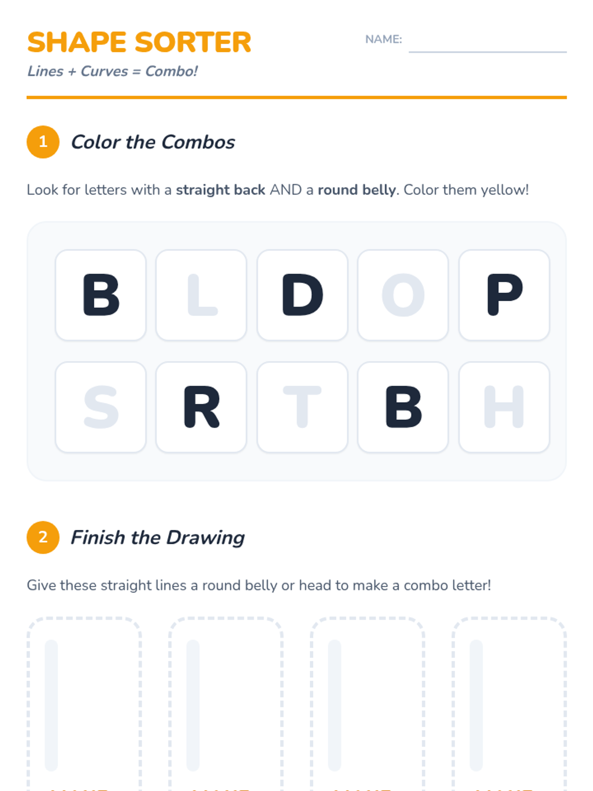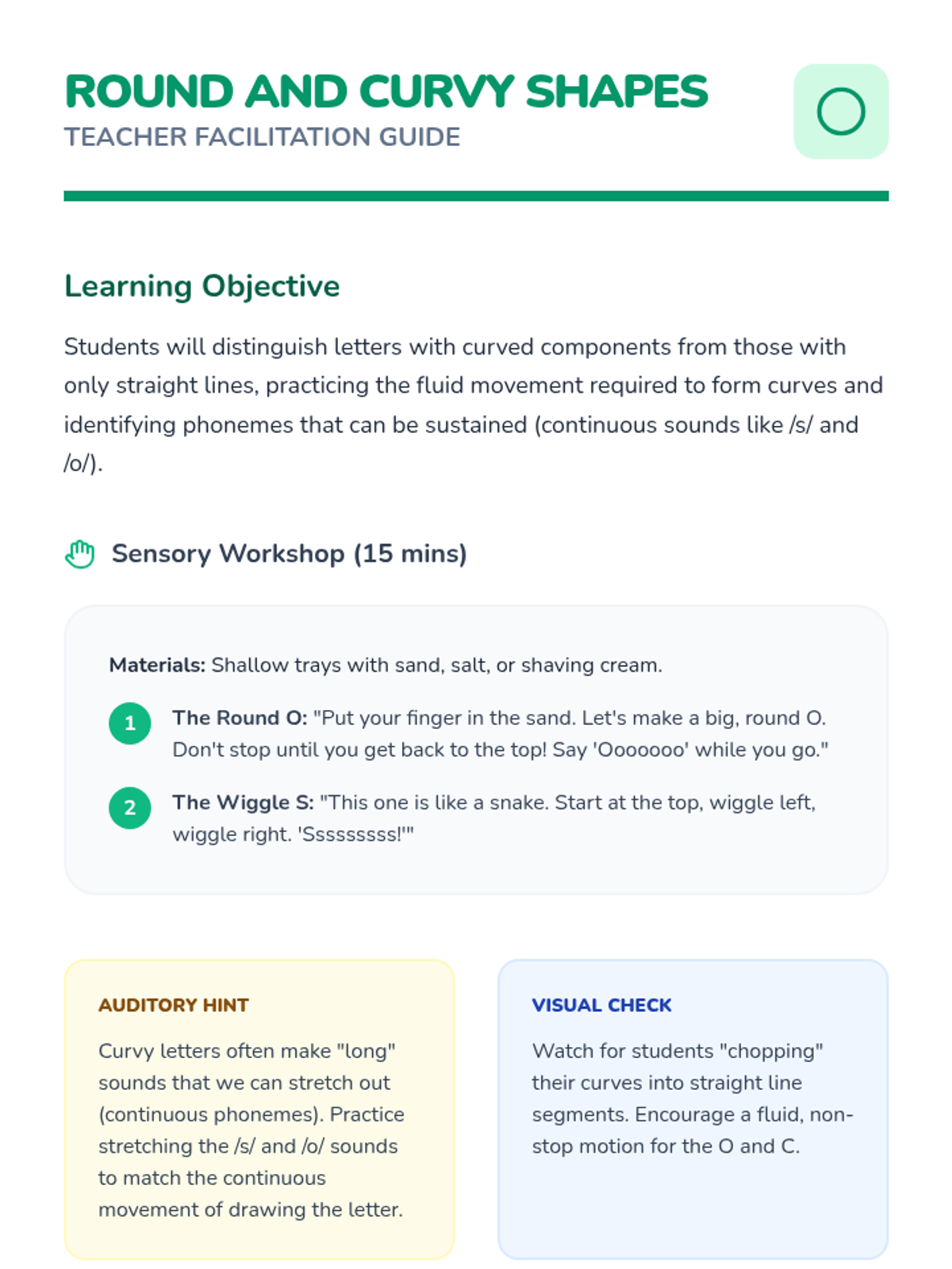This sequence introduces Pre-K students to uppercase letters by categorizing them based on their shape features (straight lines vs. curves). Students develop visual discrimination and letter-sound correspondence through hands-on activities, sorting, and guided practice.