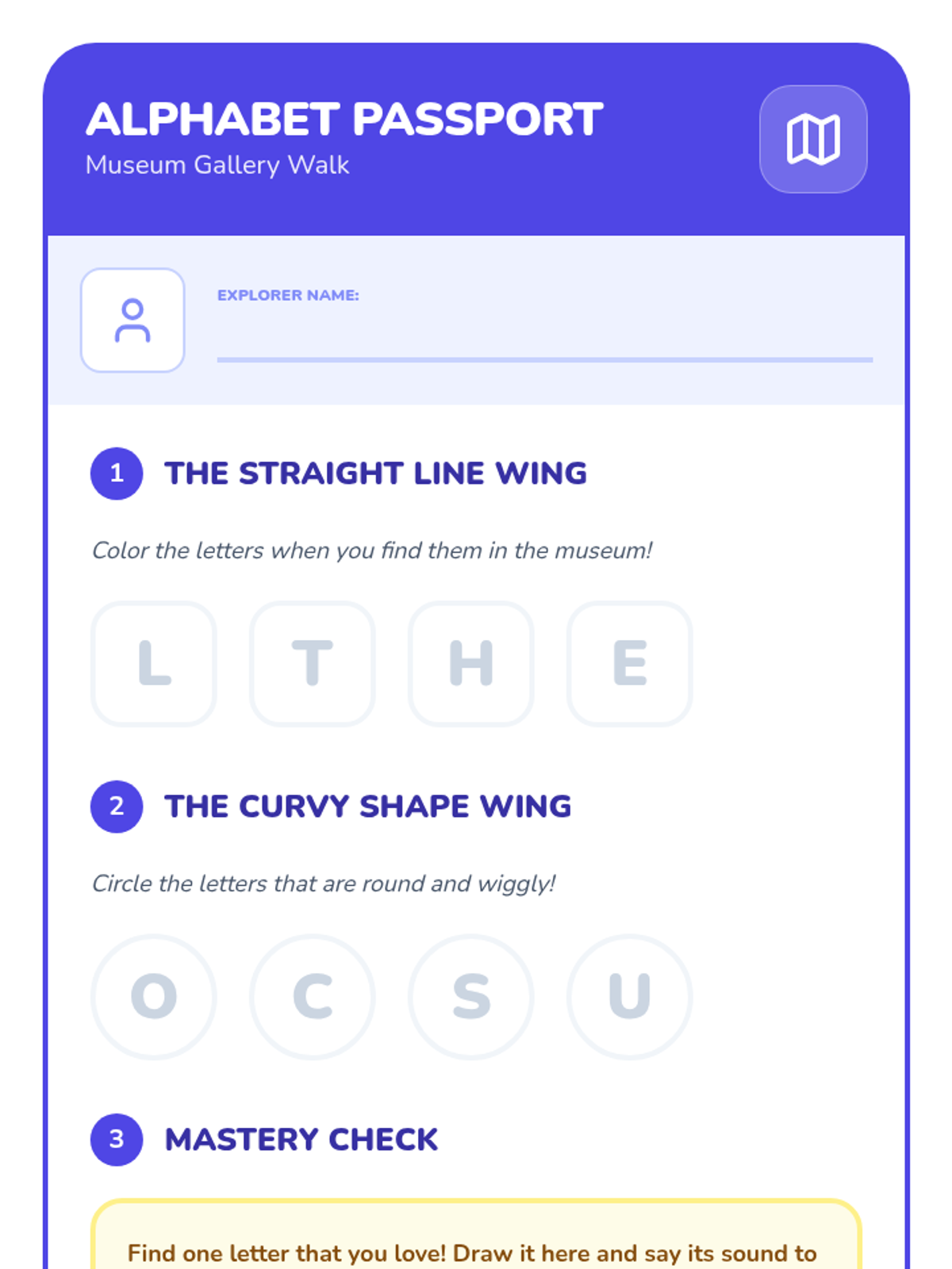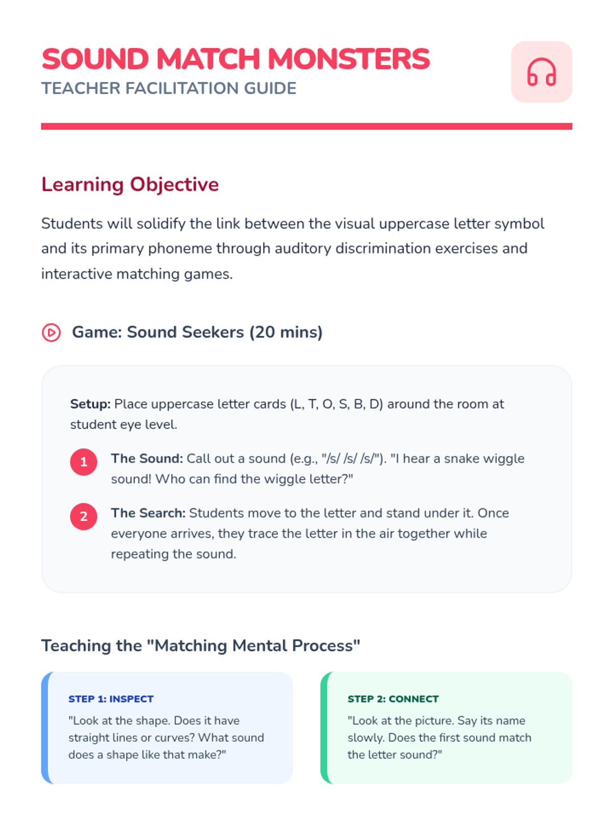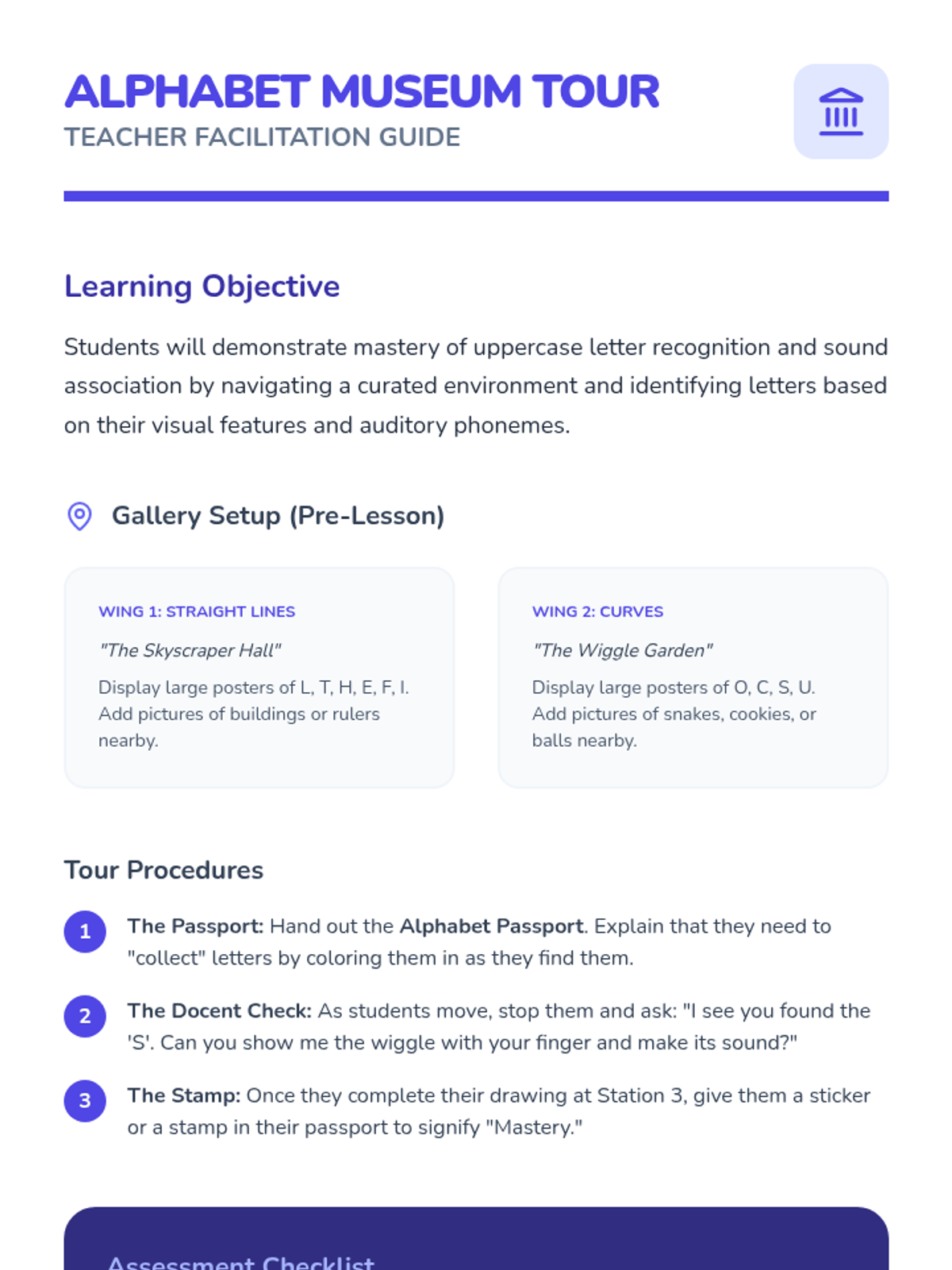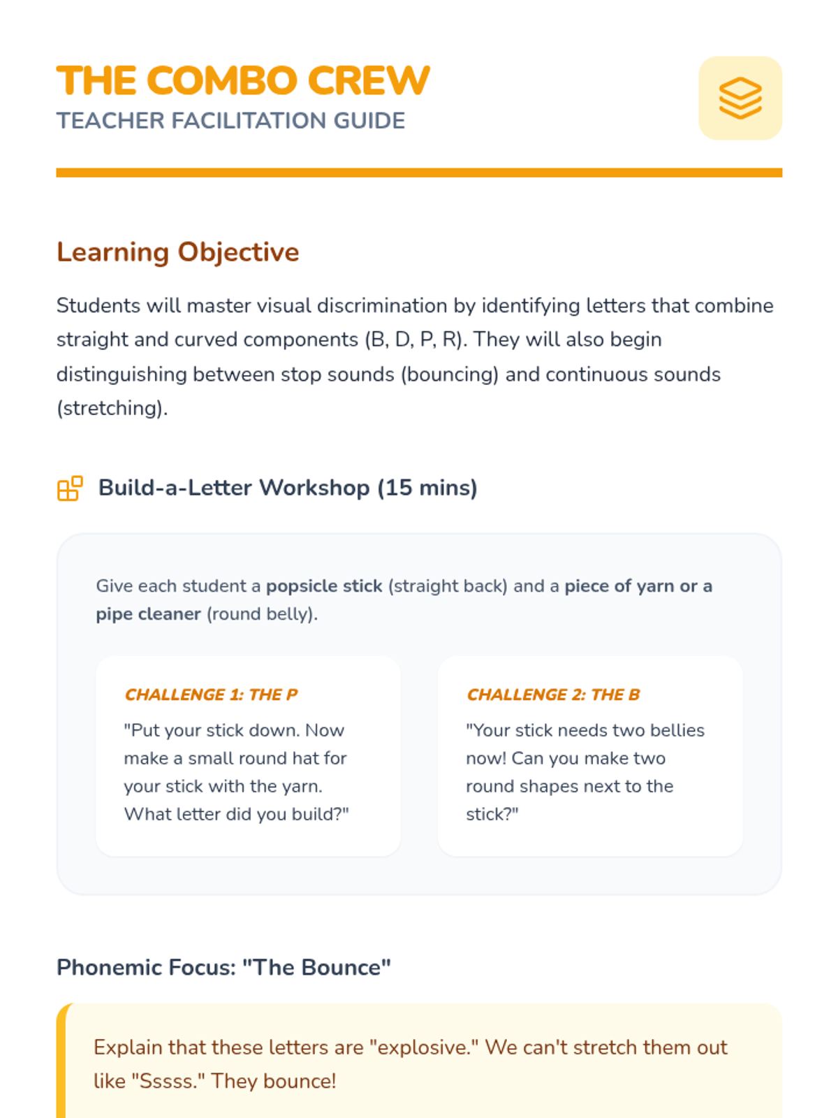 This sequence introduces Pre-K students to uppercase letters by categorizing them based on their shape features (straight lines vs. curves). Students develop visual discrimination and letter-sound correspondence through hands-on activities, sorting, and guided practice.