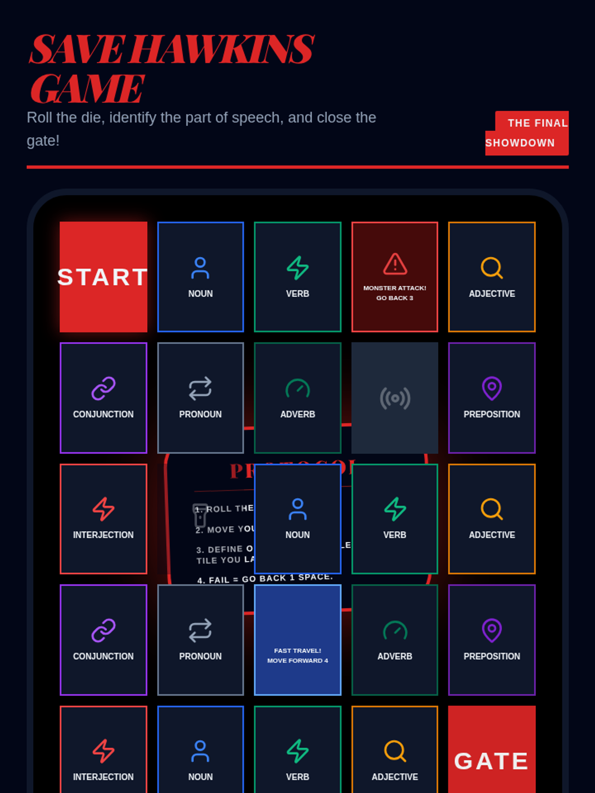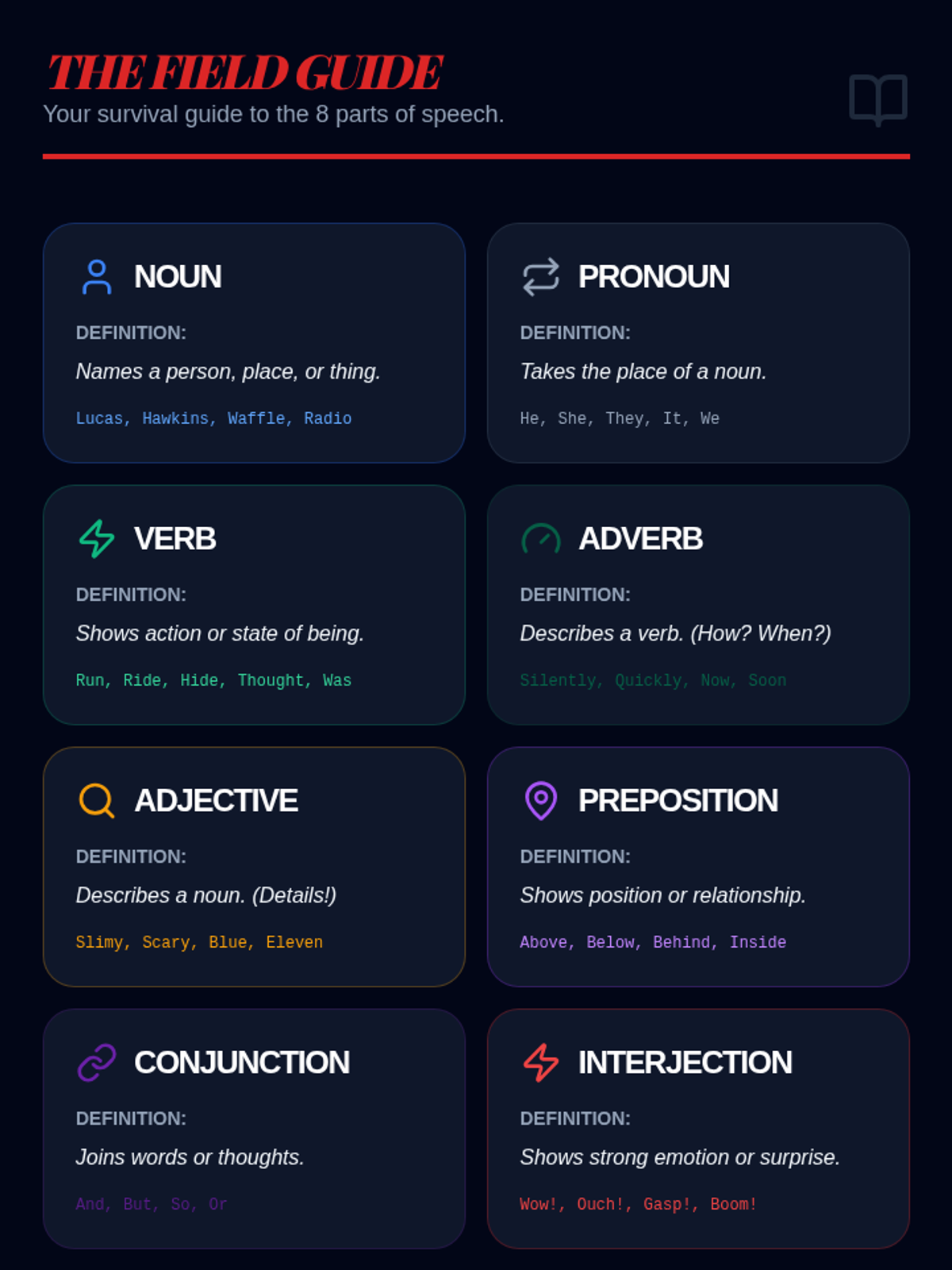 A retro, synthwave-inspired grammar unit for middle school resource room students. Students navigate the 'Upside Down' of parts of speech using themes of mystery, 80s nostalgia, and teamwork.