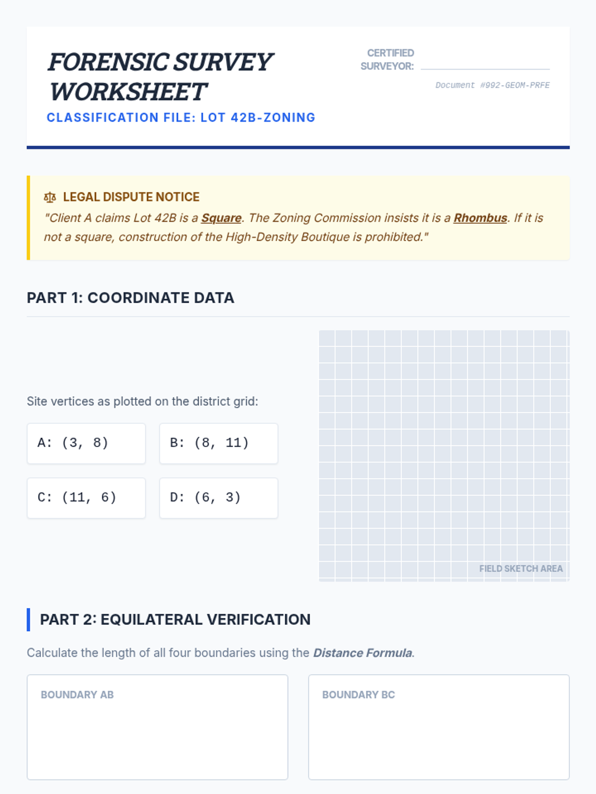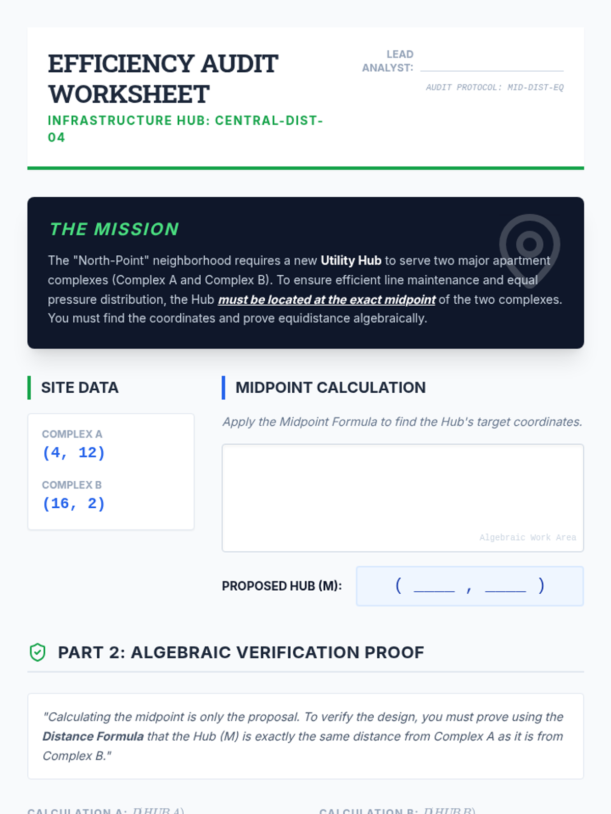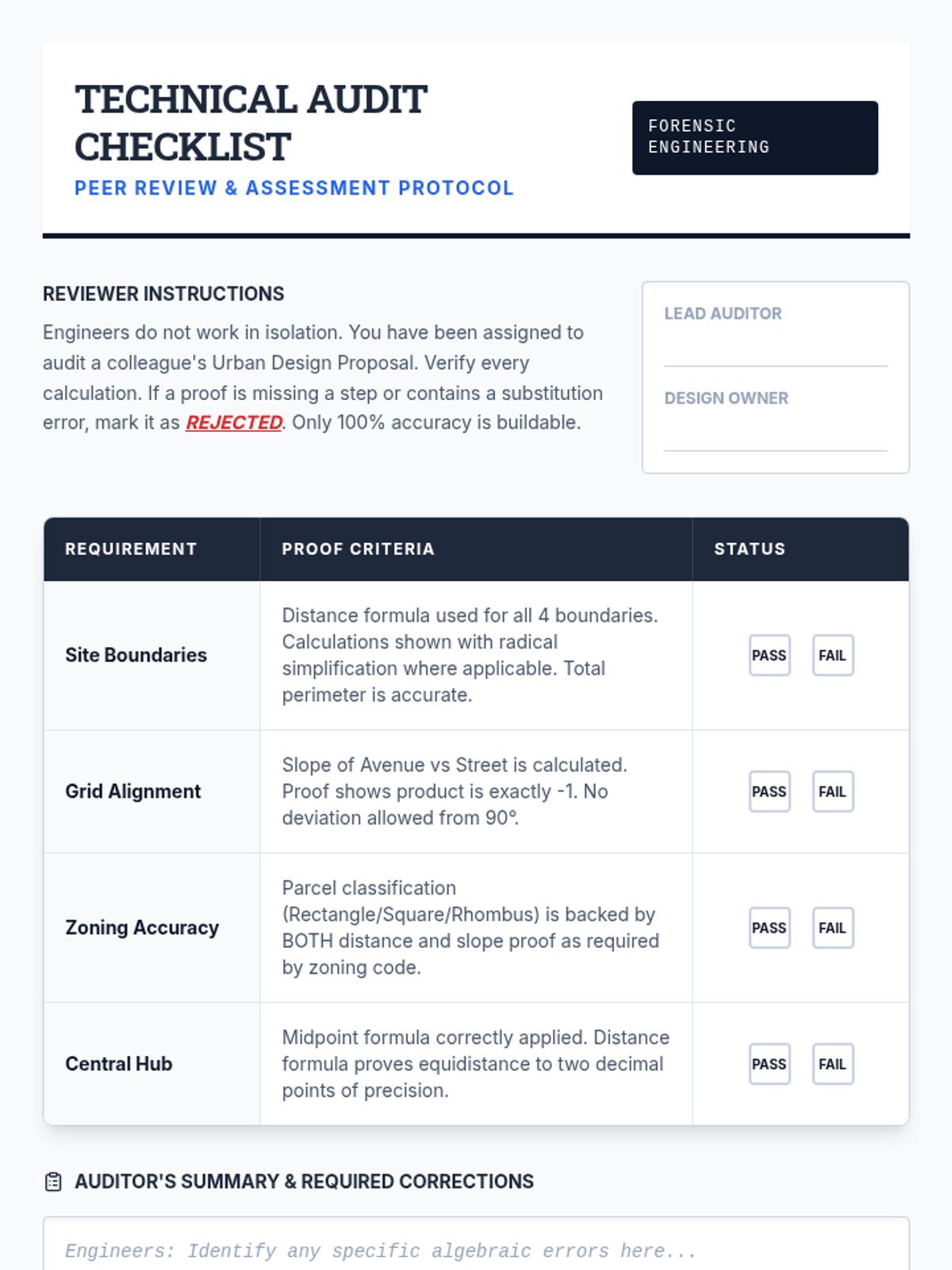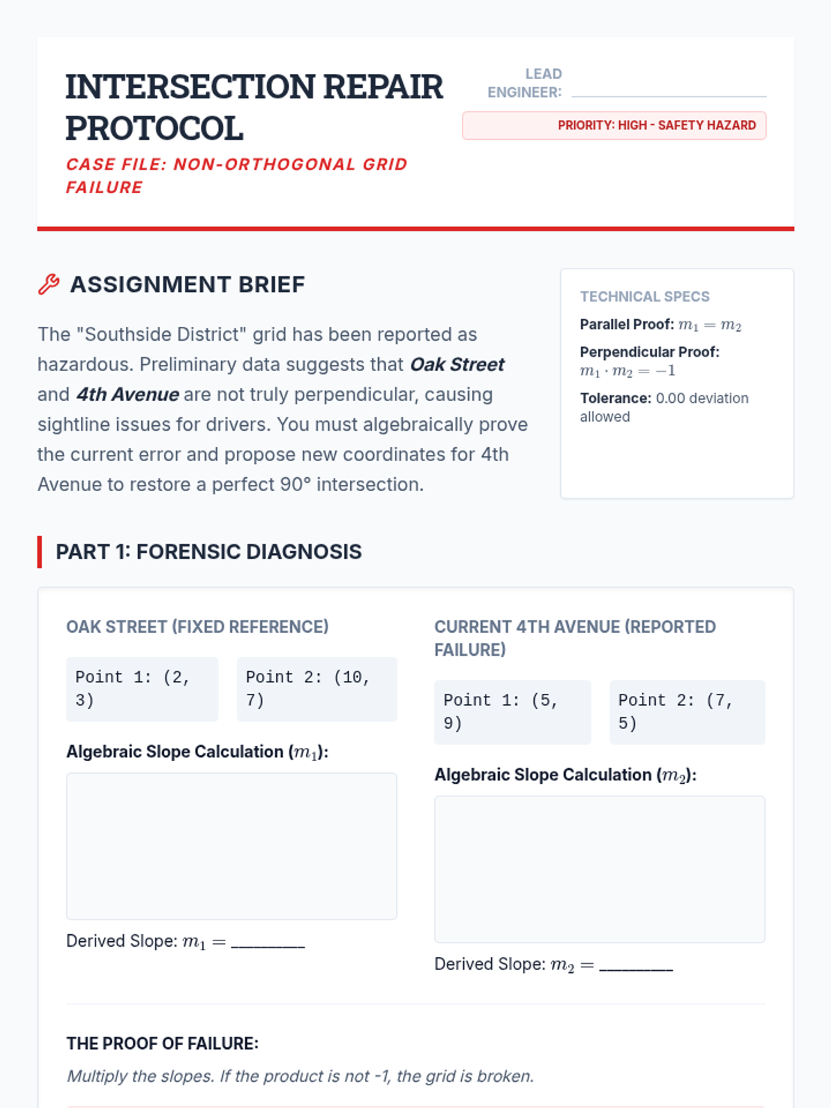 A project-based 12th-grade geometry sequence where students use coordinate geometry and algebraic proofs to design and verify urban layouts. Students act as civil engineers, proving theorems about distance, slope, midpoints, and polygons to justify infrastructure decisions.