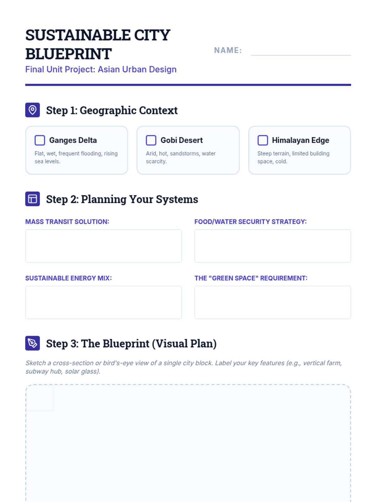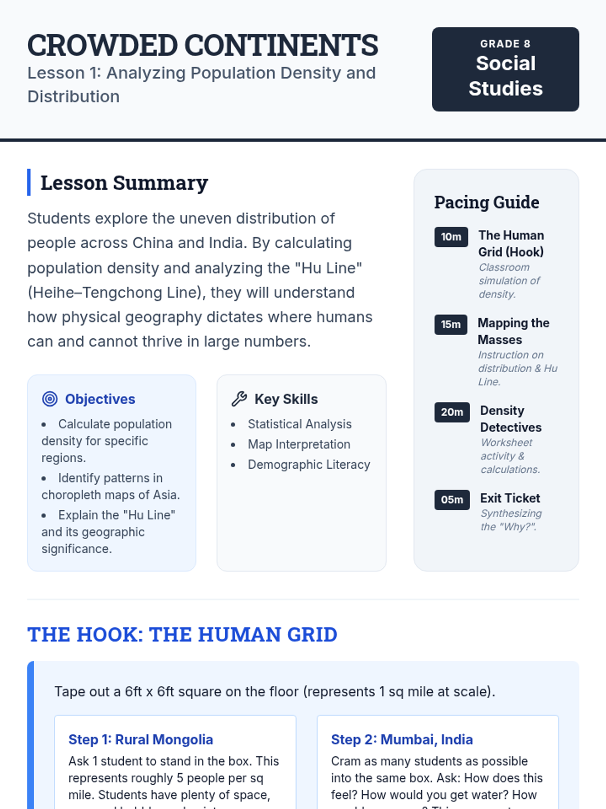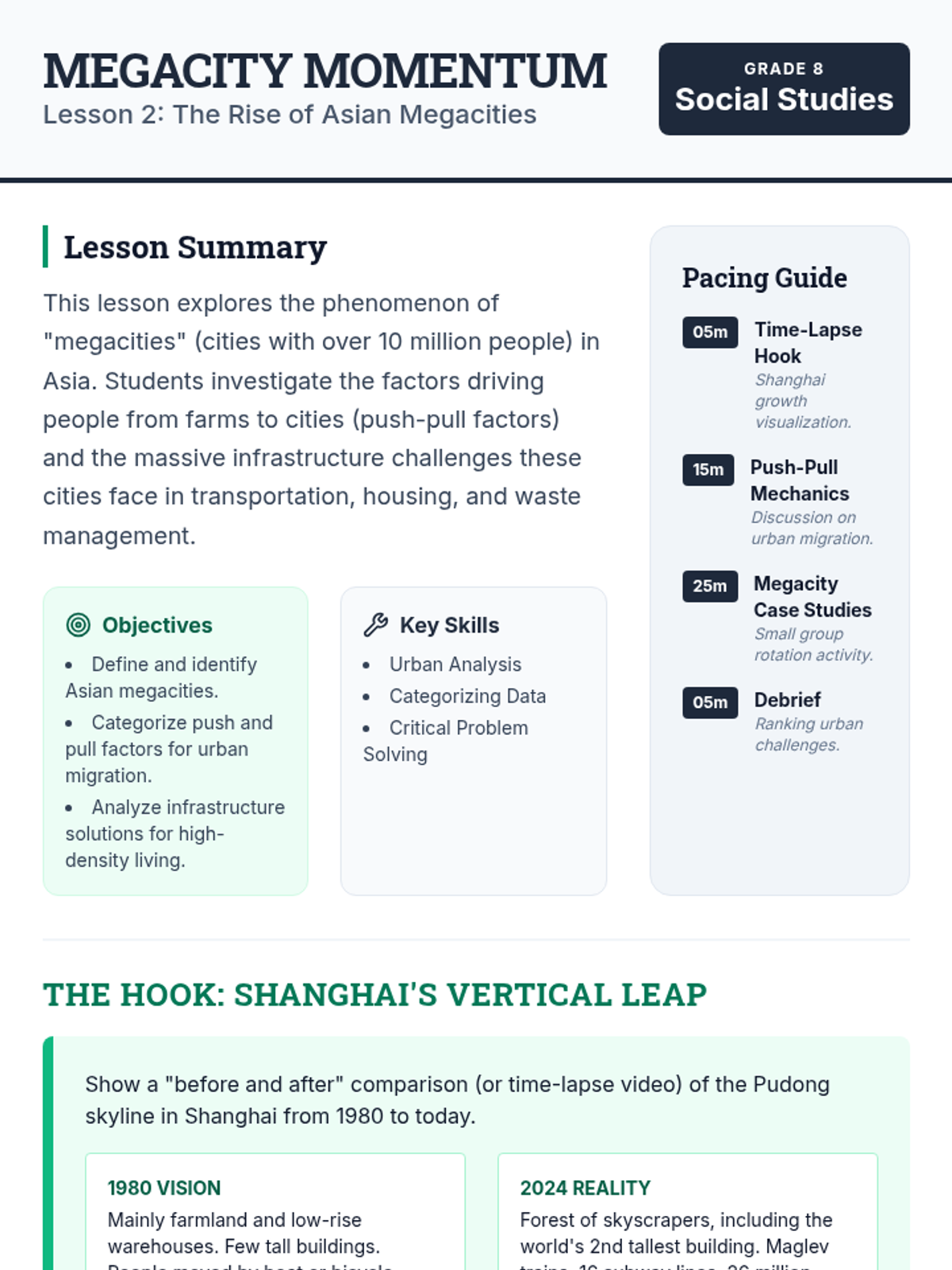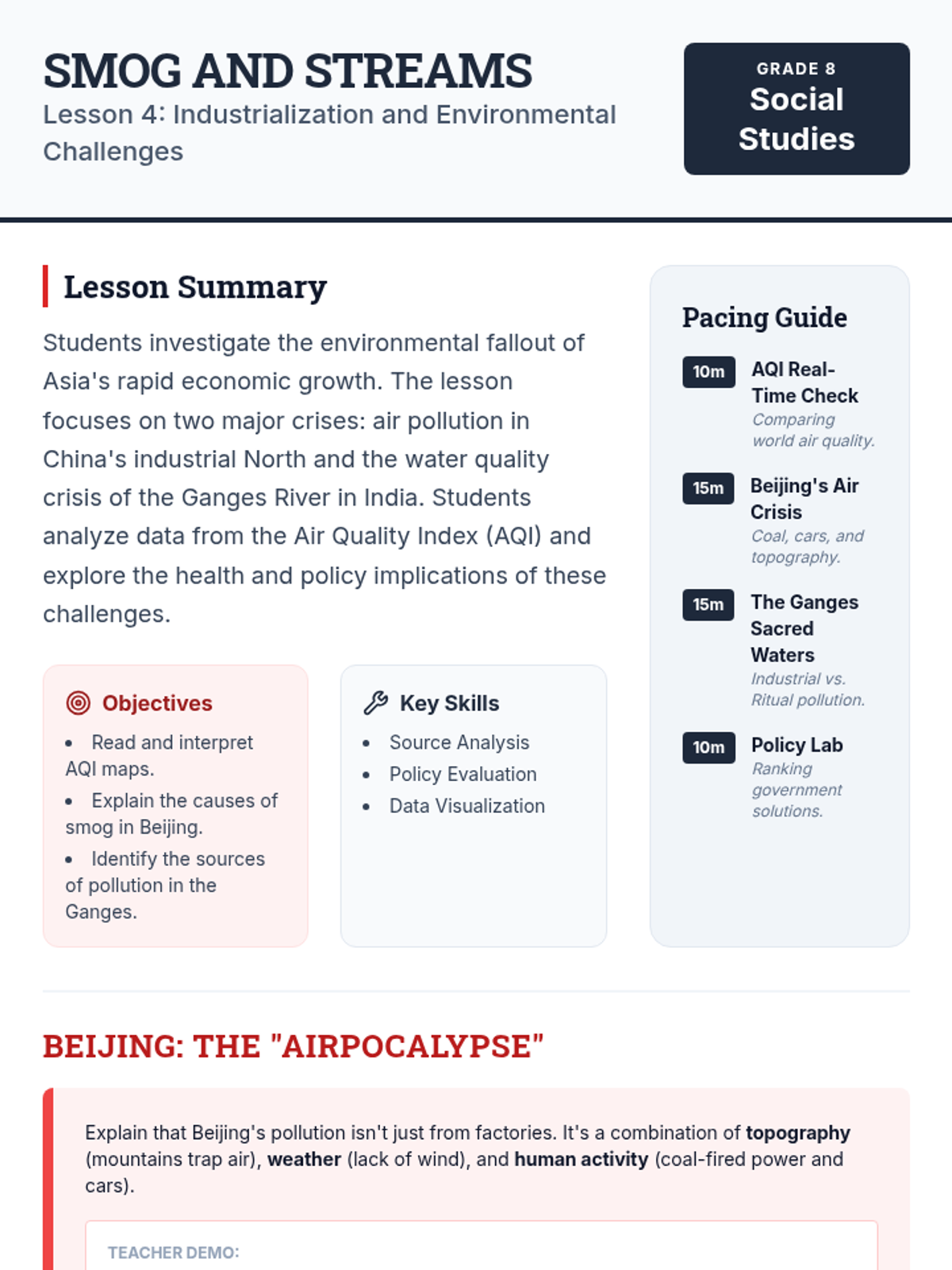This 8th-grade Social Studies sequence explores the intersection of human population growth and environmental modification in Asia. Students analyze population density, the rise of megacities, large-scale engineering projects like the Three Gorges Dam, and the environmental consequences of rapid industrialization, culminating in a sustainable urban design project.