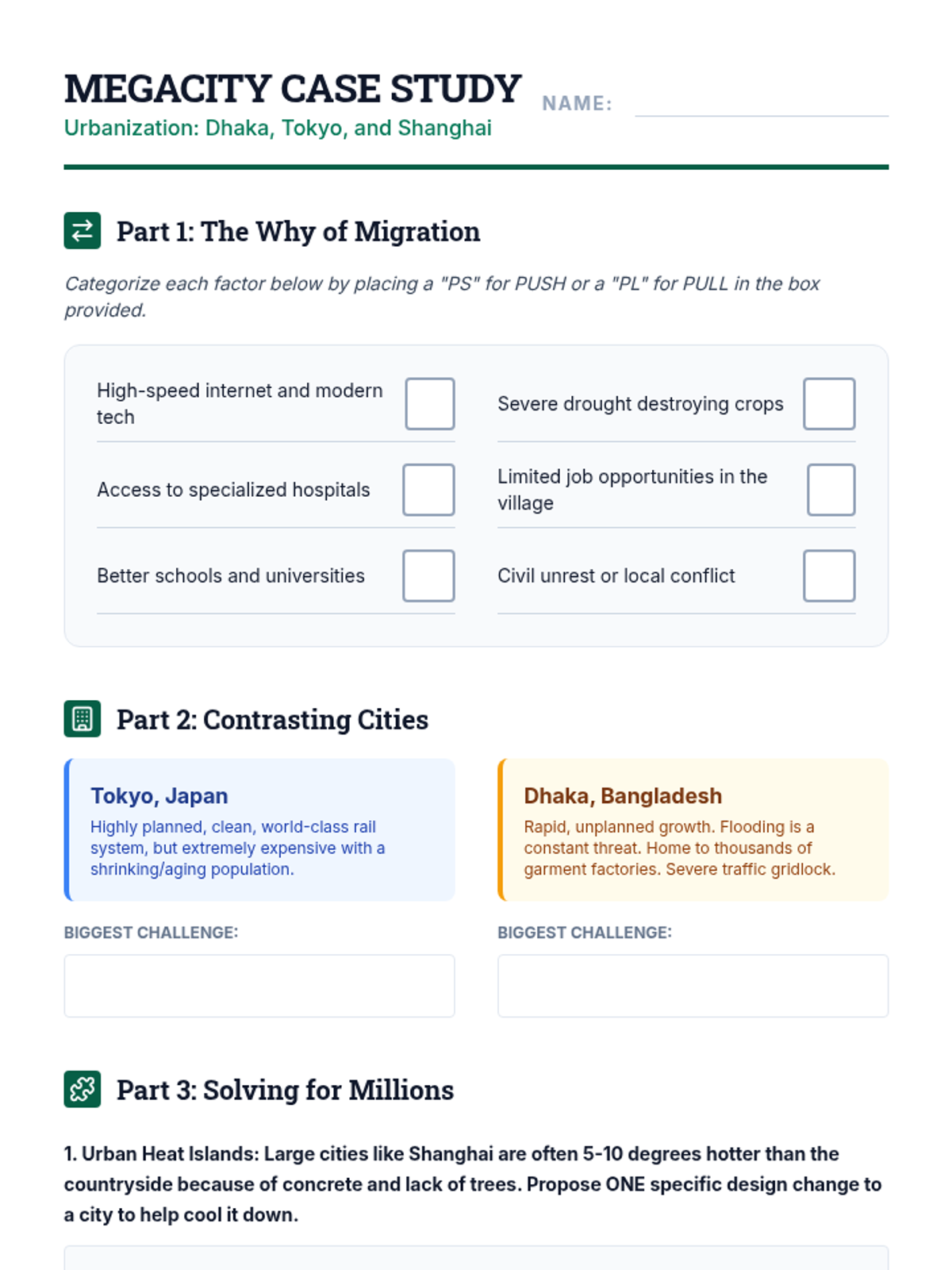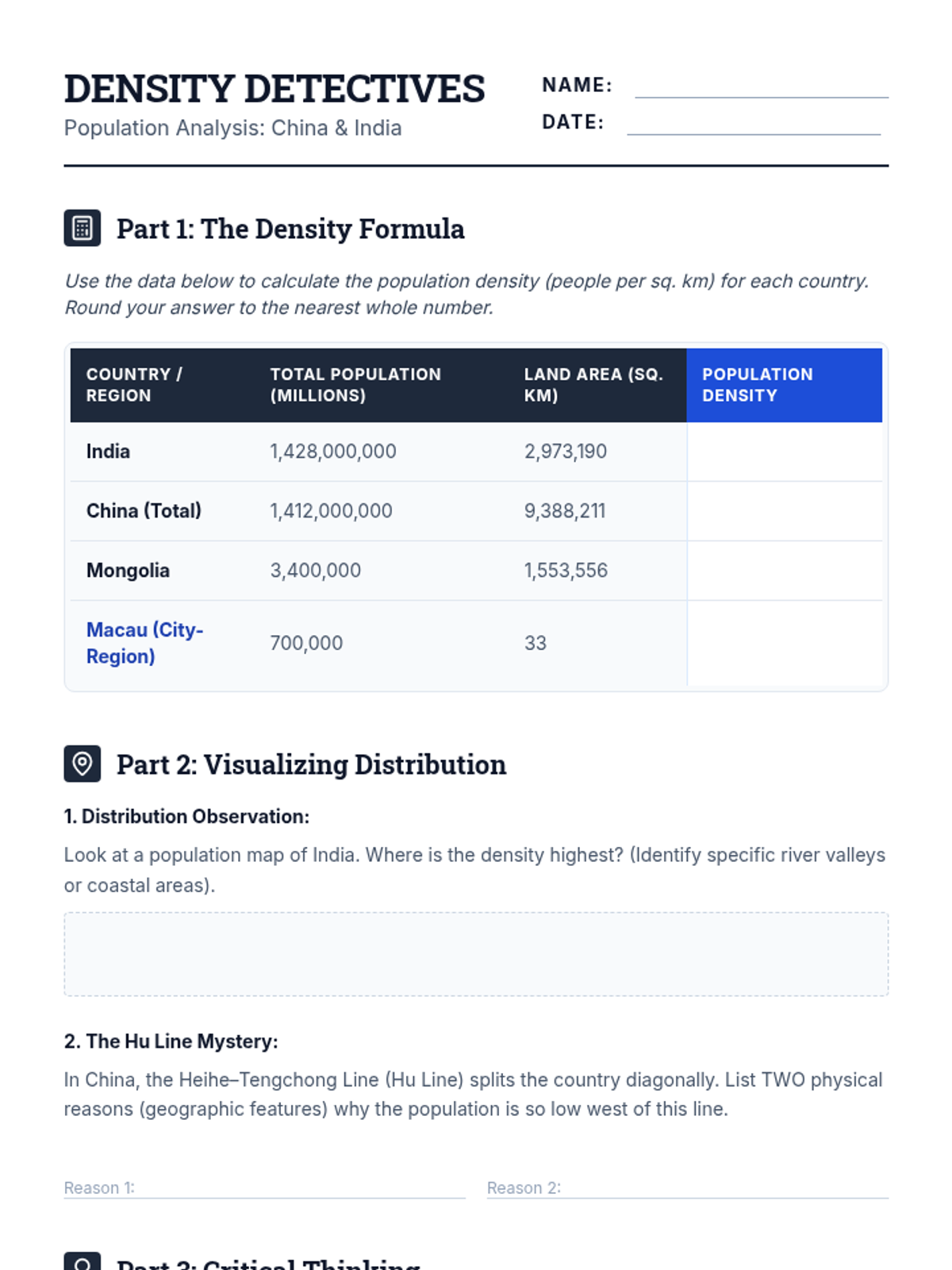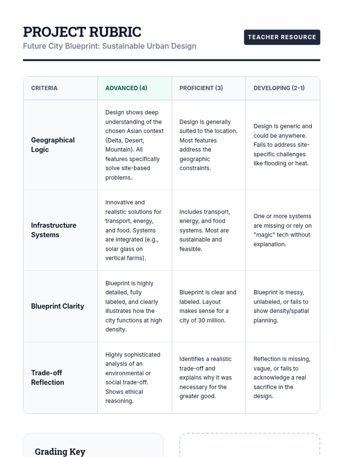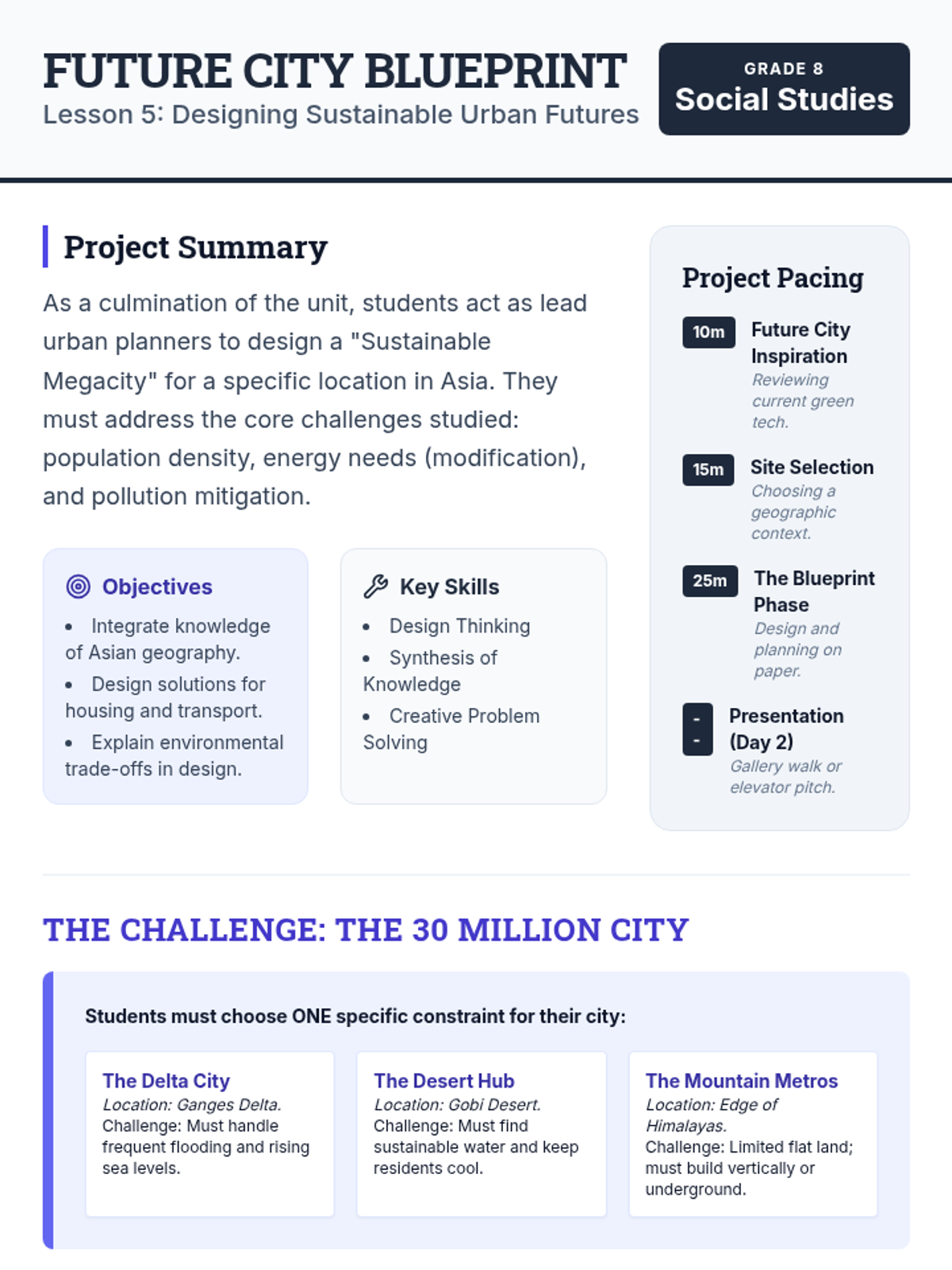This 8th-grade Social Studies sequence explores the intersection of human population growth and environmental modification in Asia. Students analyze population density, the rise of megacities, large-scale engineering projects like the Three Gorges Dam, and the environmental consequences of rapid industrialization, culminating in a sustainable urban design project.