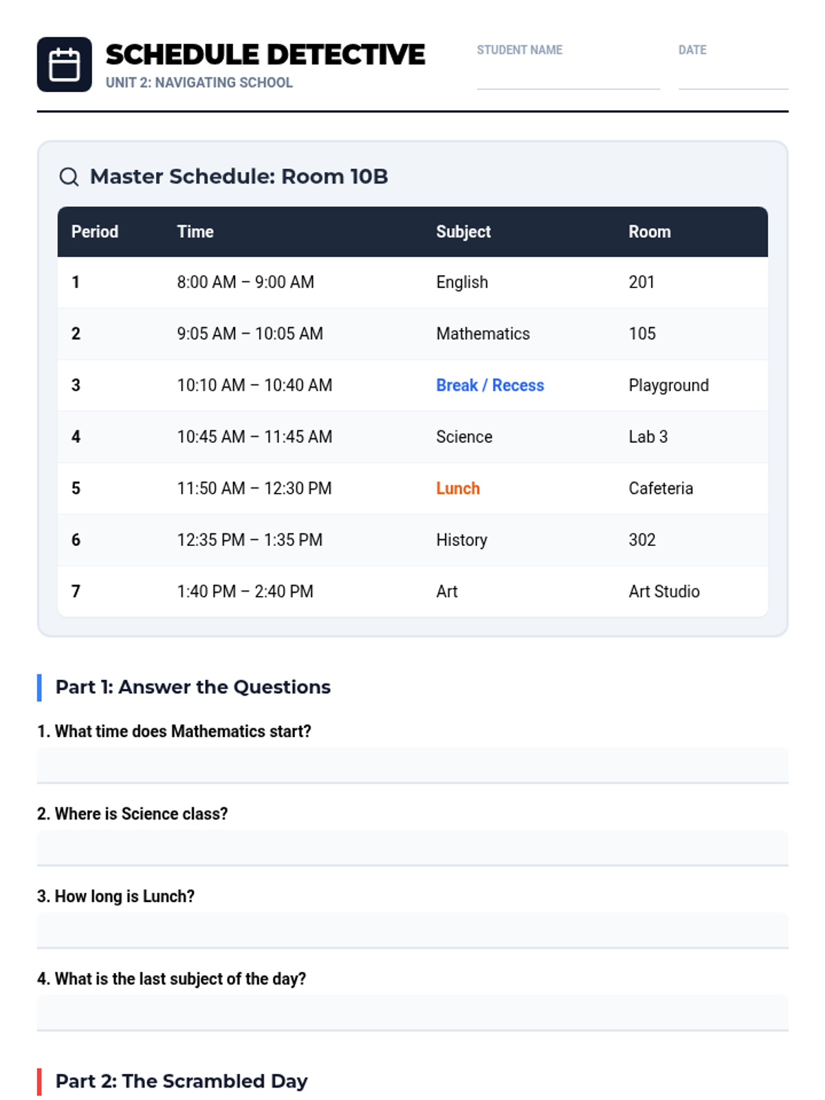 This sequence helps beginner ESL students develop essential listening skills for a middle school environment. It covers greetings, classroom supplies, teacher commands, schedules, and real-world school scenarios through interactive audio-based activities.