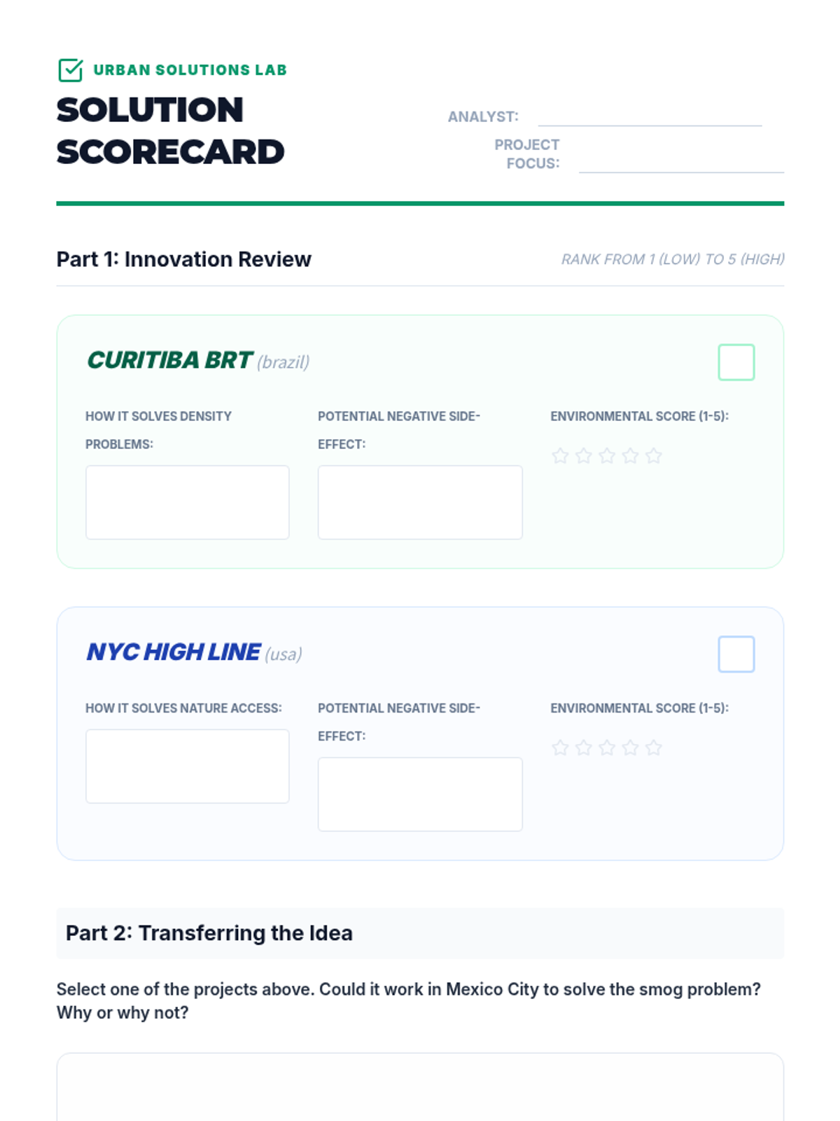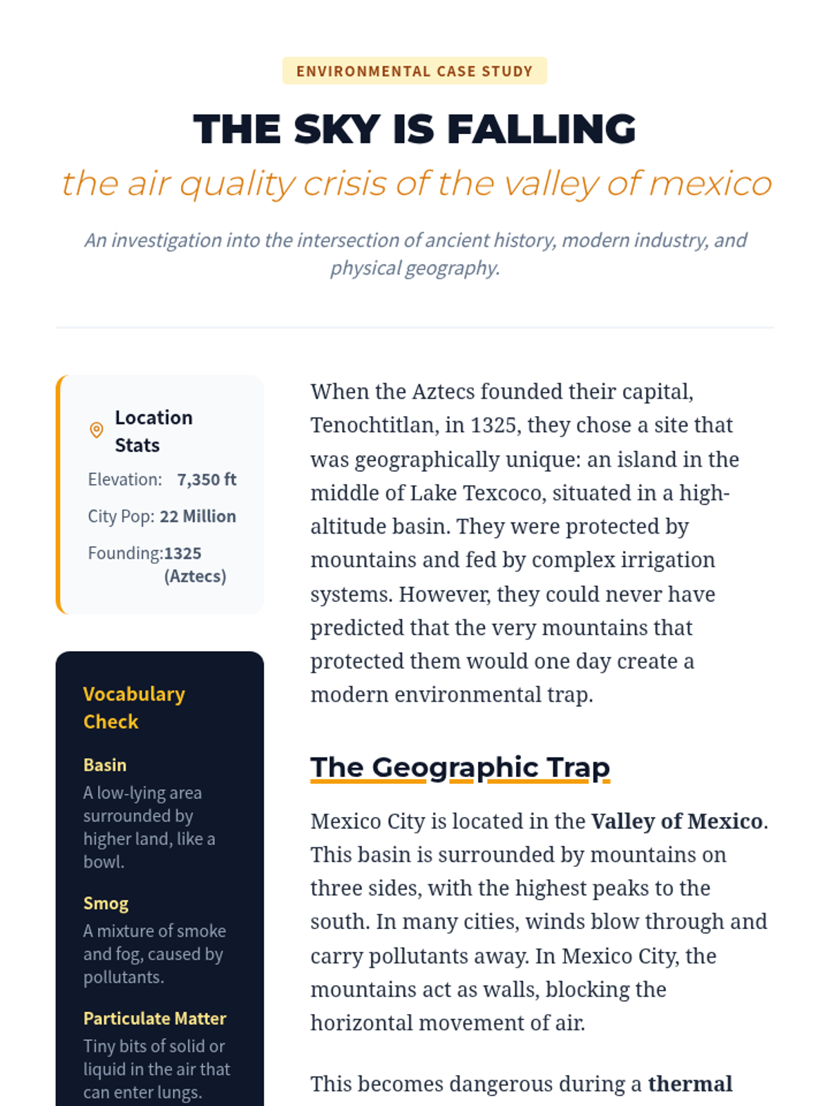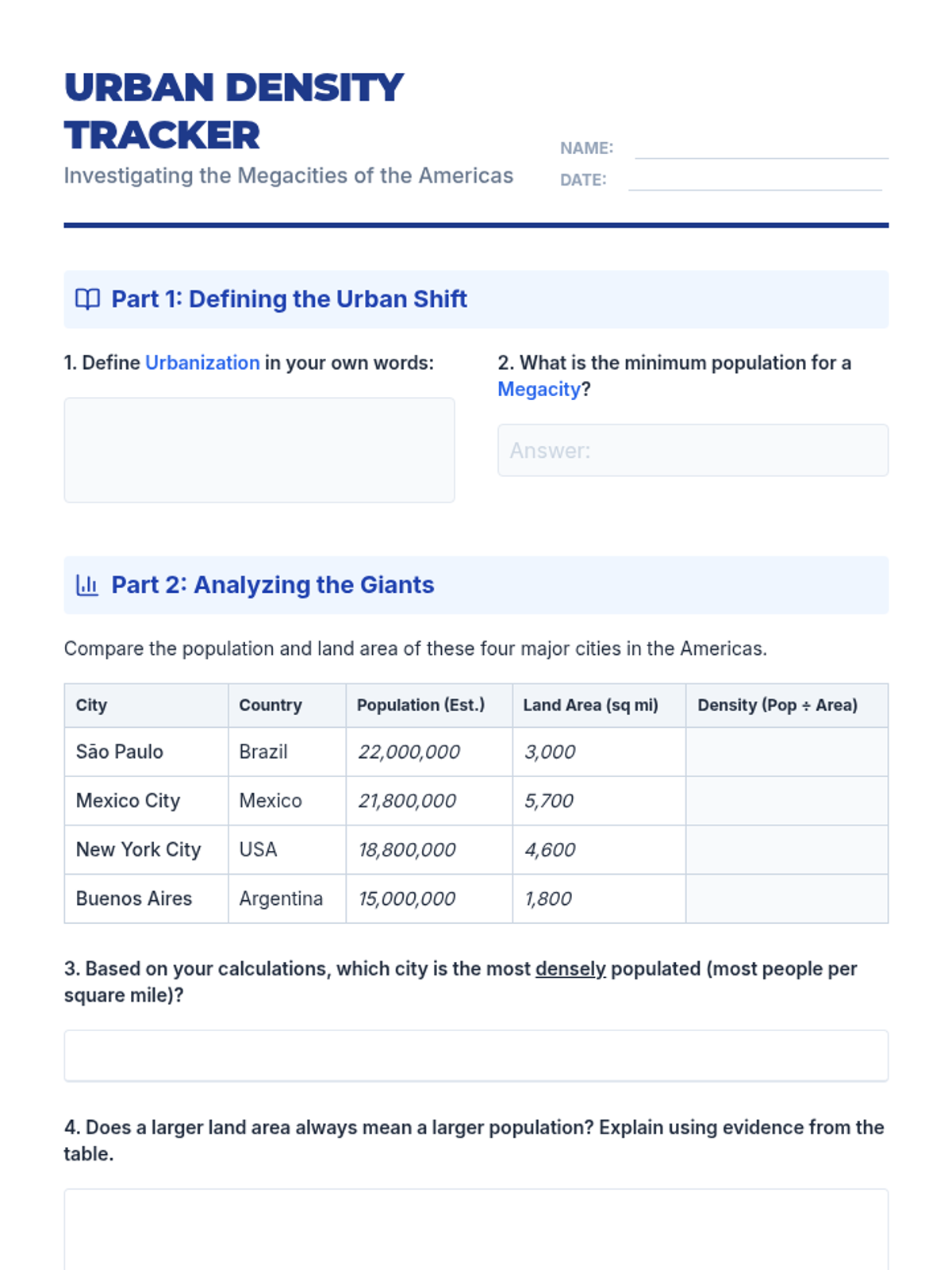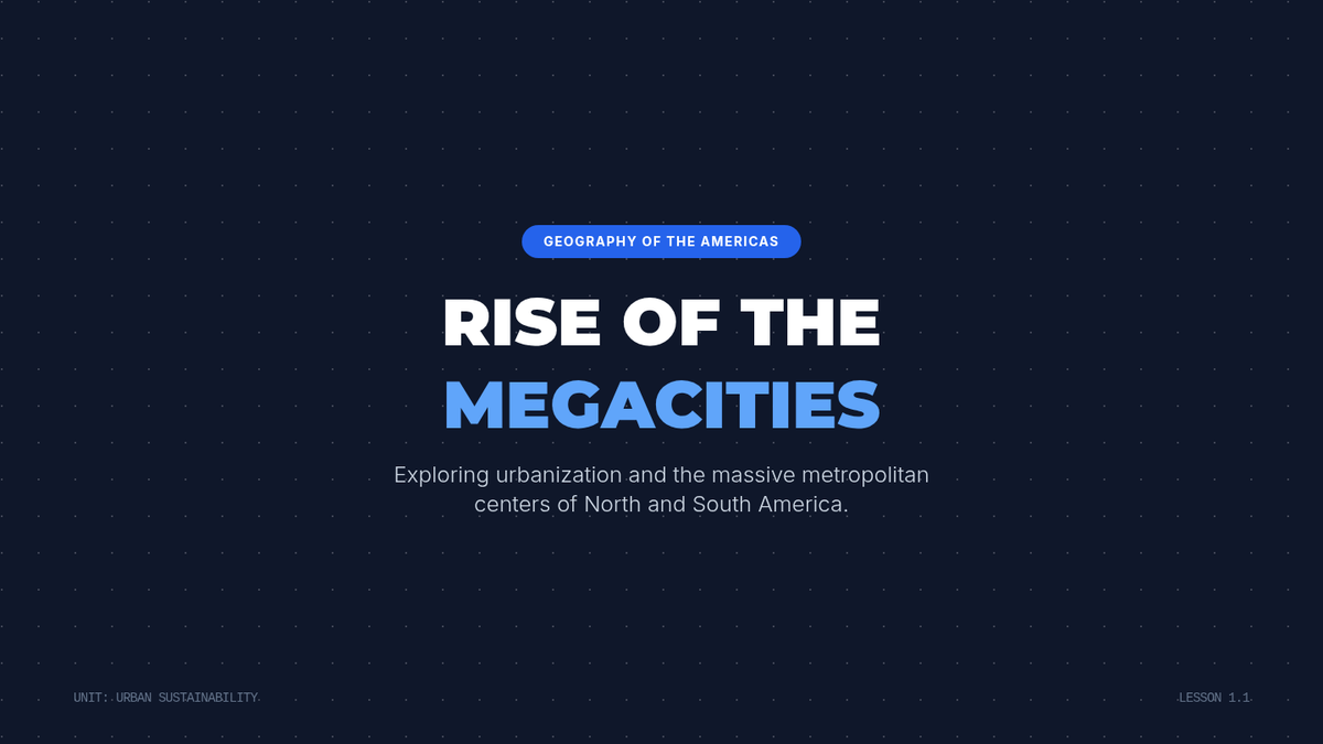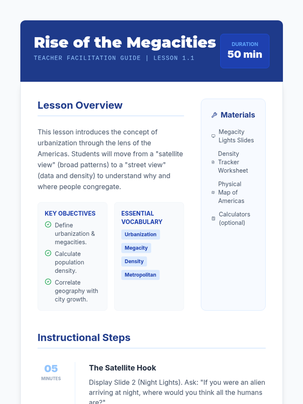 A project-based social studies sequence for 6th-grade students investigating urbanization, environmental challenges, and sustainable solutions across the Americas. Students analyze megacities, resource management, and geographic influences on pollution before designing their own sustainable city block.