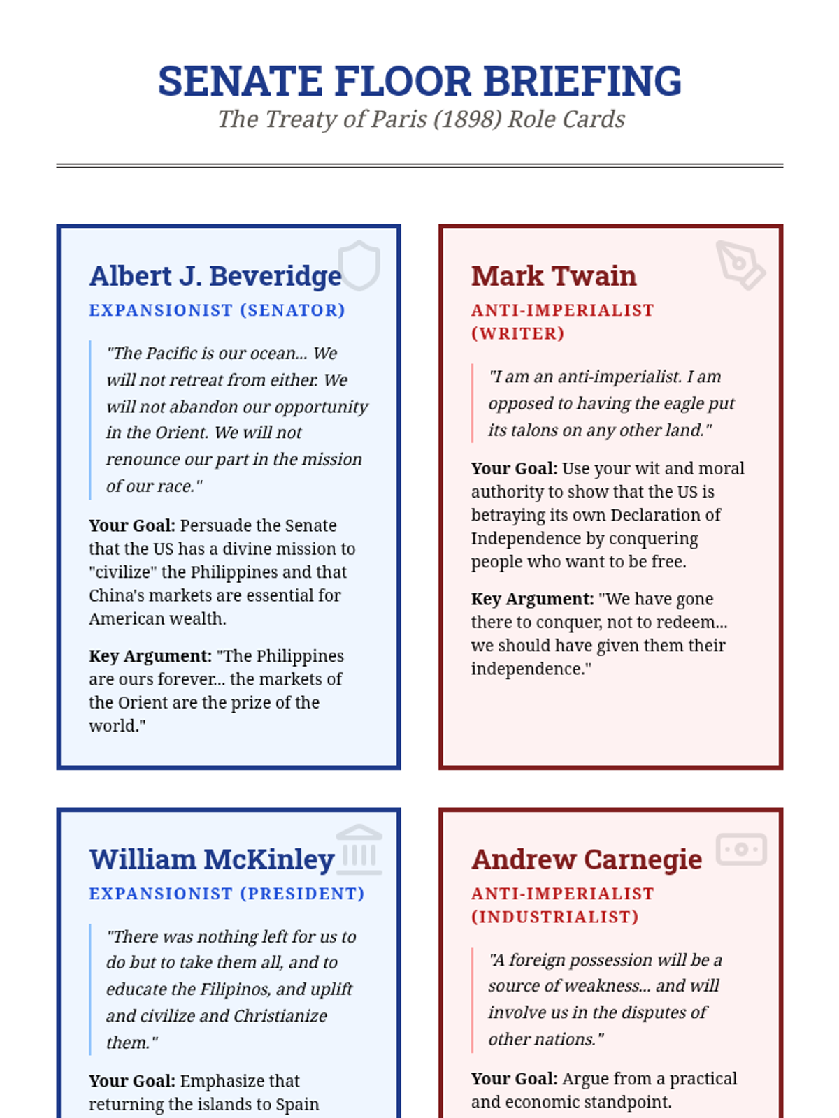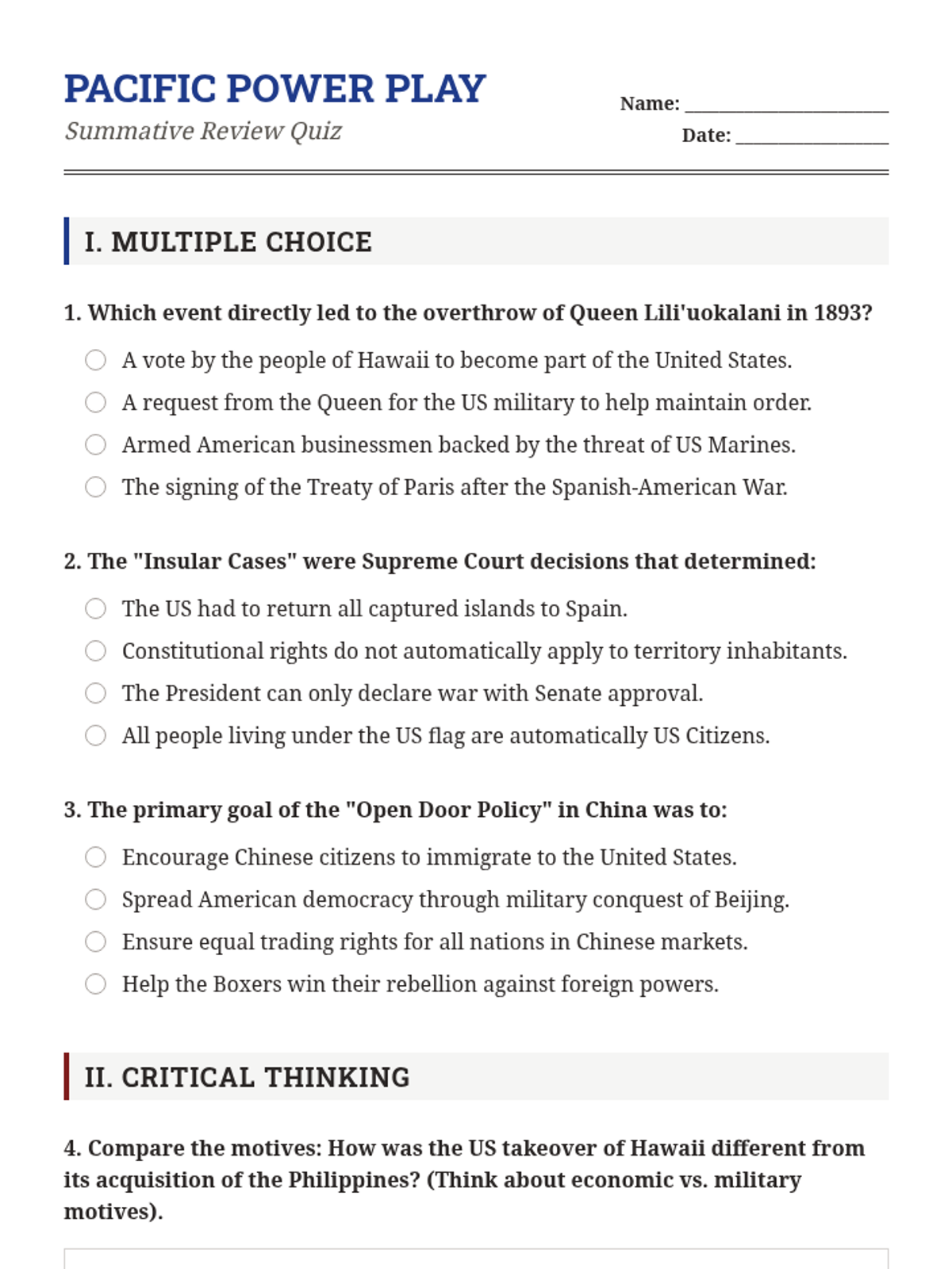 This 8th-grade history sequence explores the Pacific theater of American Imperialism, focusing on the debates over Hawaii, the Philippines, and China. Students analyze the tension between democratic ideals and expansionist actions through primary source analysis and simulations.
