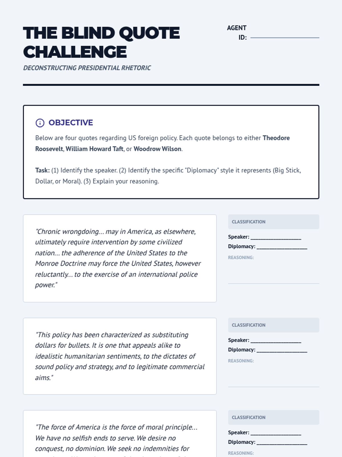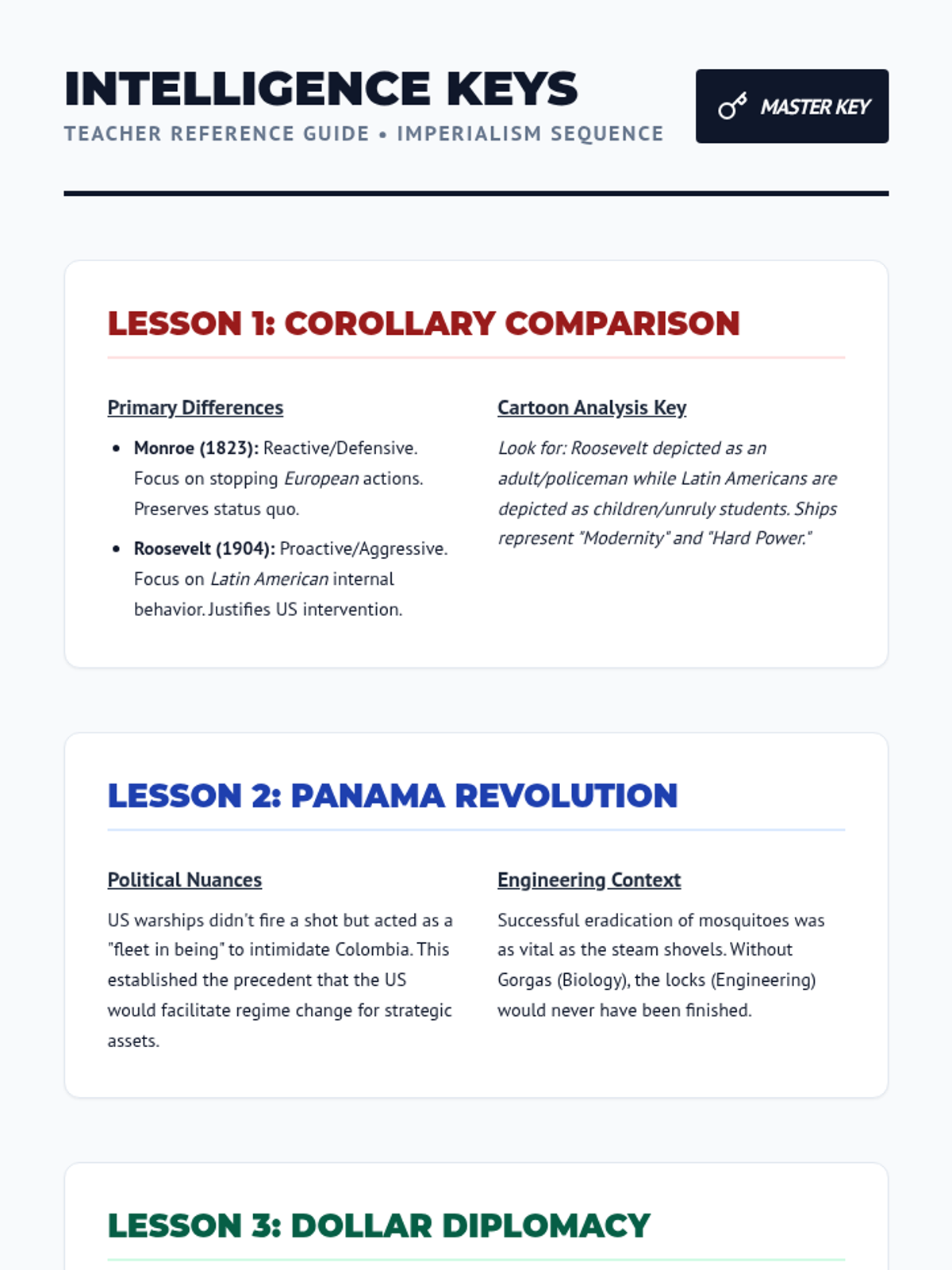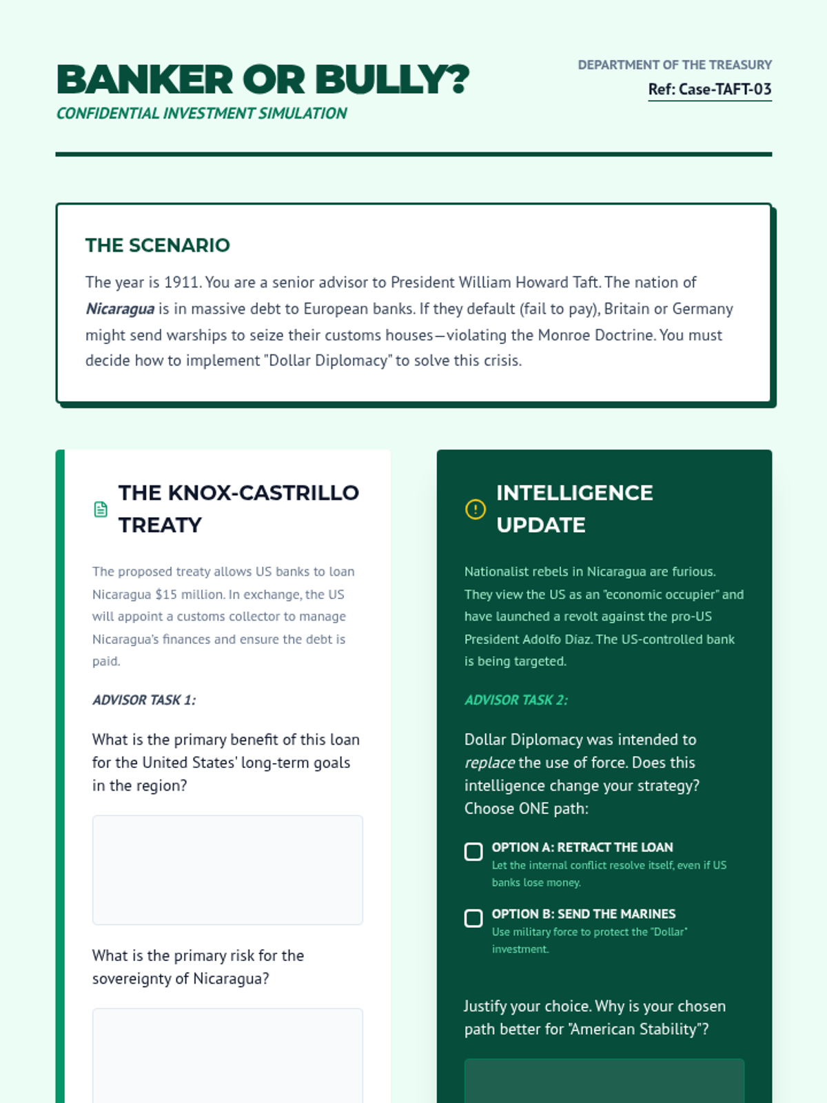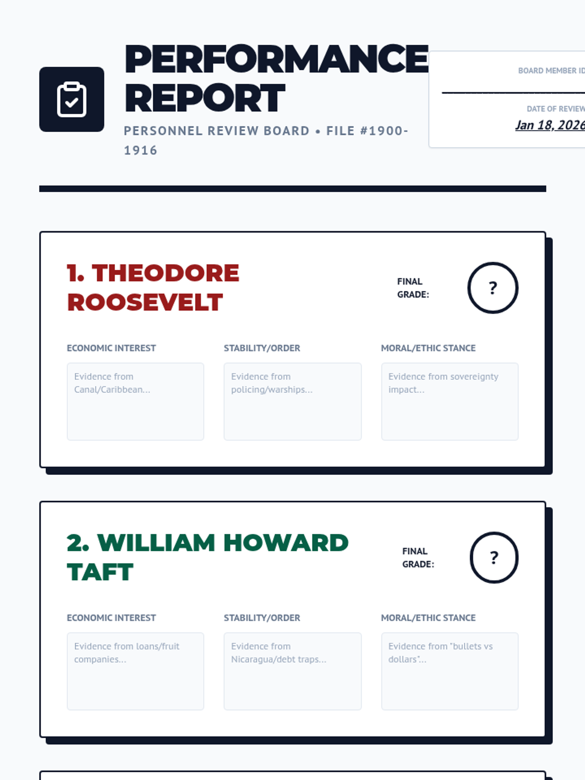 A comprehensive exploration of US interventionism in Latin America during the early 20th century, focusing on the evolution of foreign policy from the Roosevelt Corollary to Wilson's Moral Diplomacy. Students analyze primary sources, political cartoons, and economic data to evaluate the impact of American hegemony.