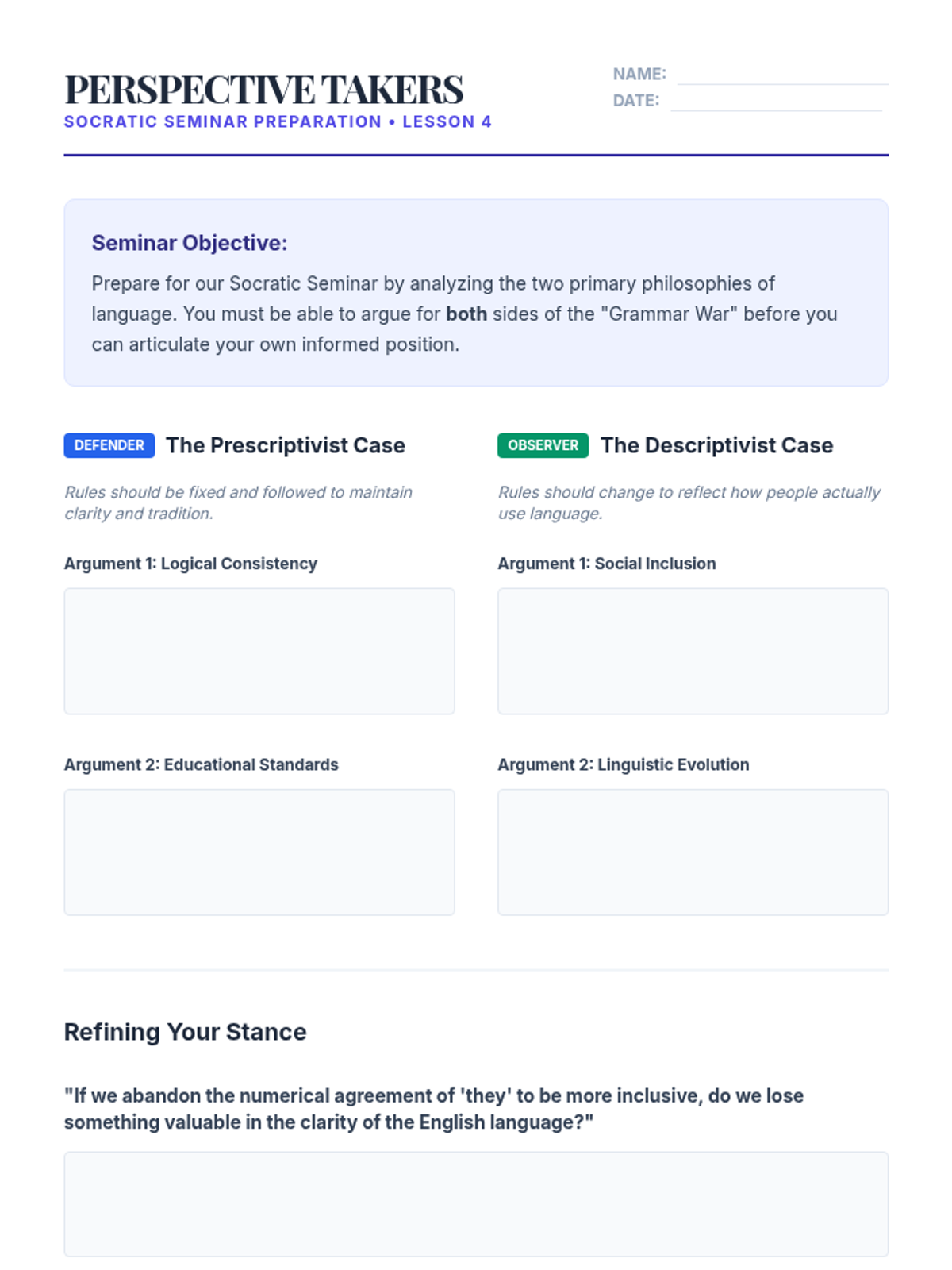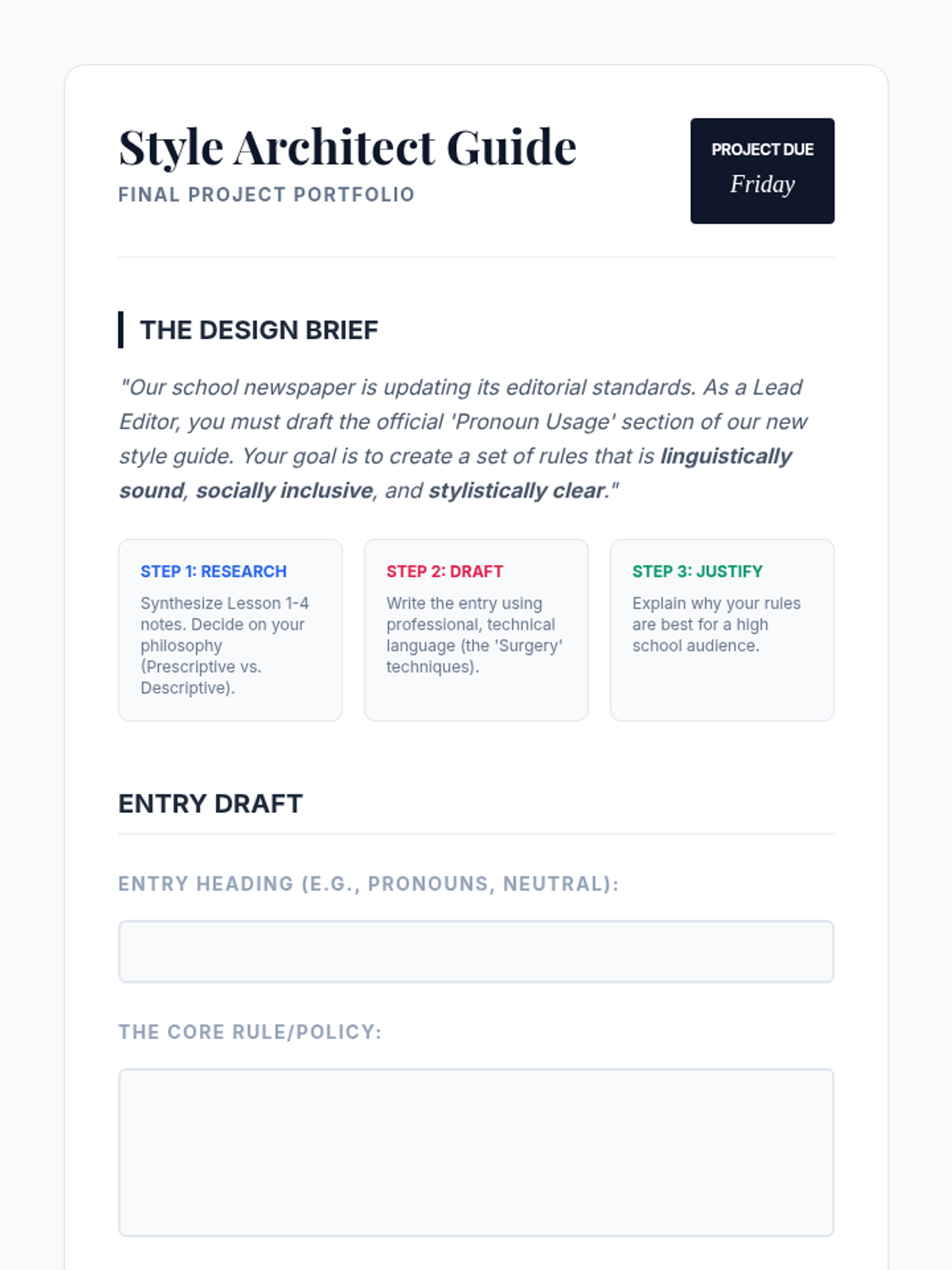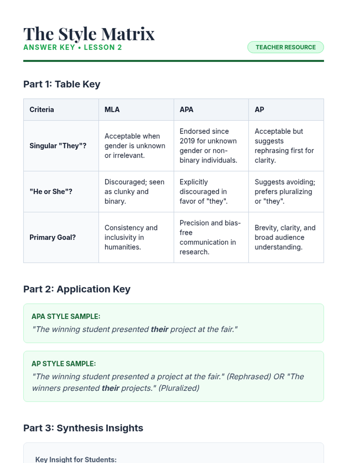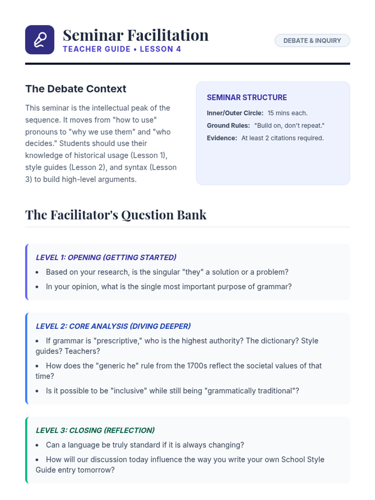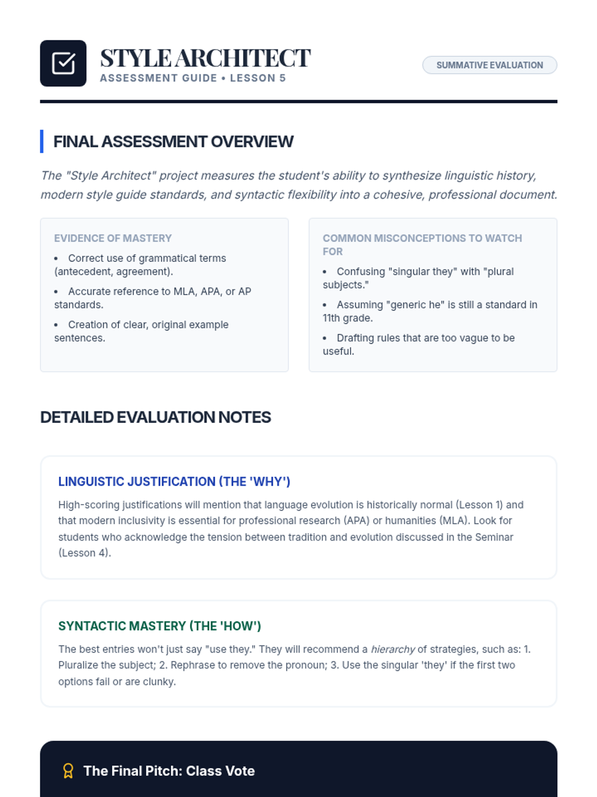 A comprehensive 11th-grade ELA sequence exploring the historical, social, and grammatical evolution of pronouns, with a focus on gender-neutral usage and modern style guide standards.
