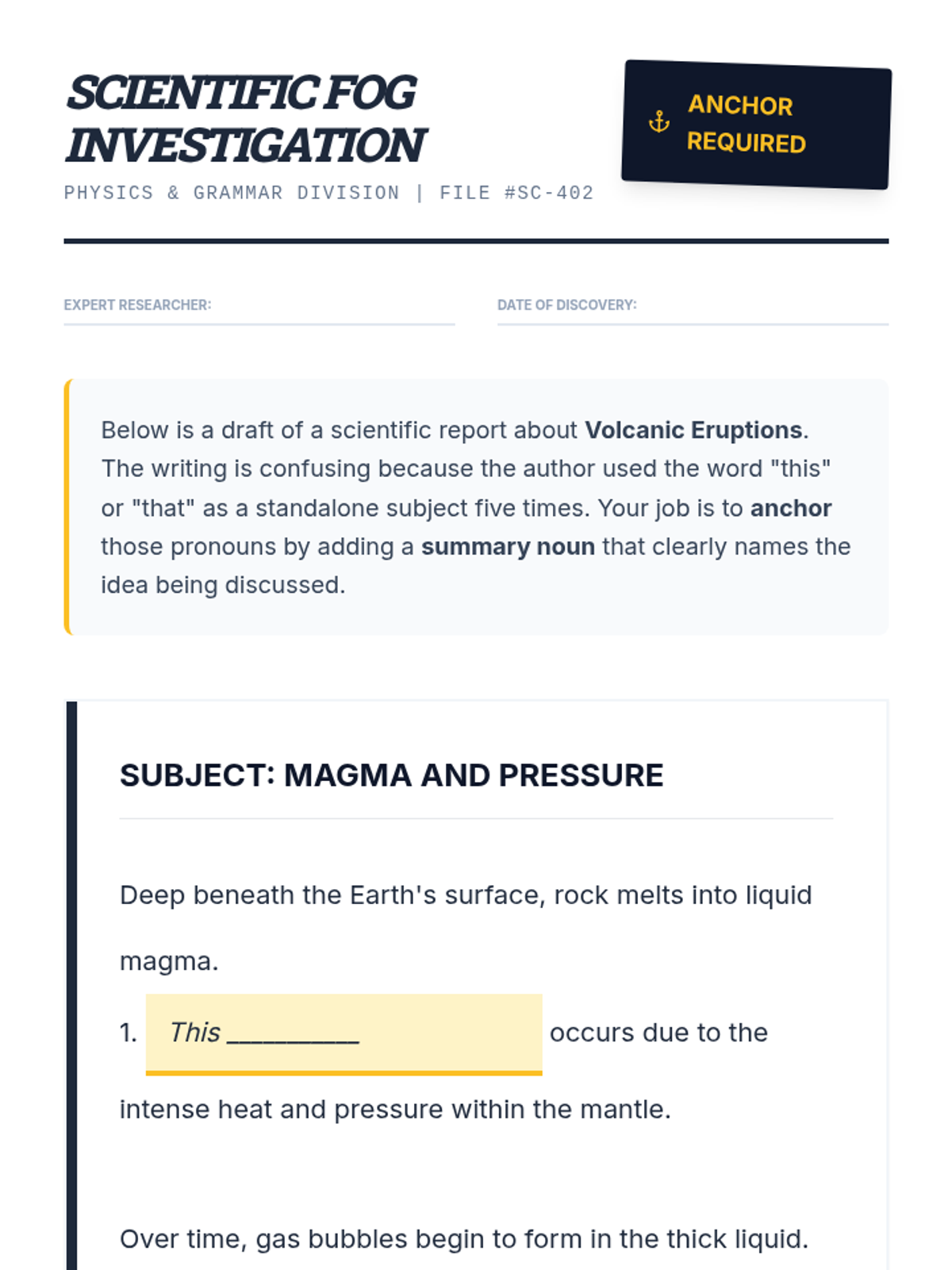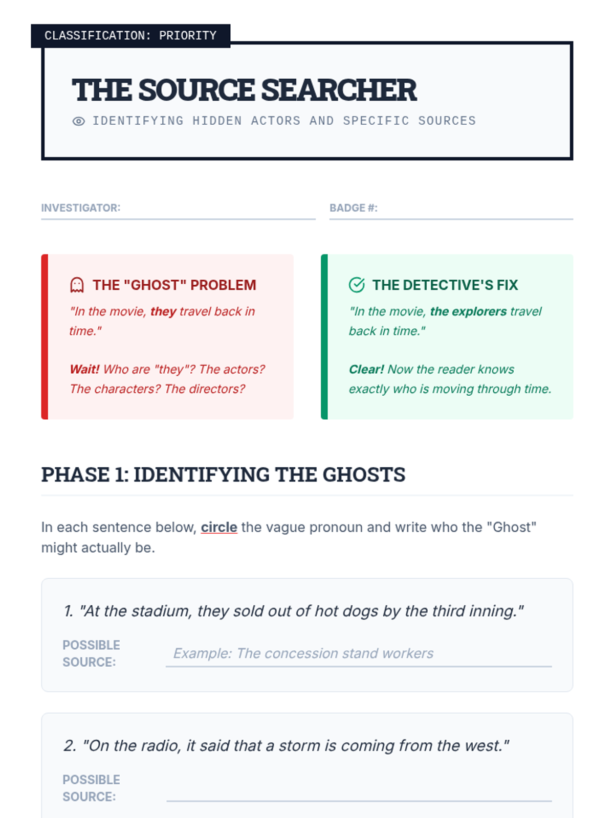 A 5th-grade ELA sequence where students act as 'Clarity Detectives' to identify and resolve vague pronoun references, moving from detection to advanced revision strategies.