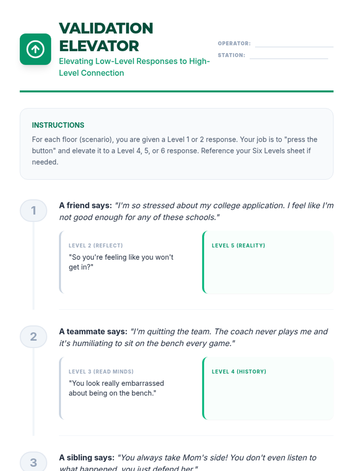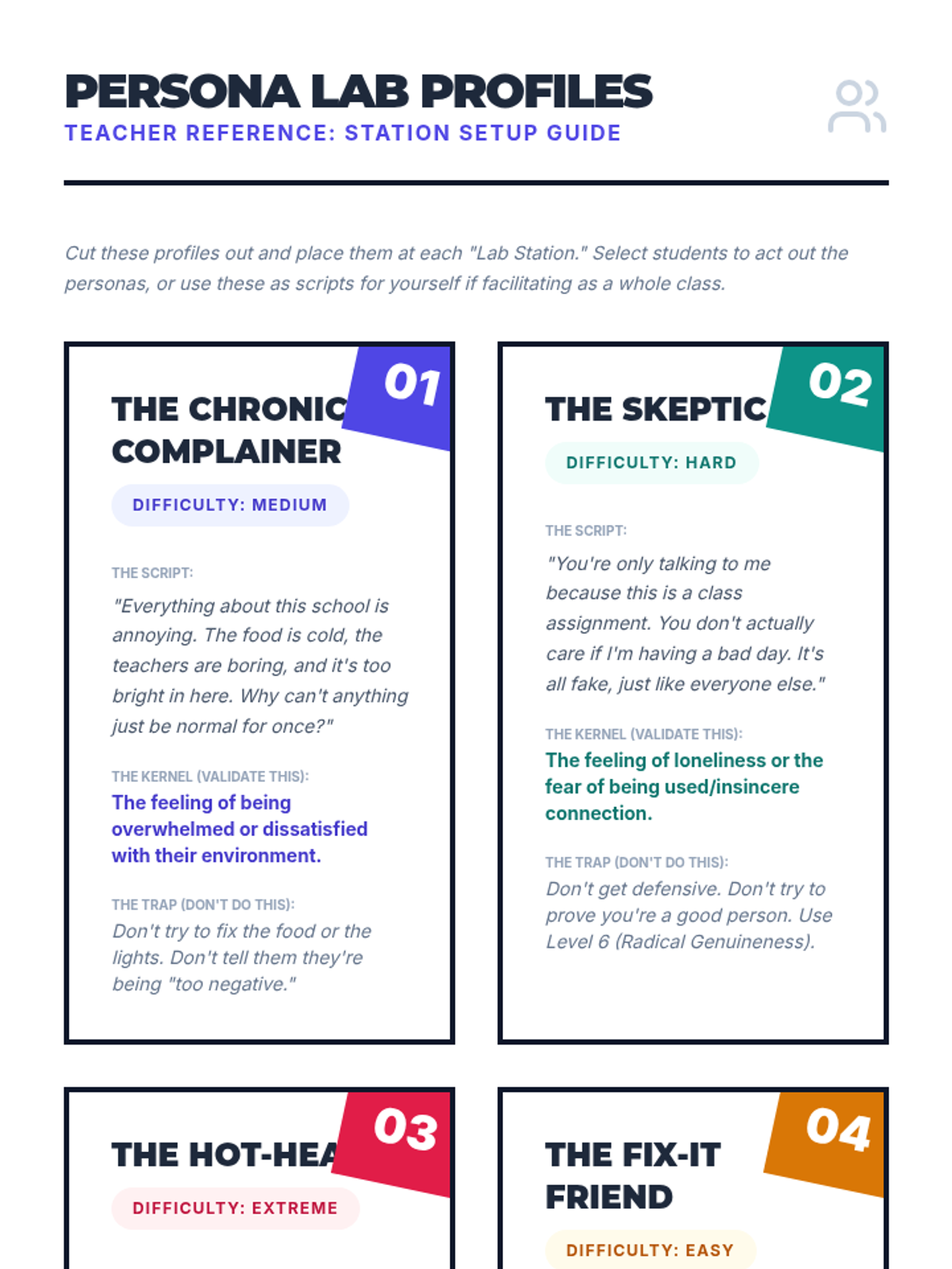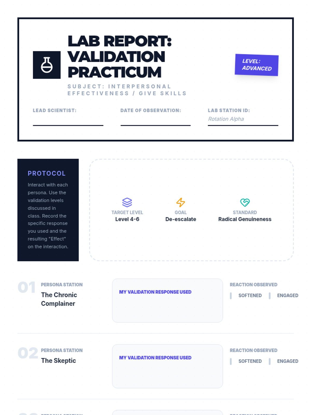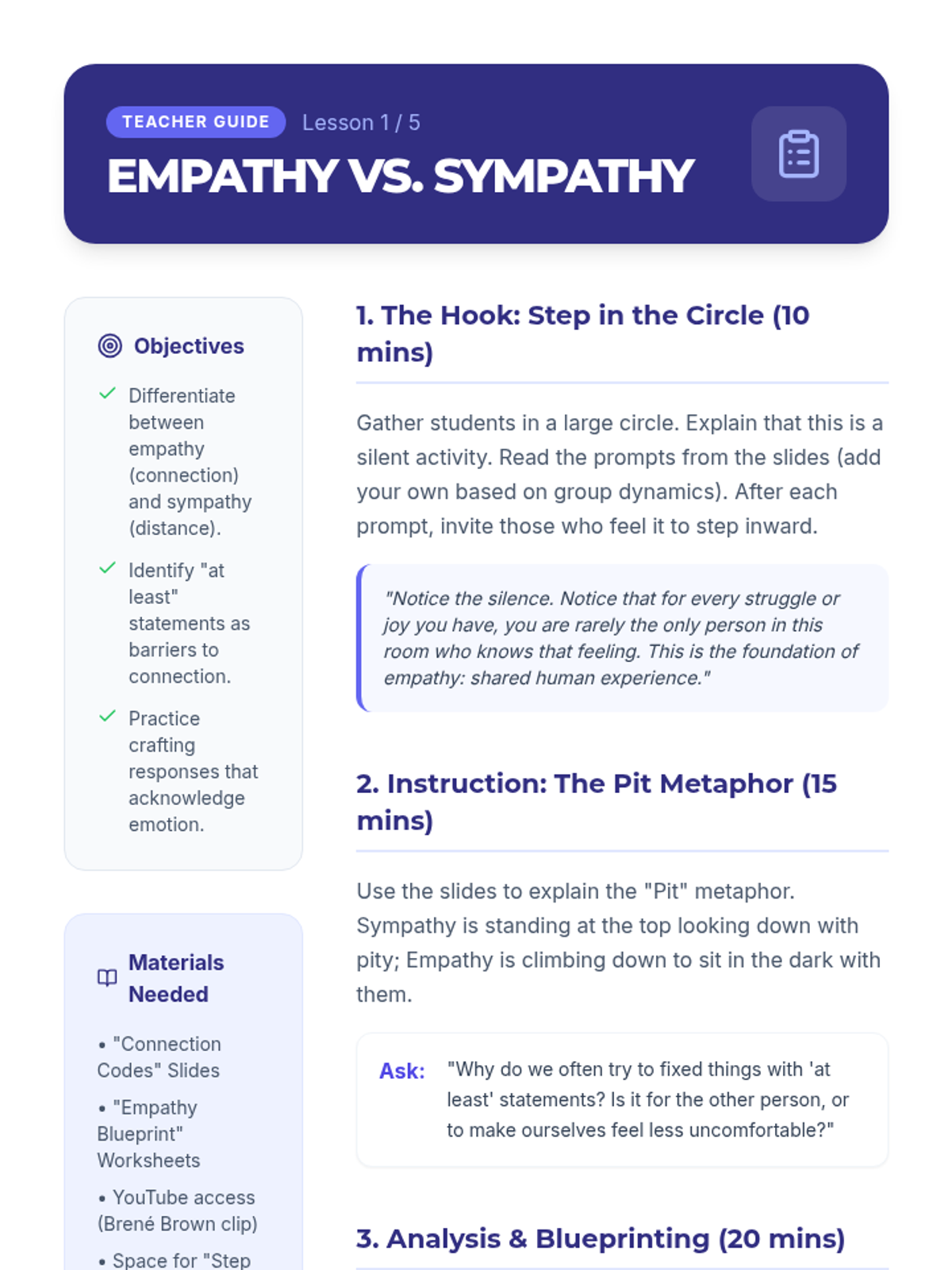 This sequence uses a workshop model to explore empathy and validation, helping students move from surface-level listening to mastering the six levels of validation and 'validating the invalid.' Students build emotional intelligence to de-escalate conflict and strengthen relationships.