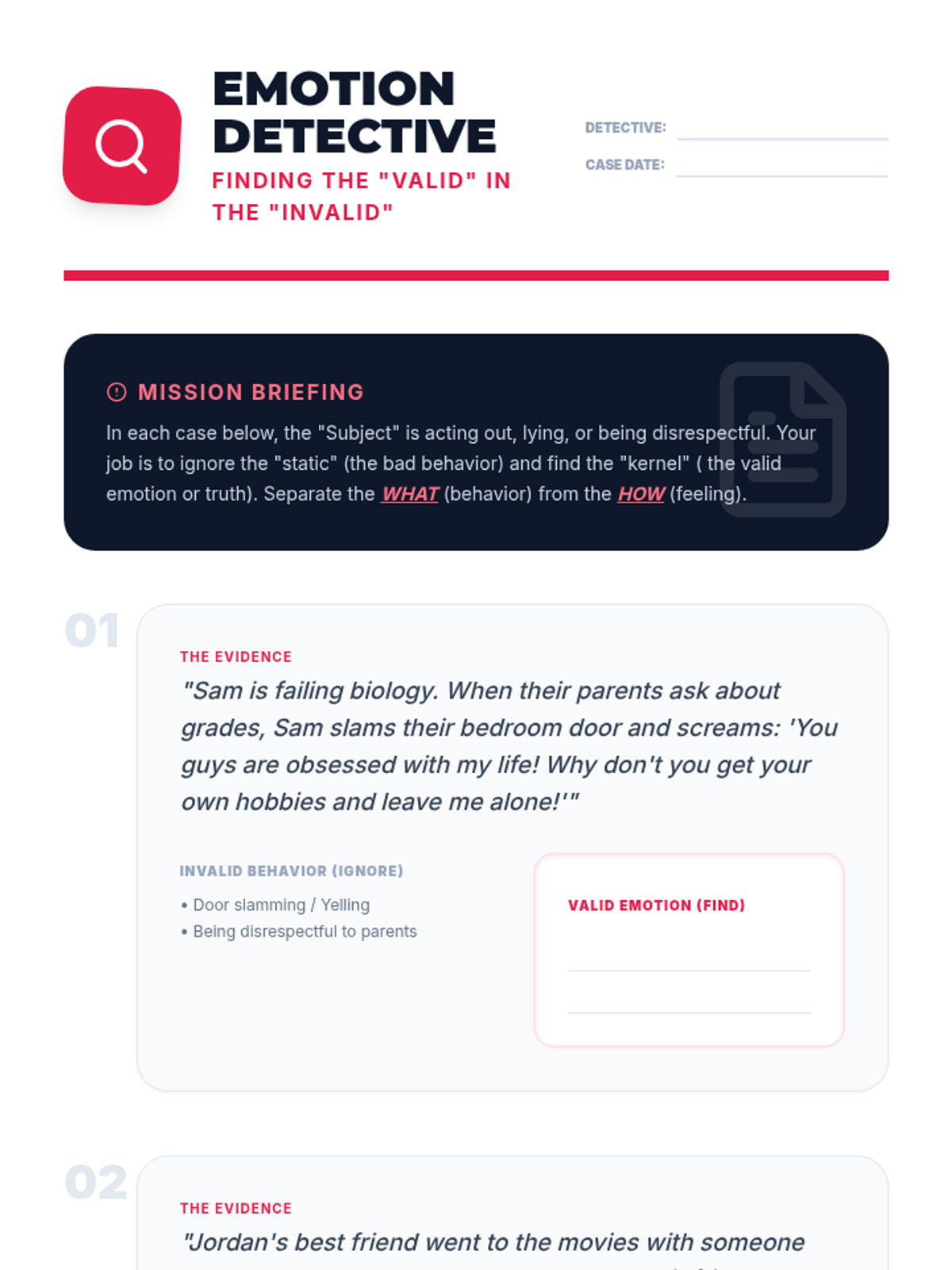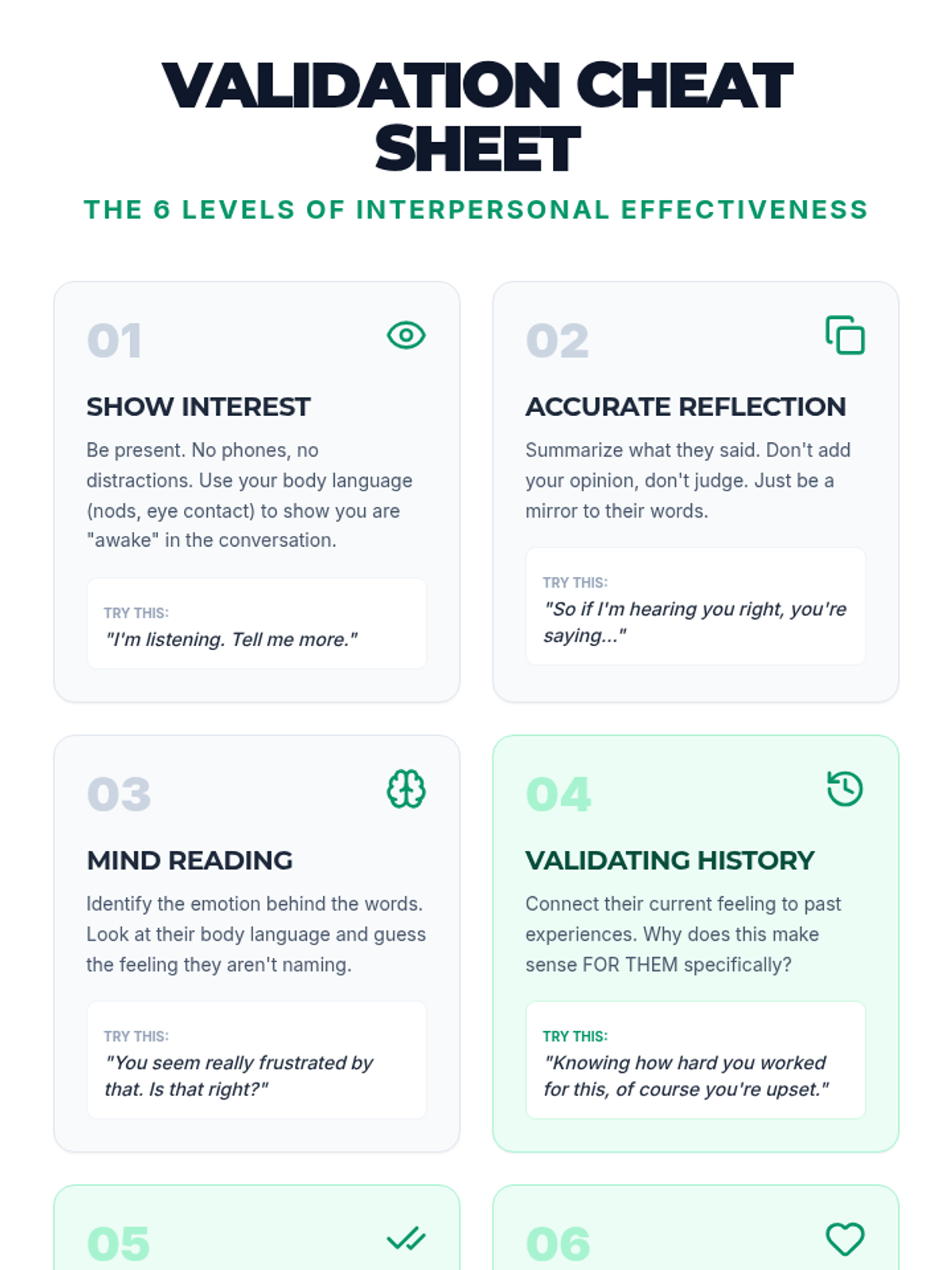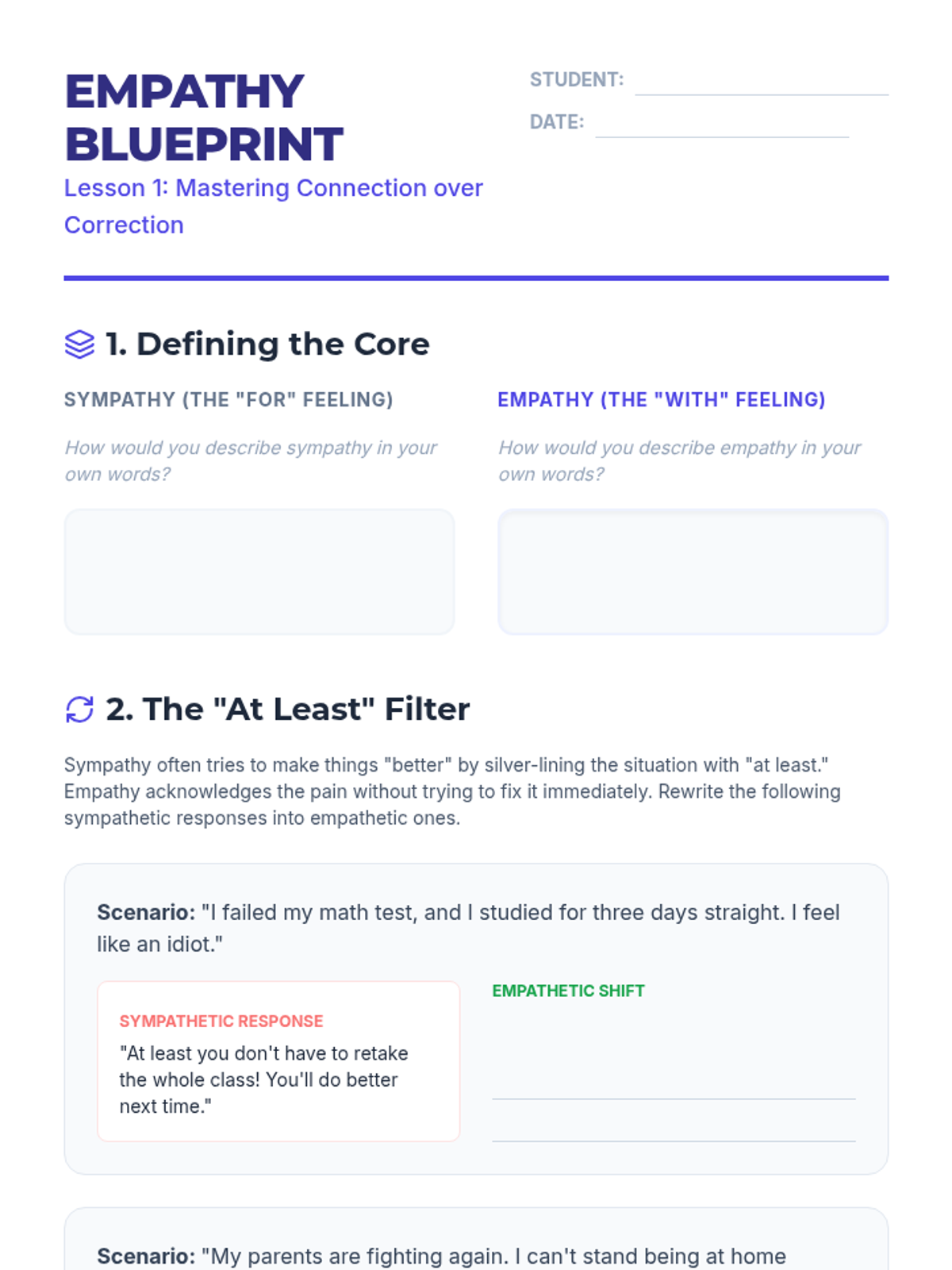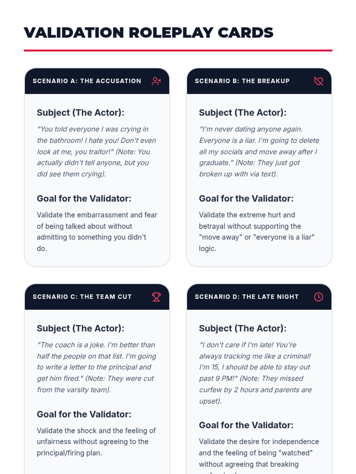 This sequence uses a workshop model to explore empathy and validation, helping students move from surface-level listening to mastering the six levels of validation and 'validating the invalid.' Students build emotional intelligence to de-escalate conflict and strengthen relationships.