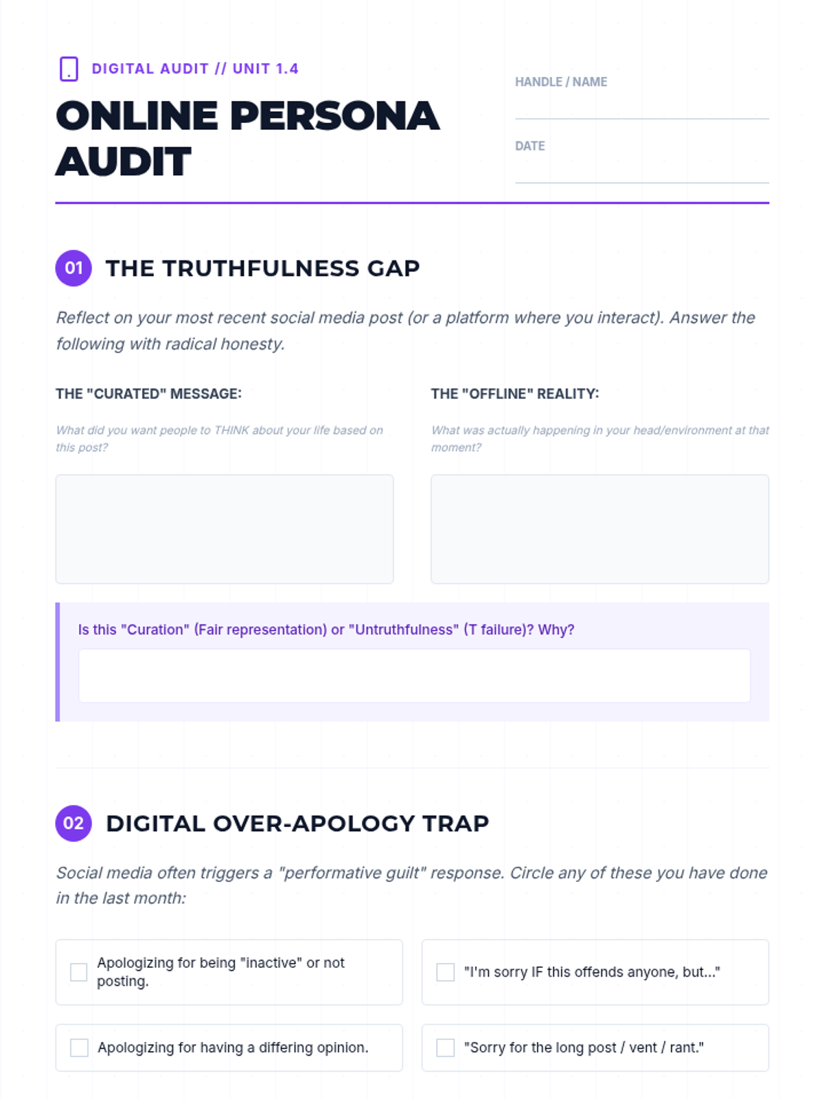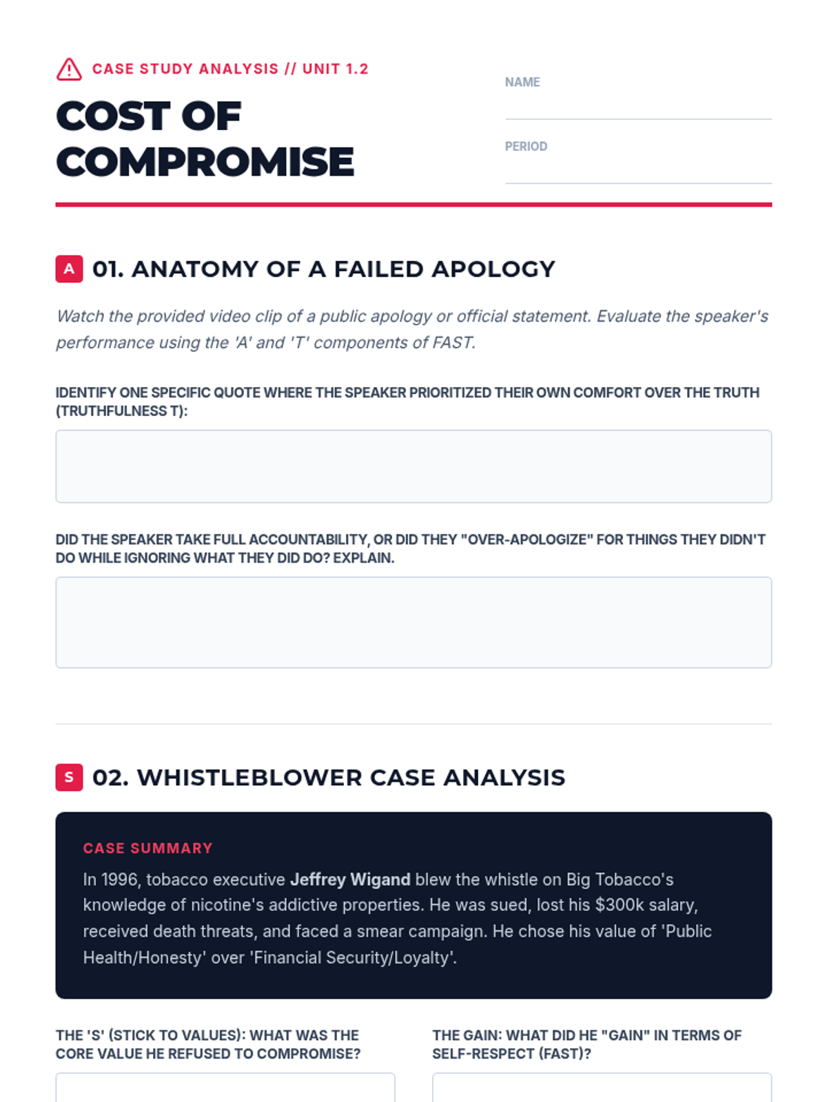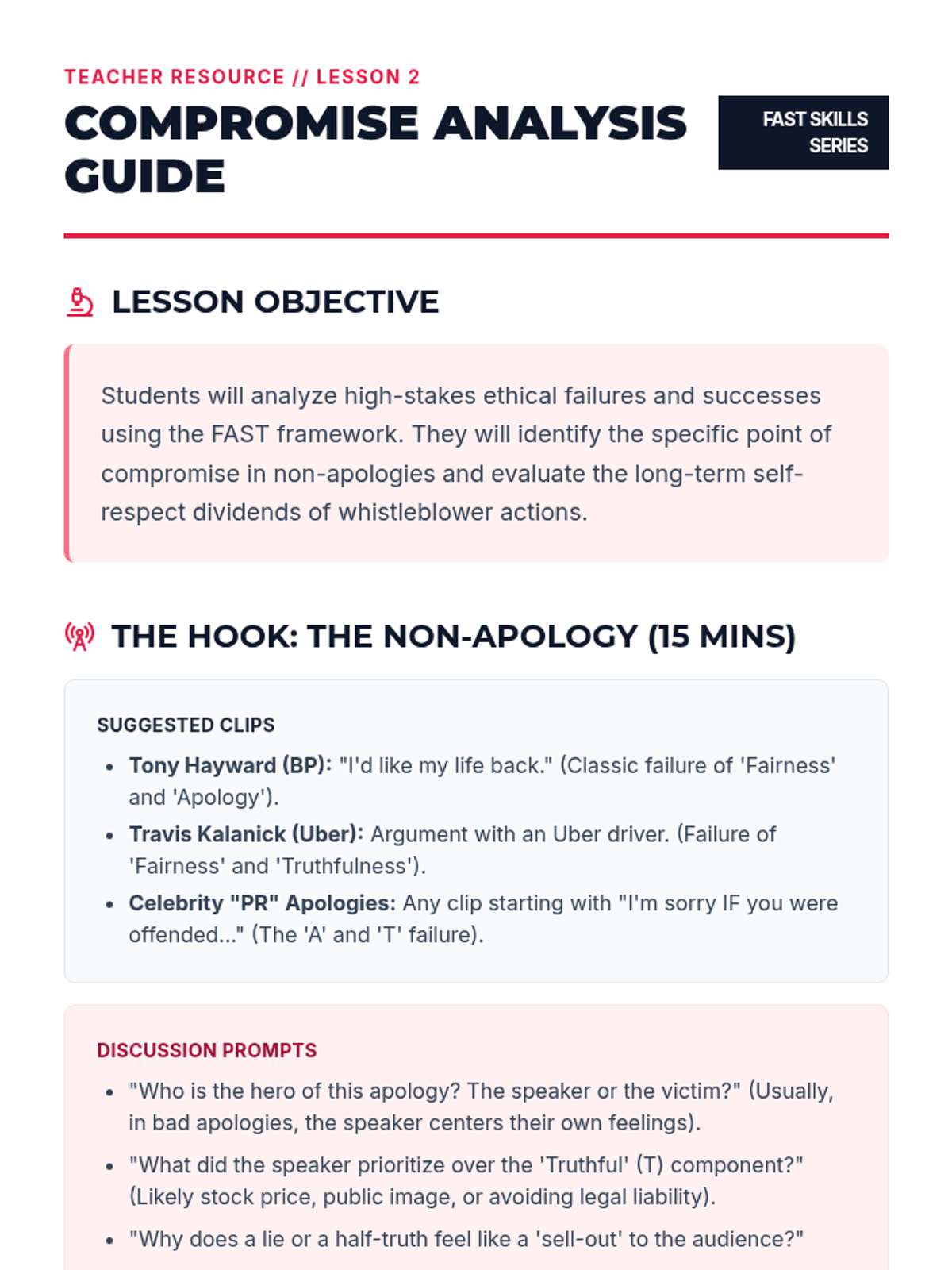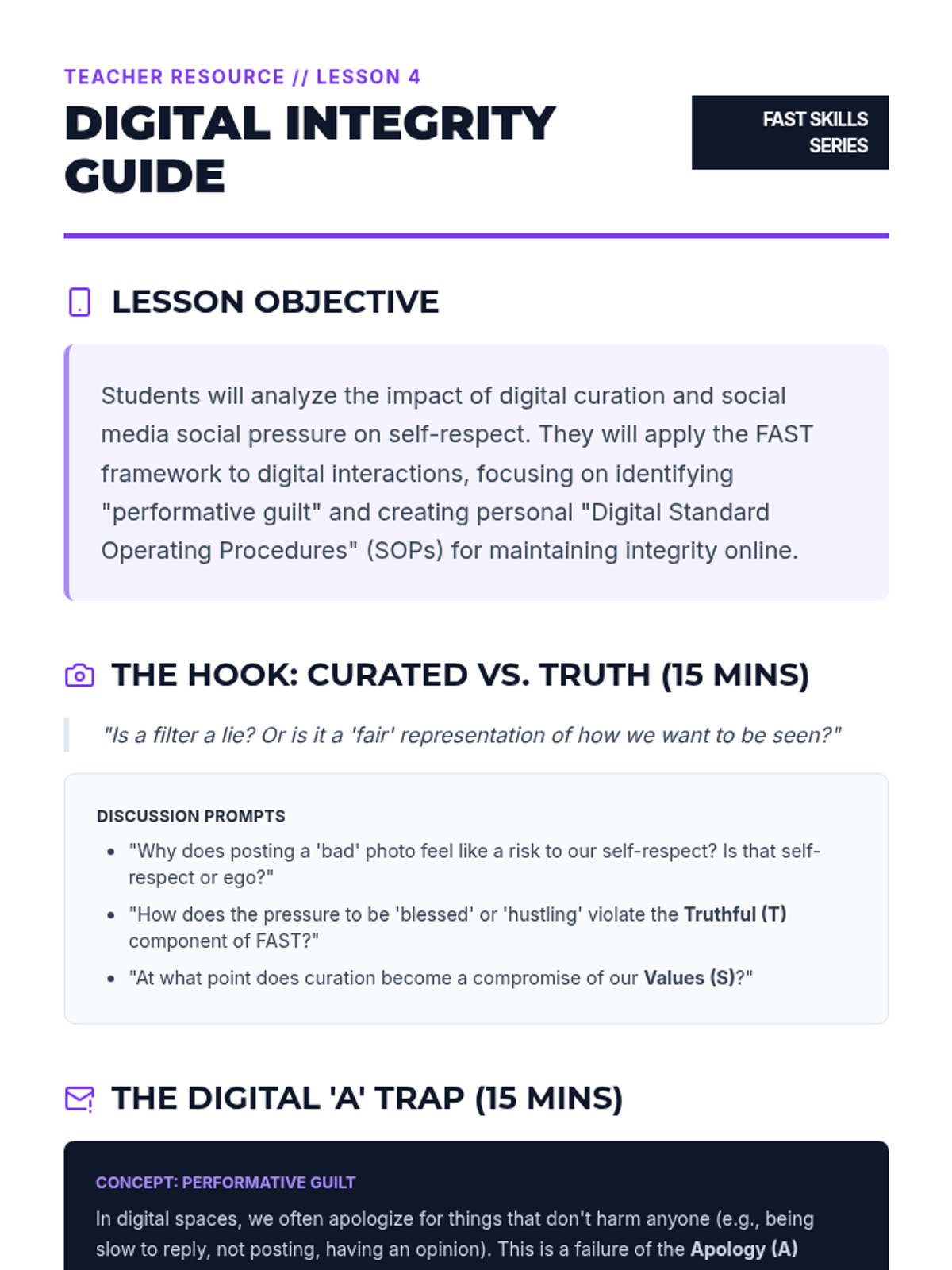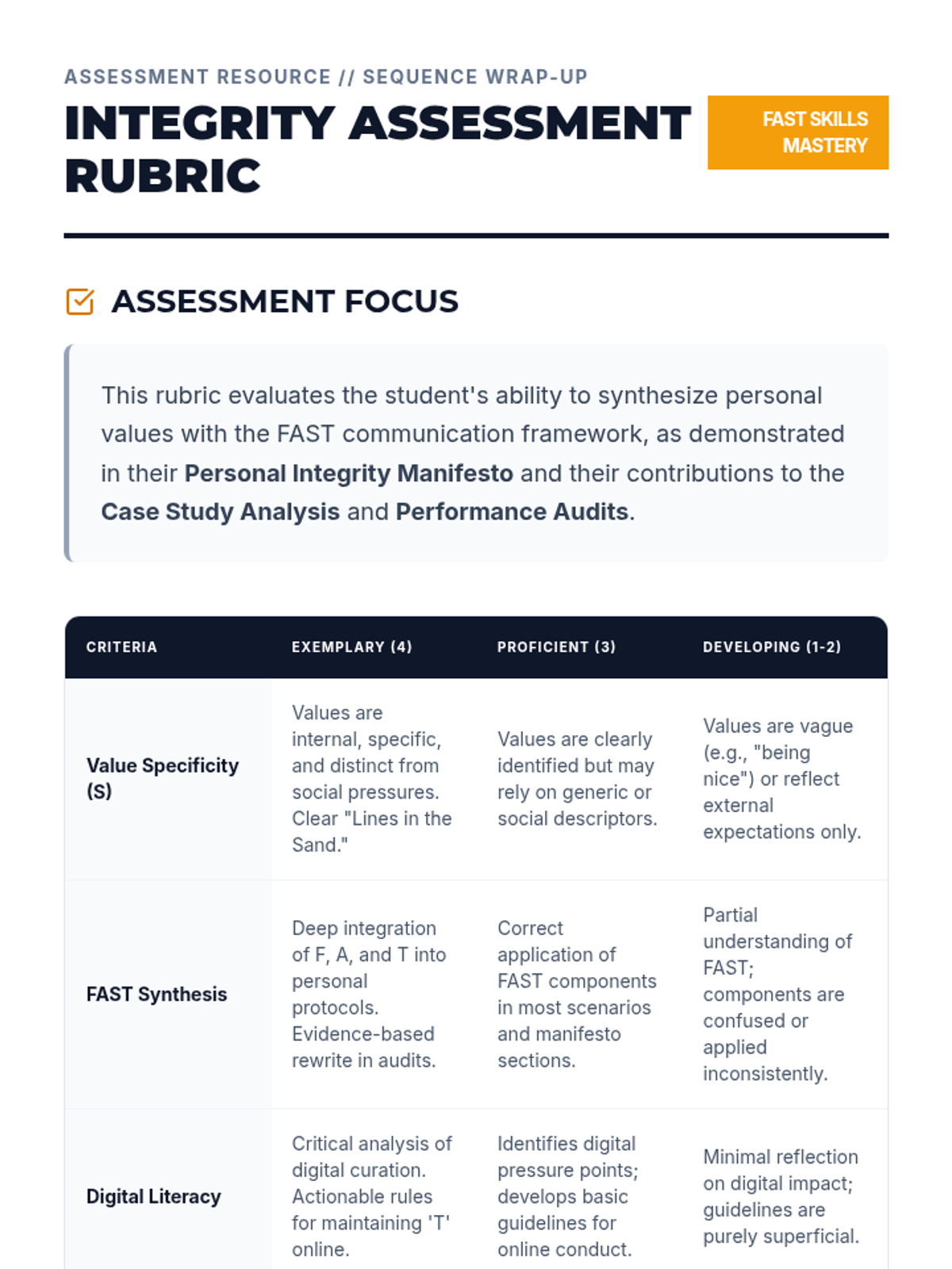 A 12th-grade sequence on FAST skills for self-respect, focusing on personal ethics, integrity in communication, and maintaining values in the face of external pressure and digital influence.