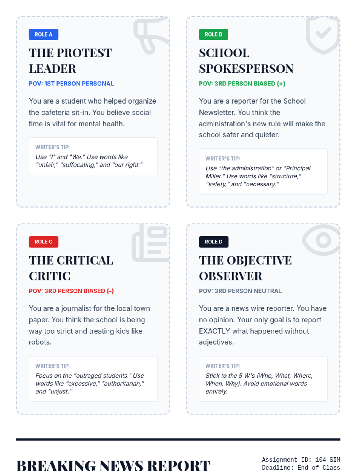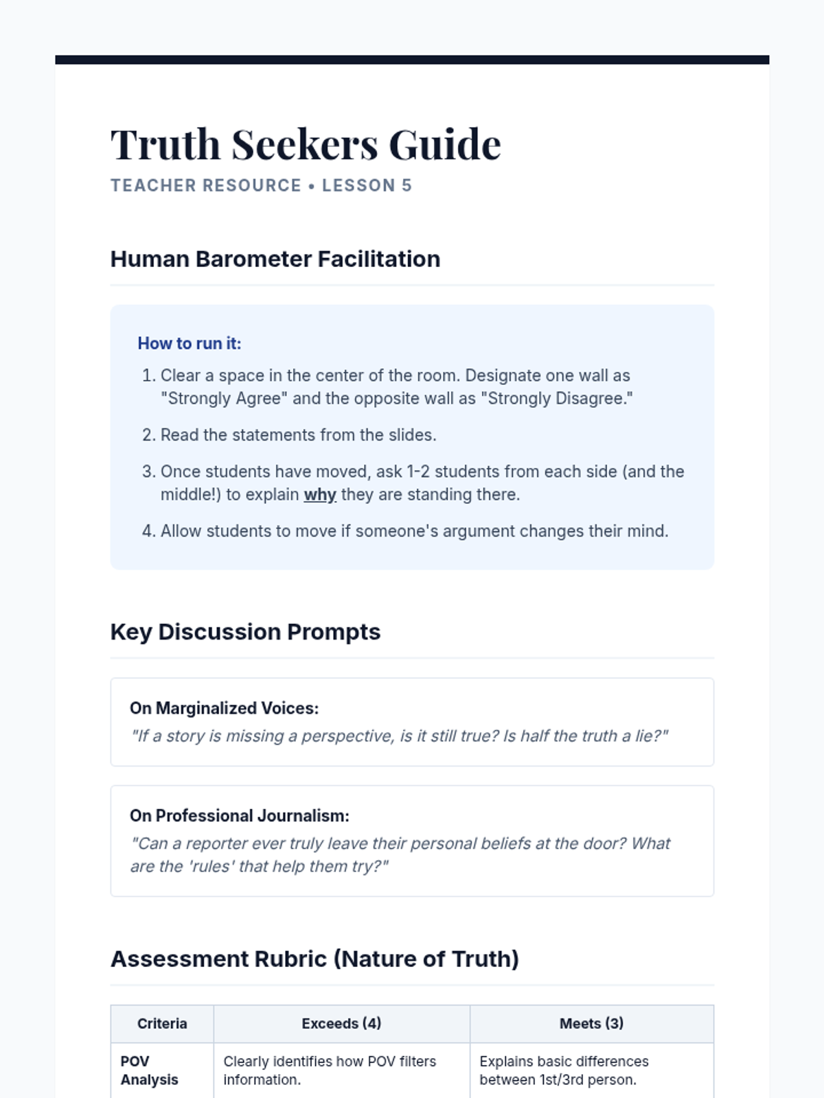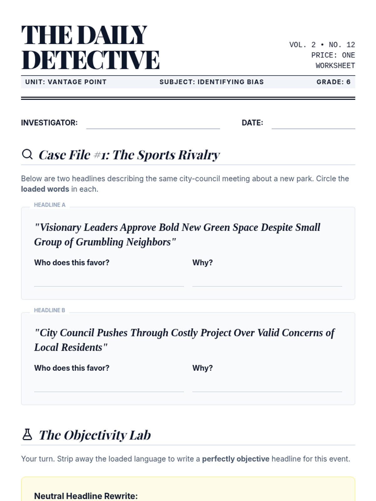 A 6th-grade ELA unit exploring how point of view shapes nonfiction and media. Students analyze the differences between first-person memoirs and third-person biographies, identify bias in journalism, and examine historical narratives through multiple lenses.