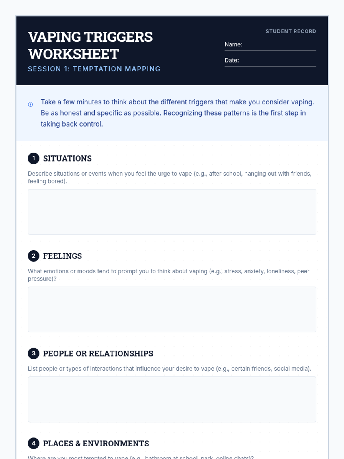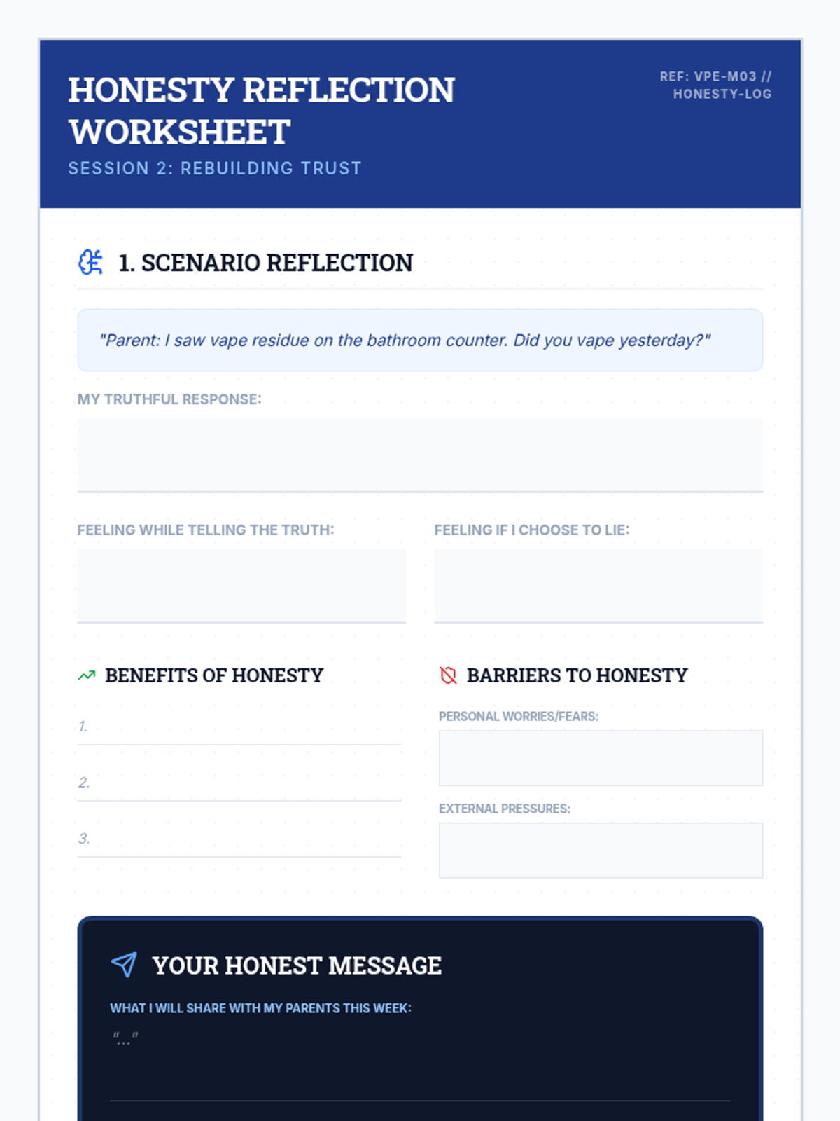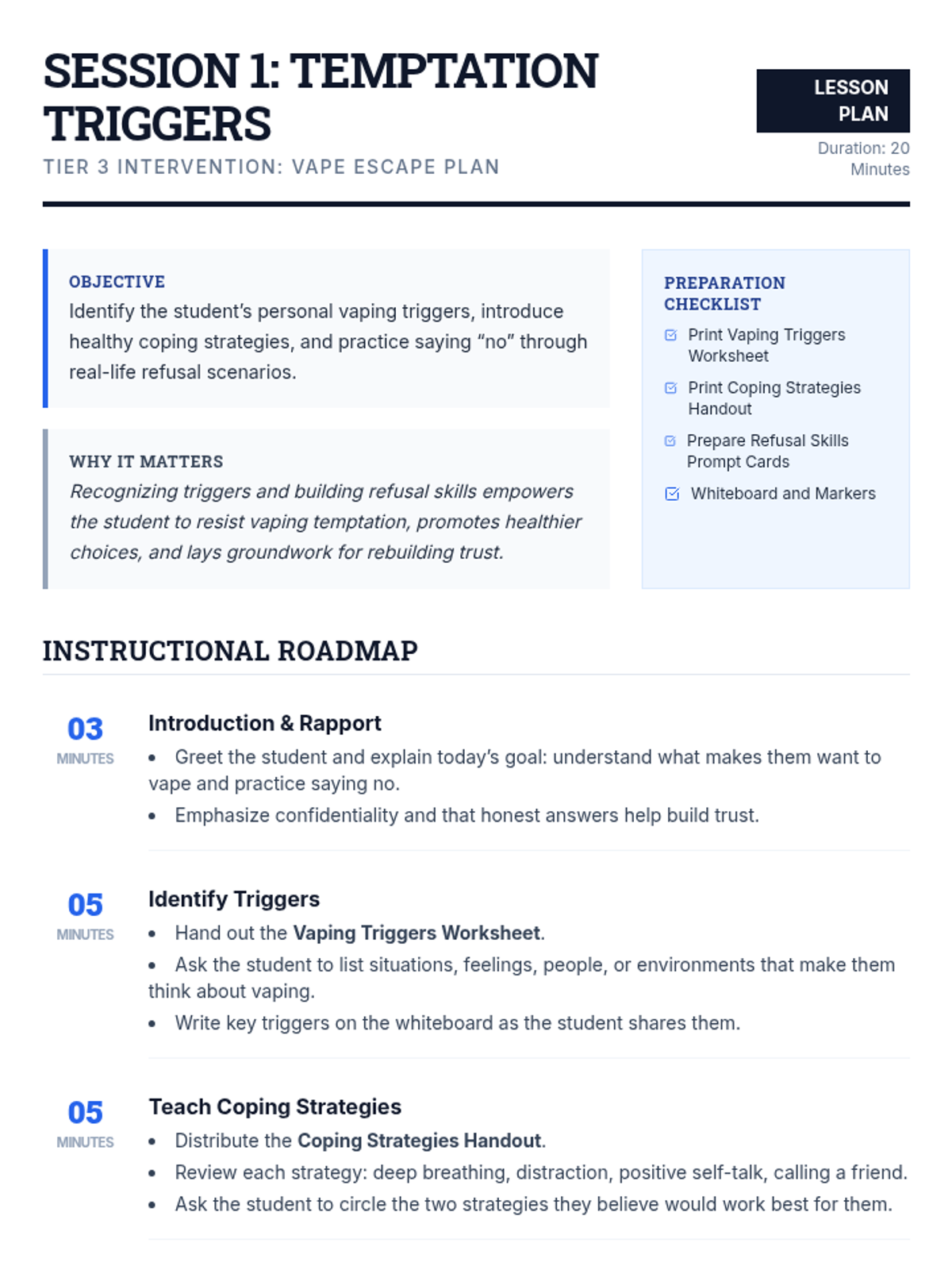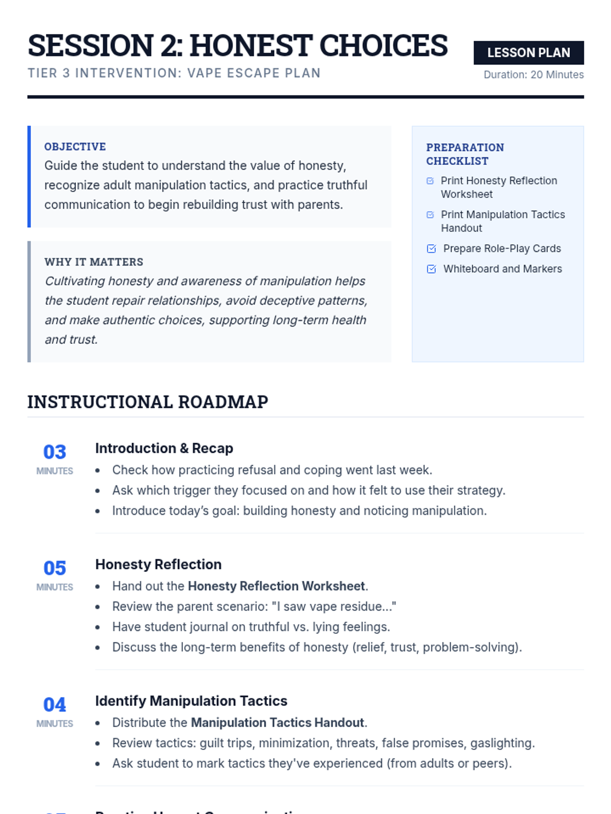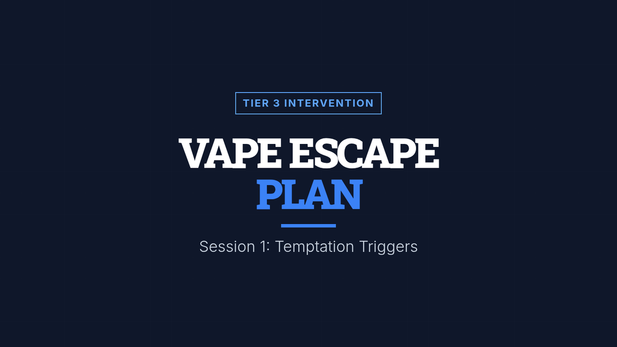 A two-session individualized intervention sequence for high school students returning from suspension. It focuses on identifying vaping triggers, developing refusal skills, recognizing manipulation, and rebuilding trust through honesty.