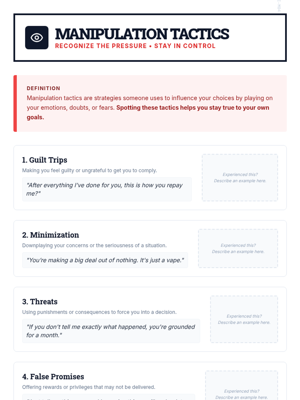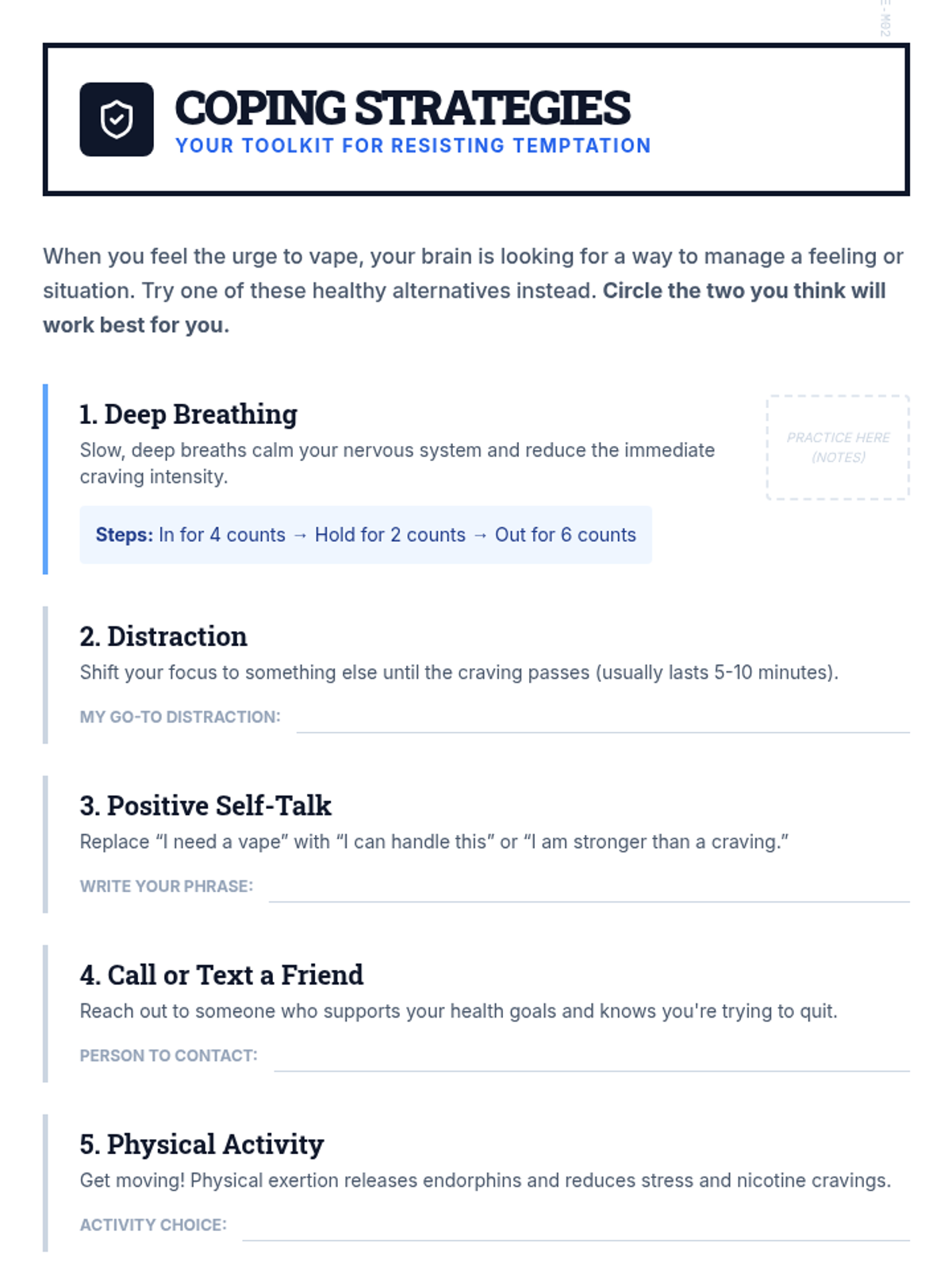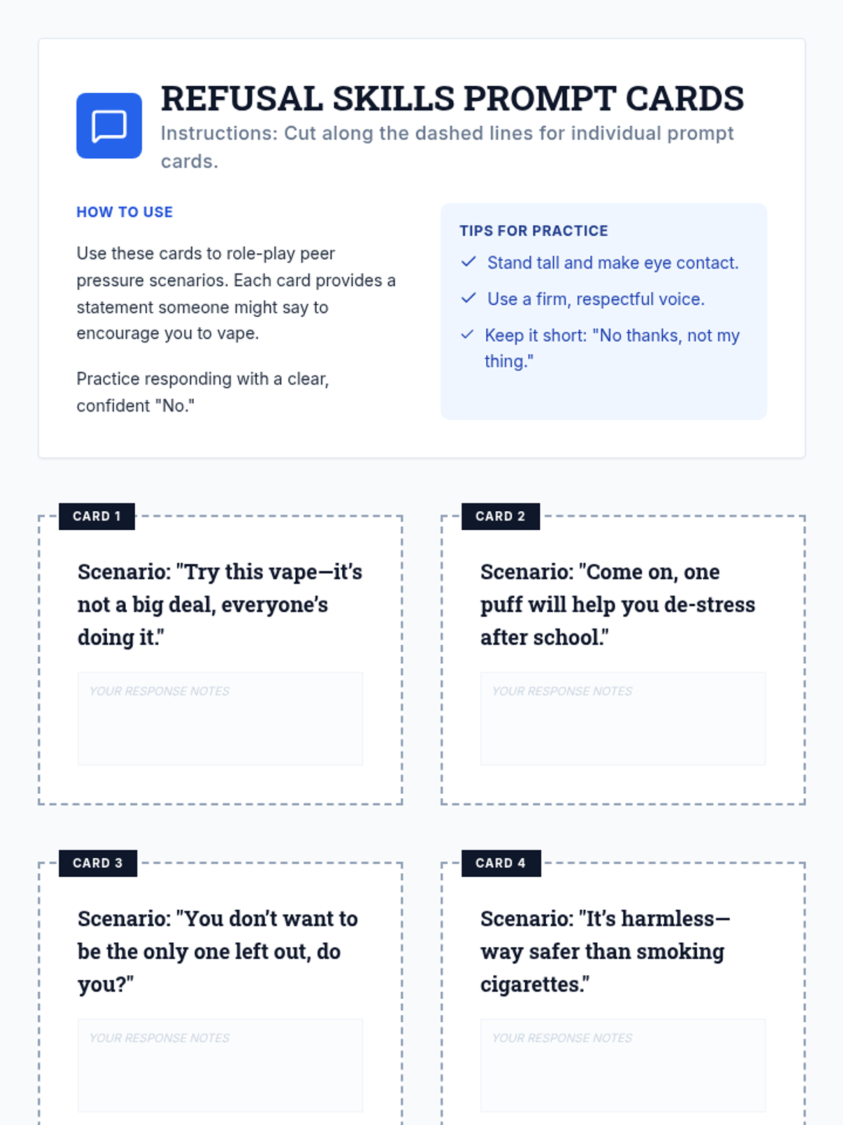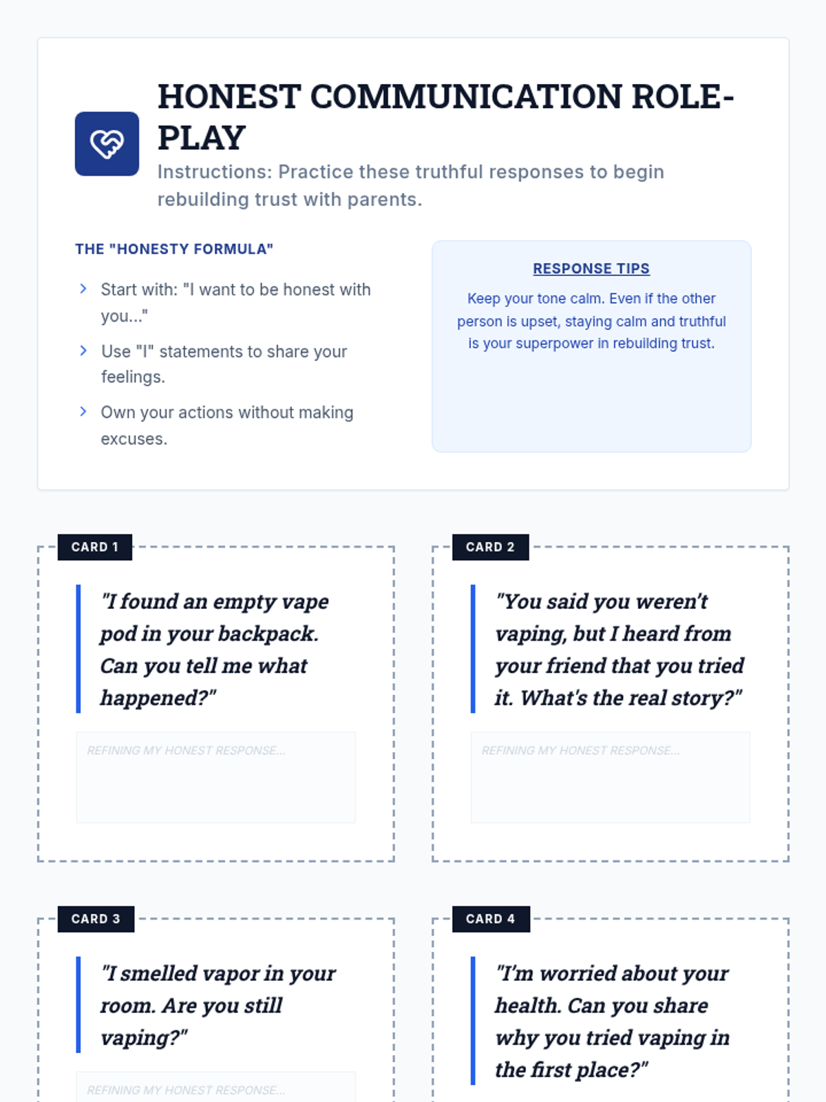 A two-session individualized intervention sequence for high school students returning from suspension. It focuses on identifying vaping triggers, developing refusal skills, recognizing manipulation, and rebuilding trust through honesty.