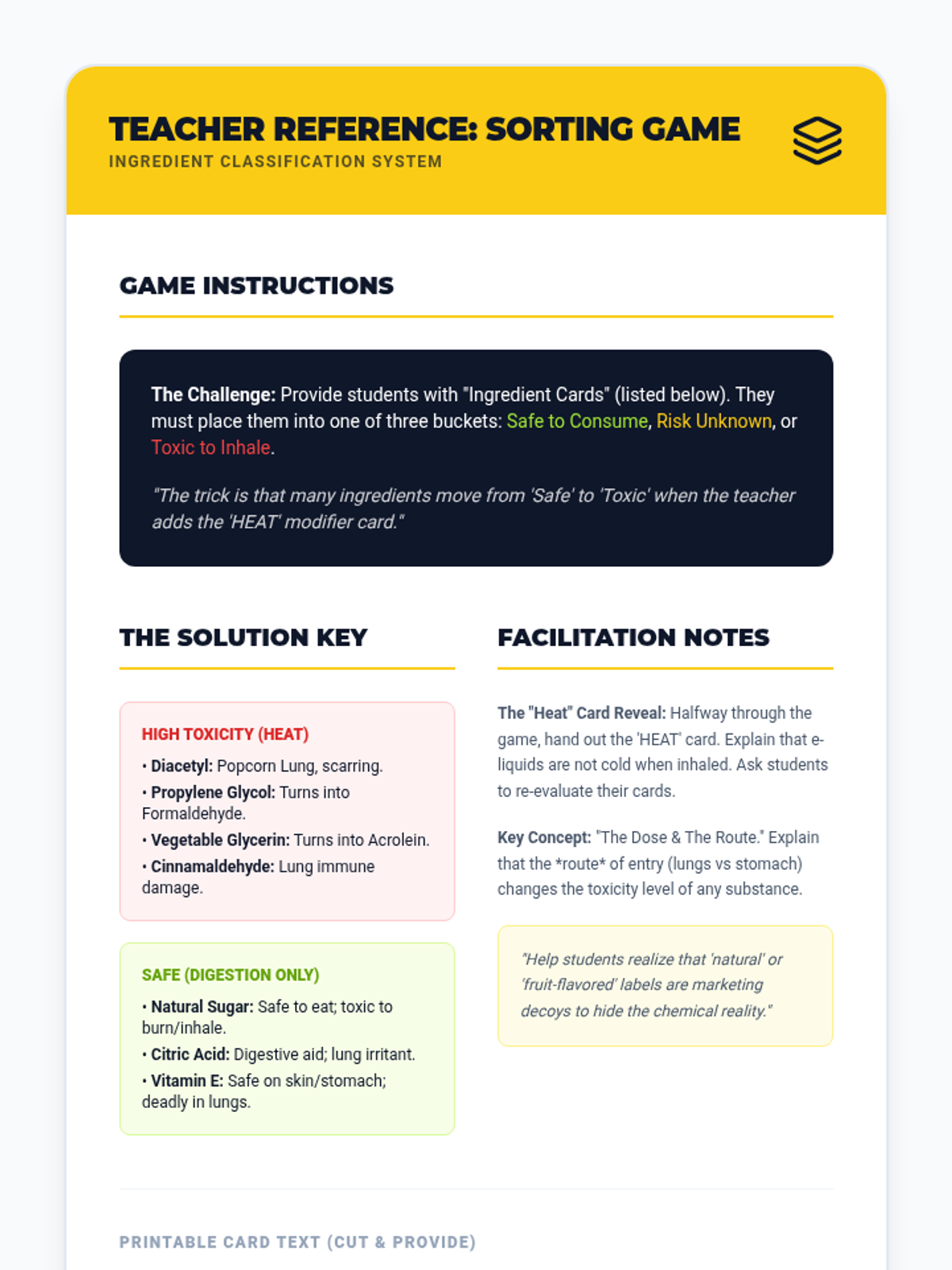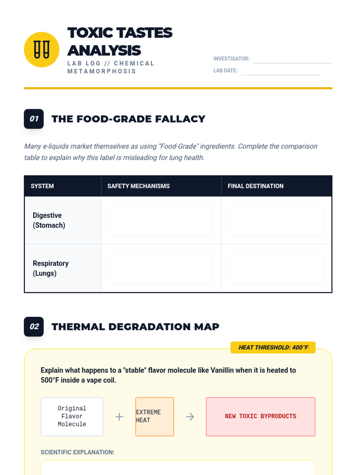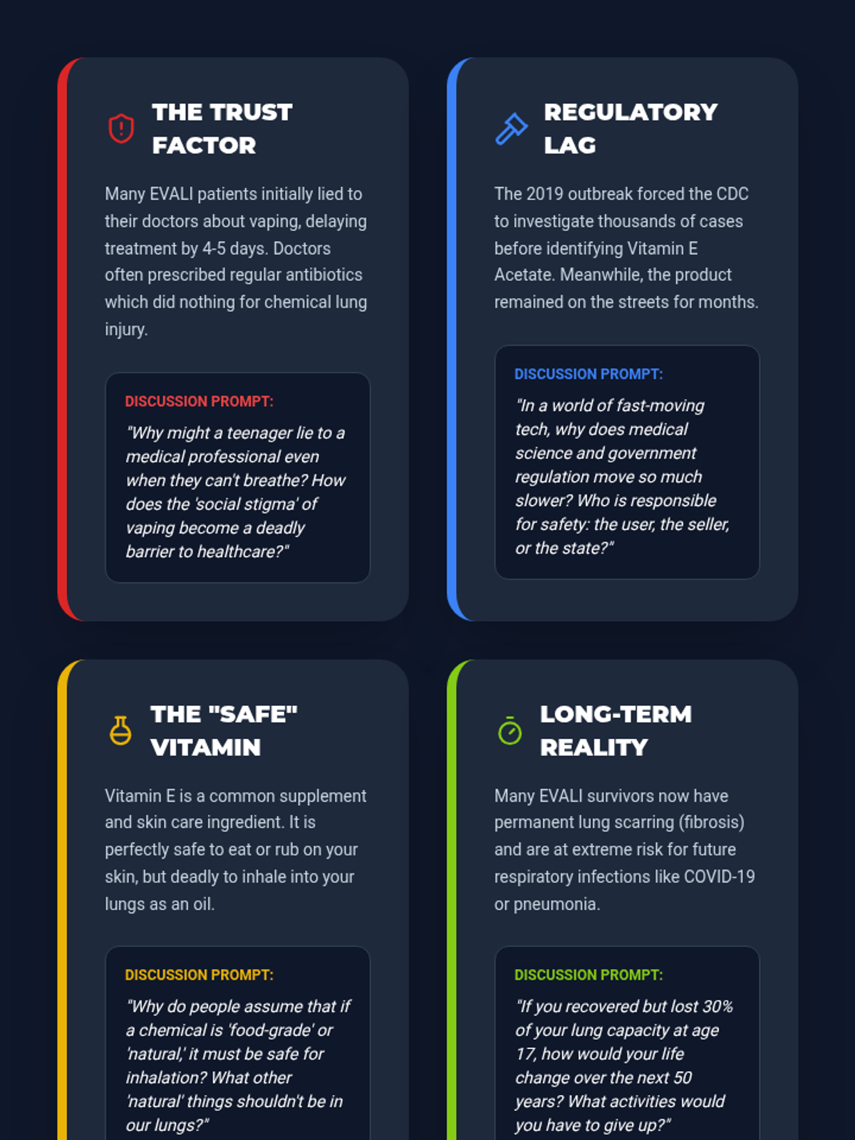 A comprehensive 9th-grade health sequence investigating the chemical, neurological, and physiological impacts of e-cigarettes and vaping. Students transition from deconstructing the physical nature of aerosols to analyzing complex medical case studies and regulatory challenges.