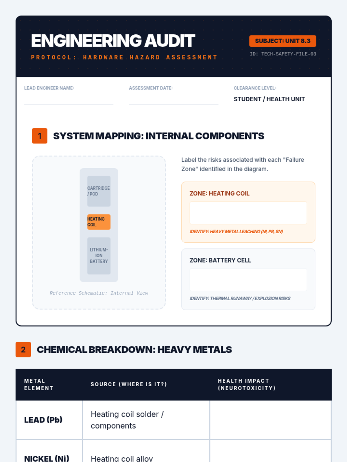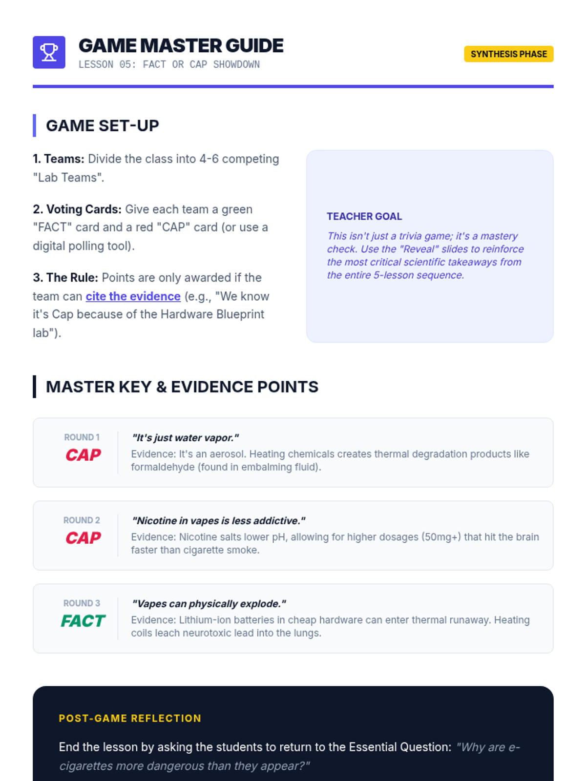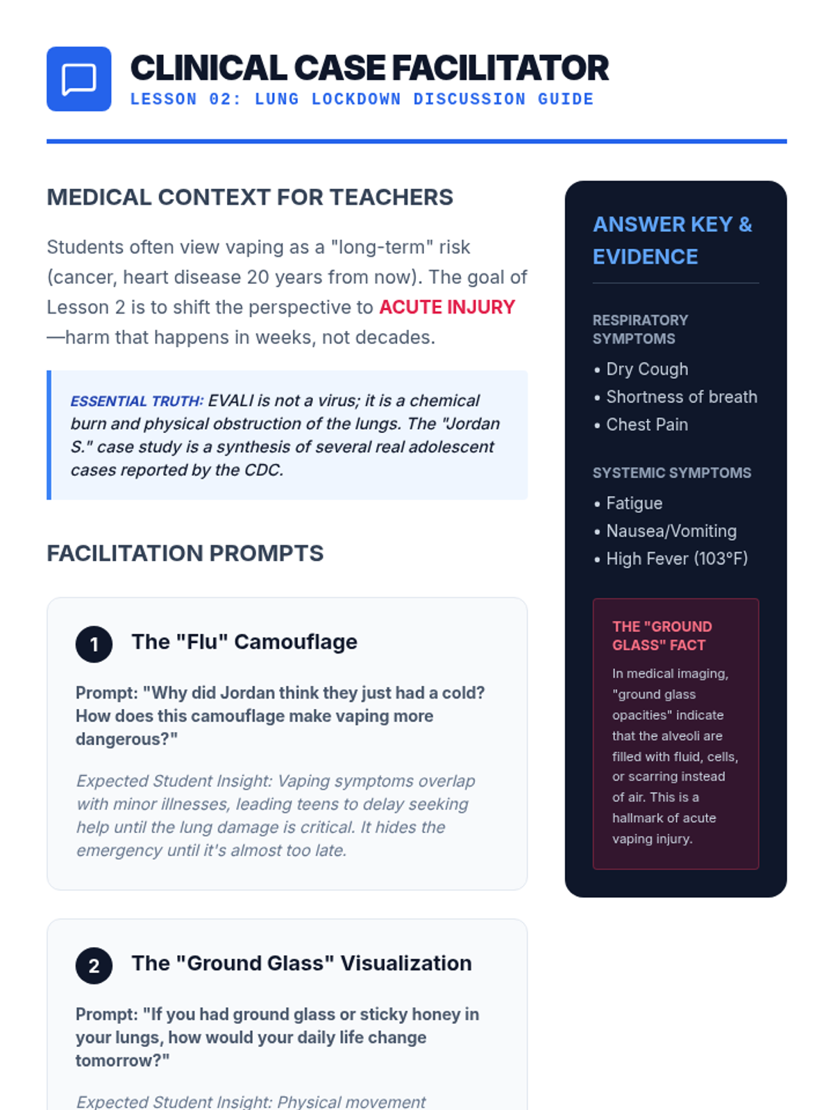 A comprehensive 8th-grade health sequence focused on the scientific realities and hidden dangers of vaping. Students explore the technical mechanics of e-cigarettes, medical consequences like EVALI, chemical concentrations of nicotine salts, and hardware safety risks to debunk common myths.