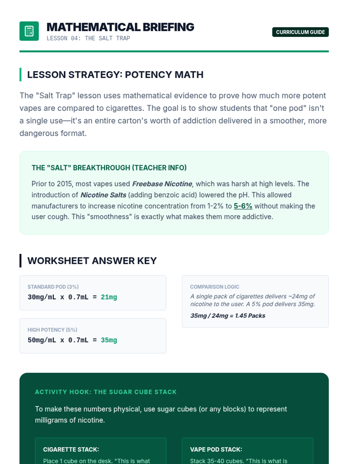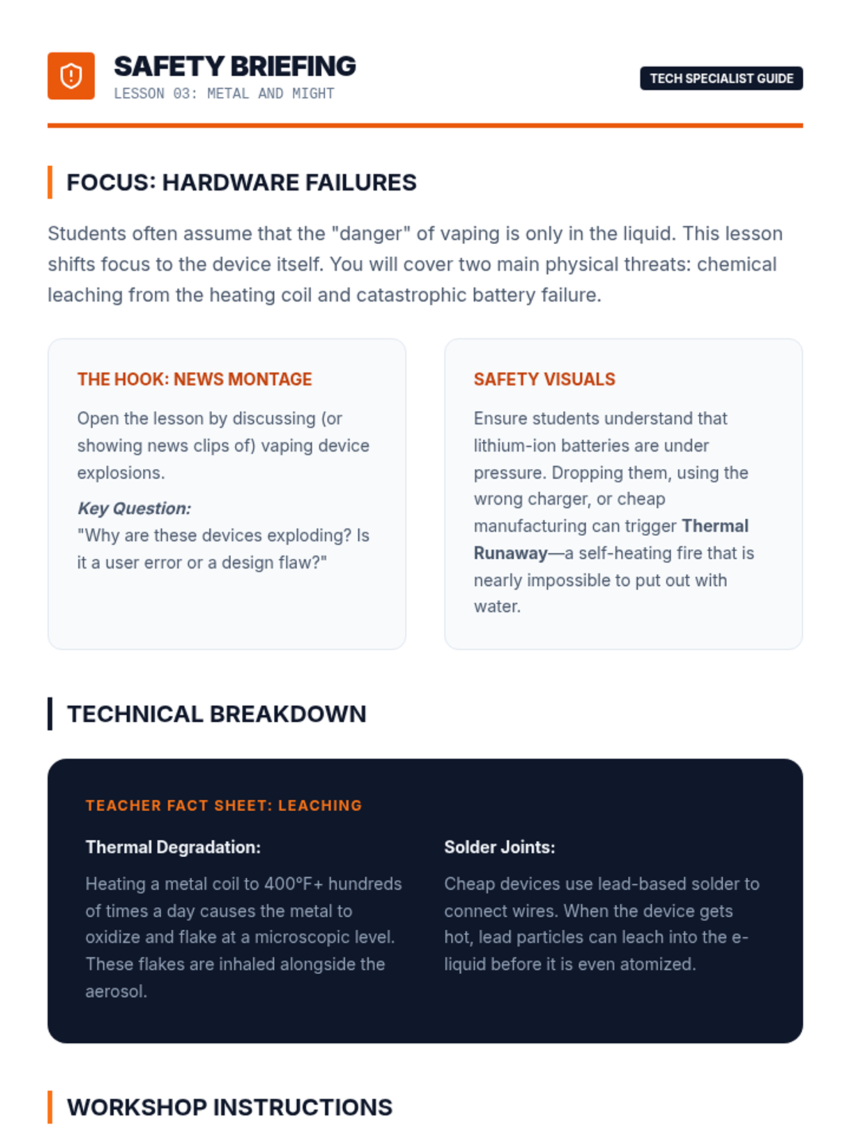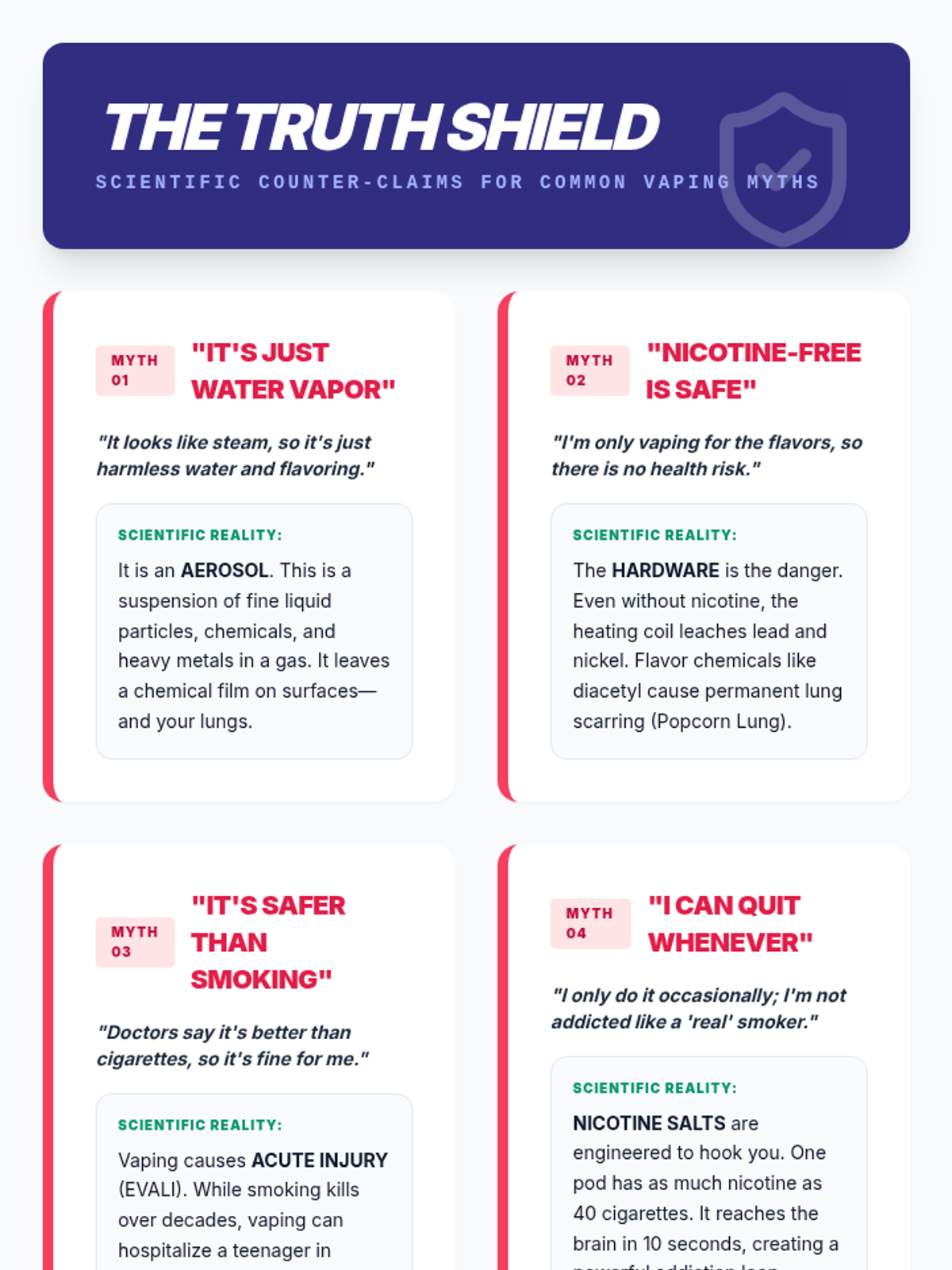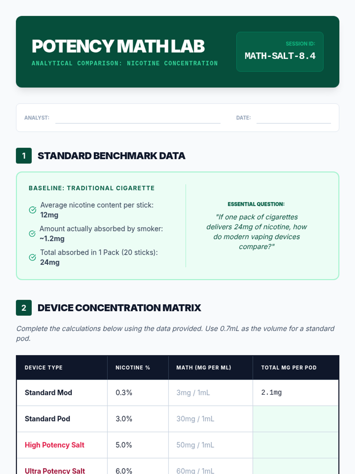 A comprehensive 8th-grade health sequence focused on the scientific realities and hidden dangers of vaping. Students explore the technical mechanics of e-cigarettes, medical consequences like EVALI, chemical concentrations of nicotine salts, and hardware safety risks to debunk common myths.